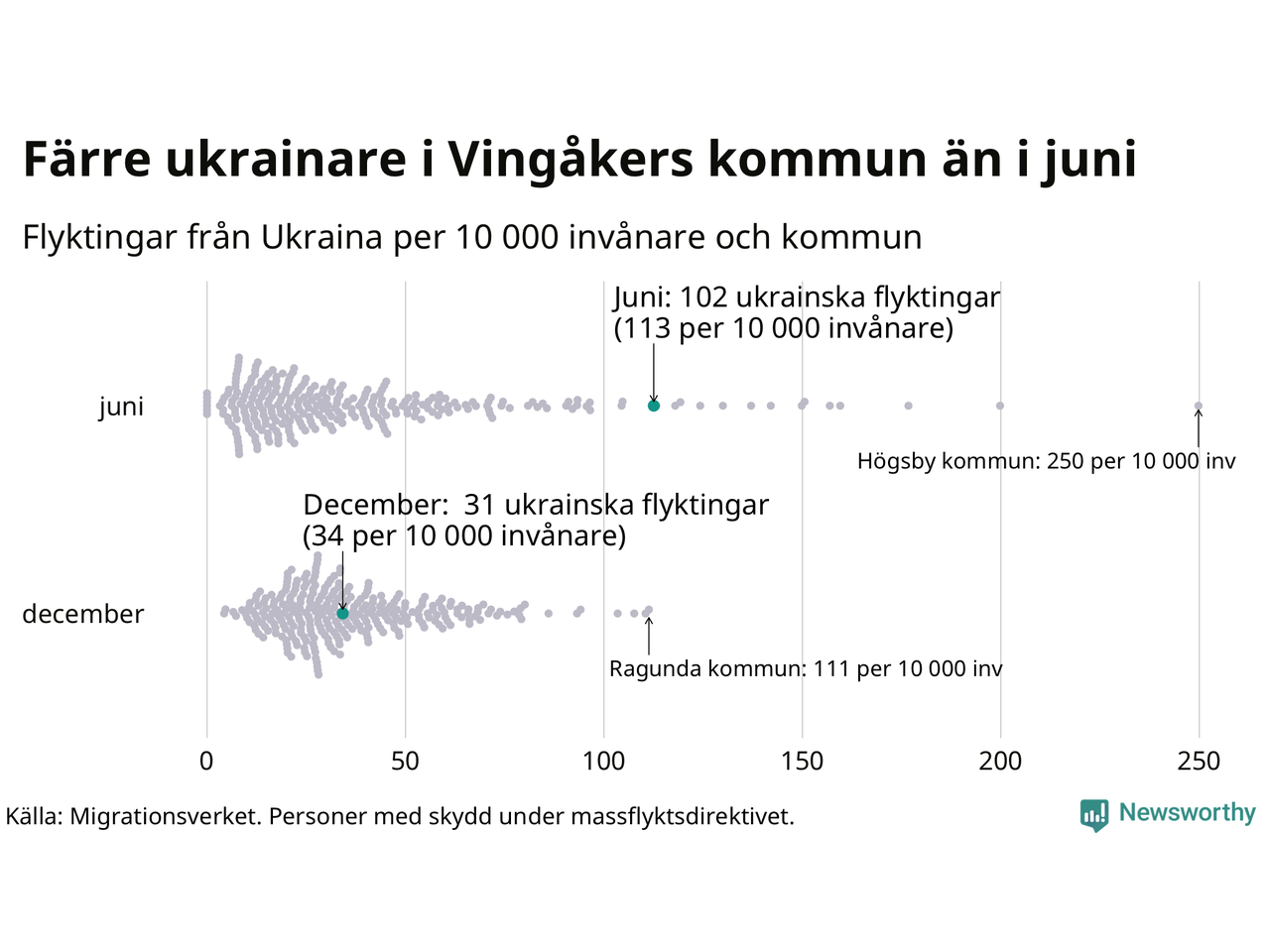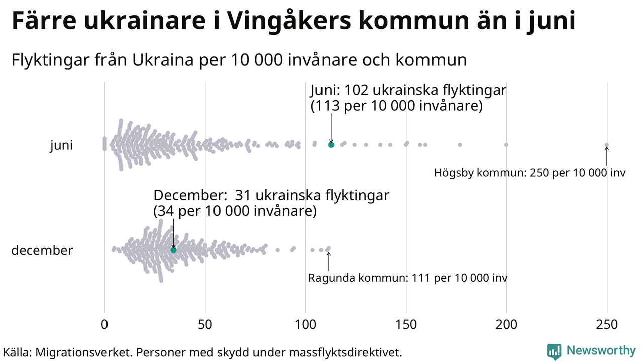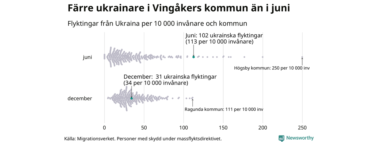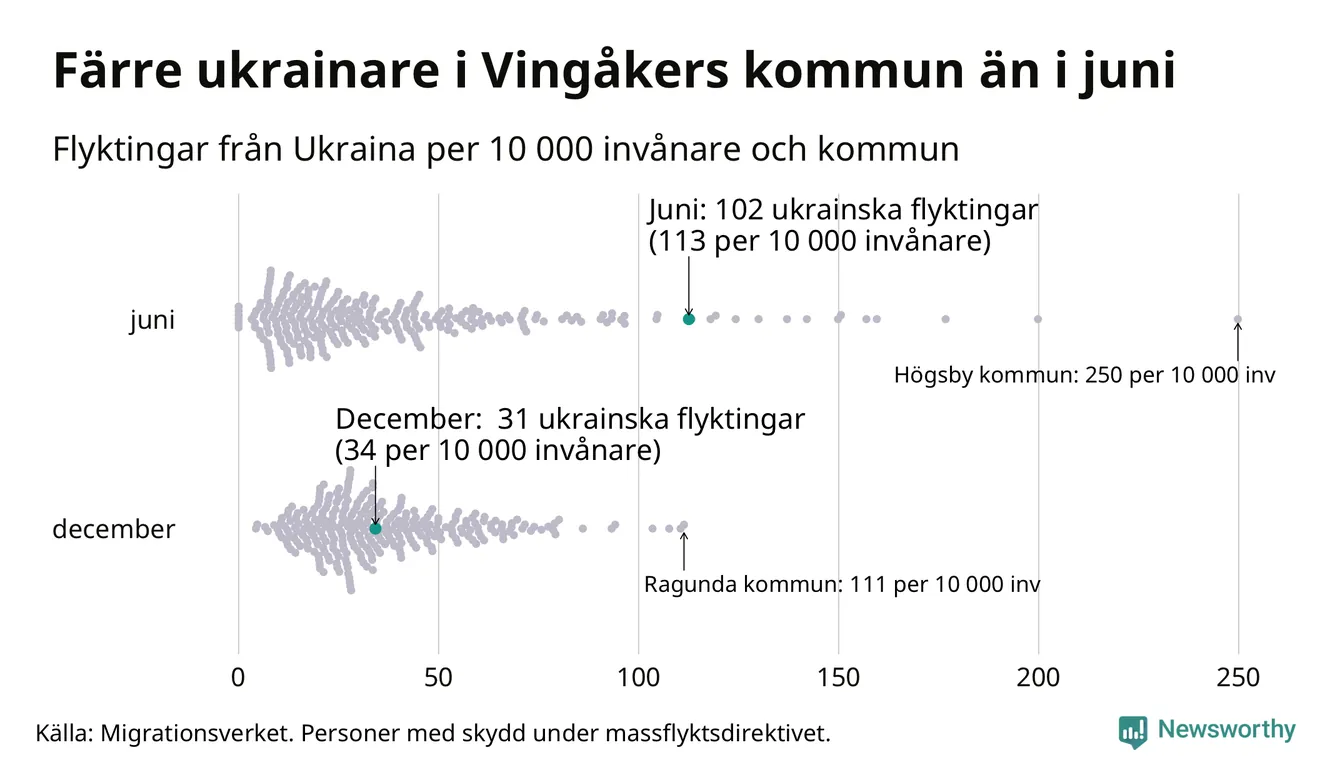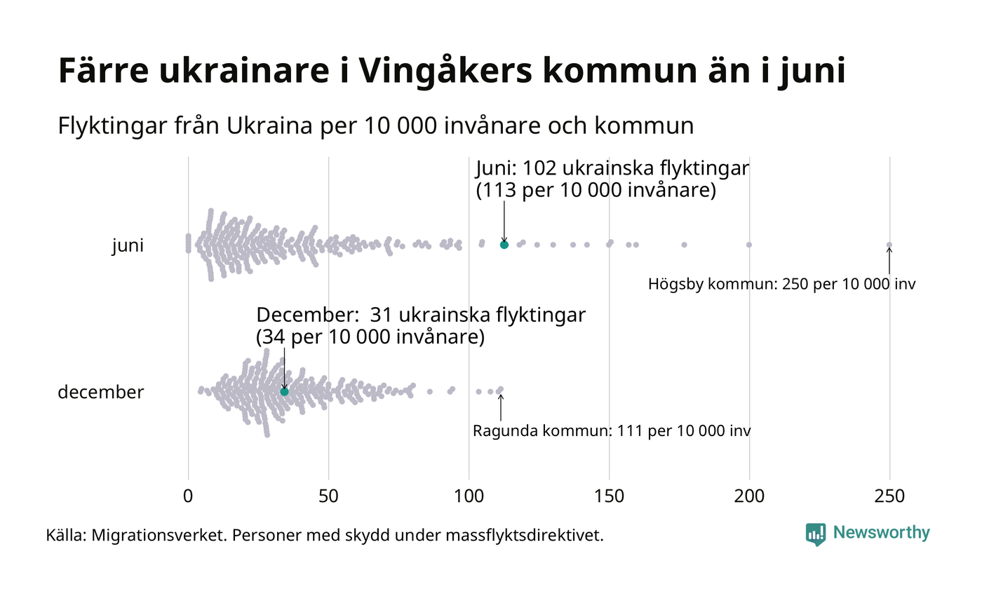 Av de 8 miljoner människor som flytt Ukraina sedan Rysslands invasion i februari har drygt 50 000 kommit till Sverige och i slutet av december fanns knappt 39 000 personer som hade skydd under massflyktsdirektivet i Migrationsverkets system. Och av dem fanns 31 i Vingåker. Det är 71 färre än i slutet av juni.