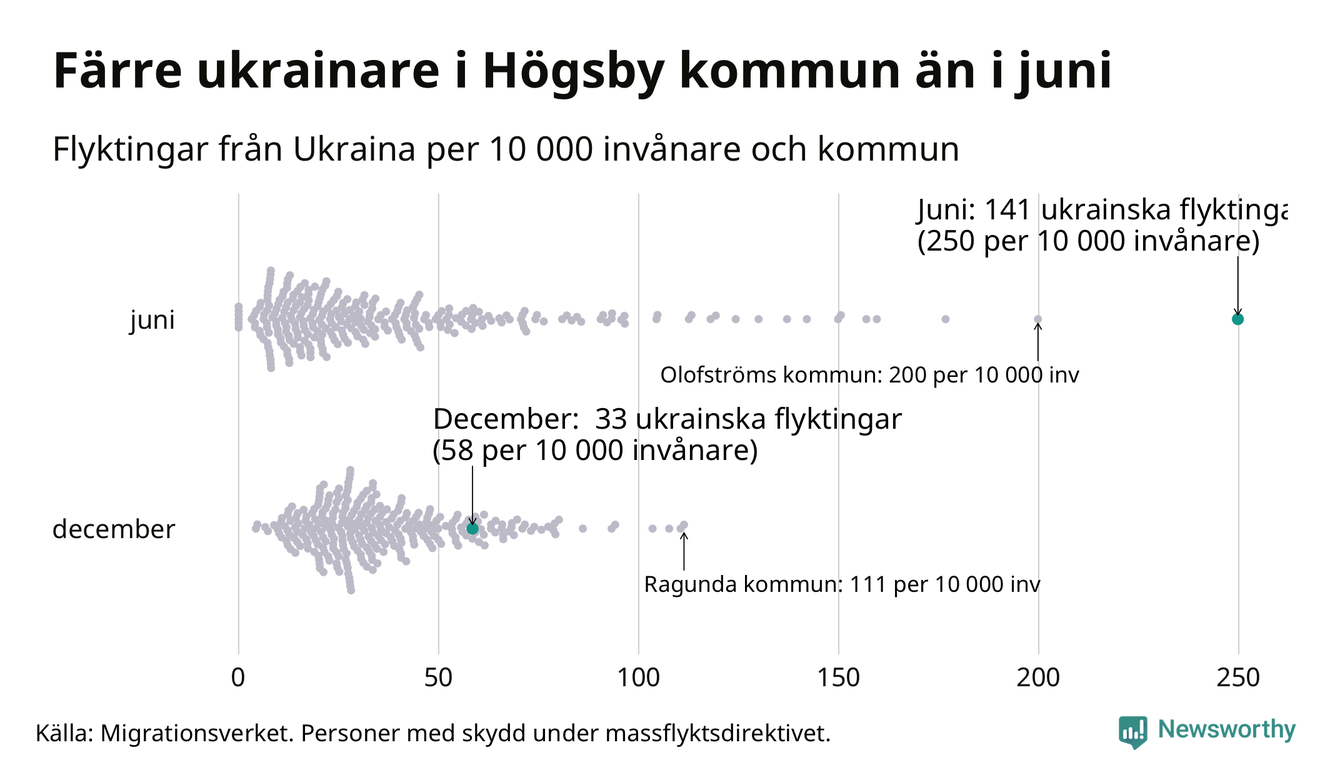Av de 8 miljoner människor som flytt Ukraina sedan Rysslands invasion i februari har drygt 50 000 kommit till Sverige och i slutet av december fanns knappt 39 000 personer som hade skydd under massflyktsdirektivet i Migrationsverkets system. Och av dem fanns 33 i Högsby. Det är 108 färre än i slutet av juni.