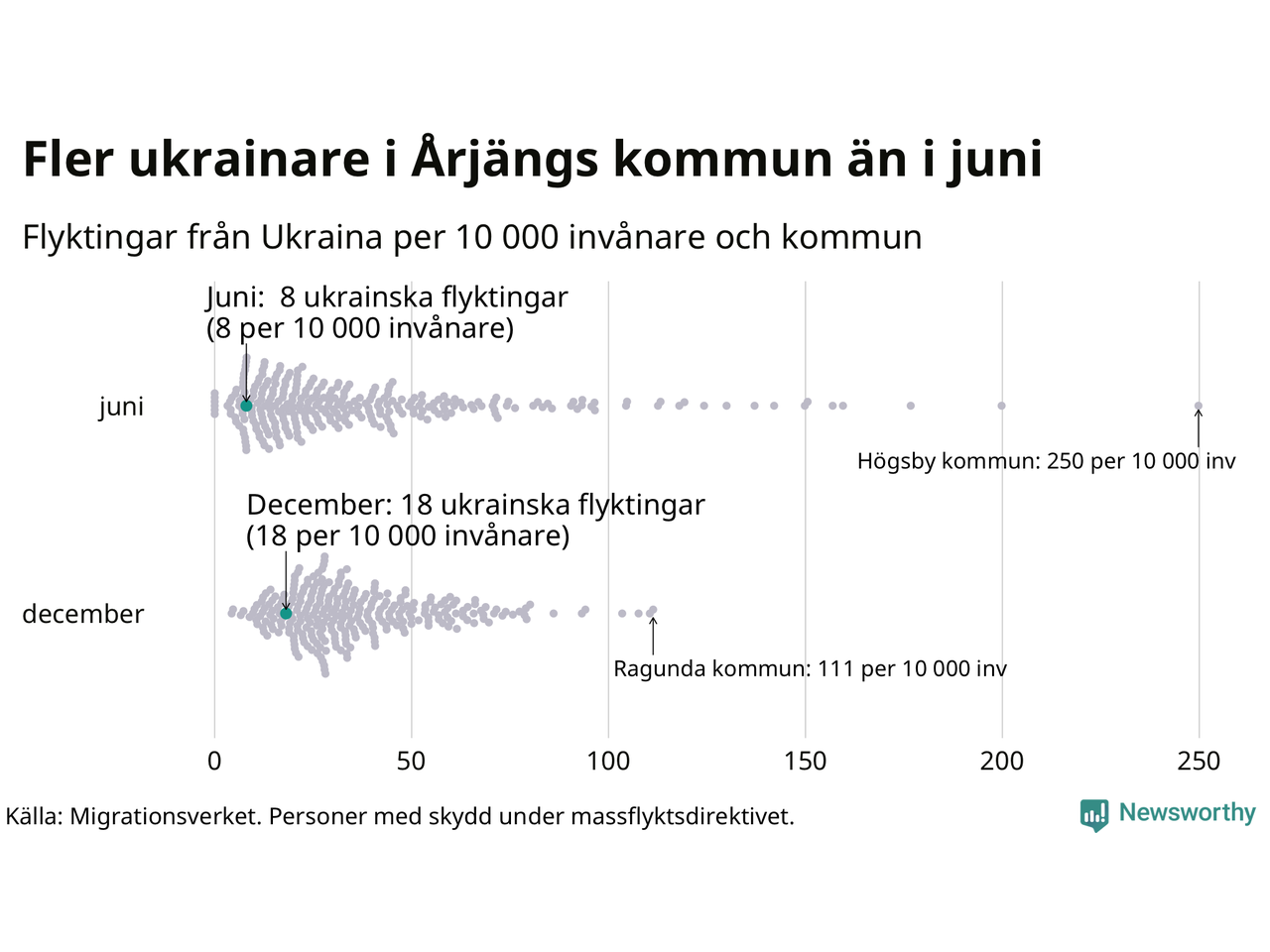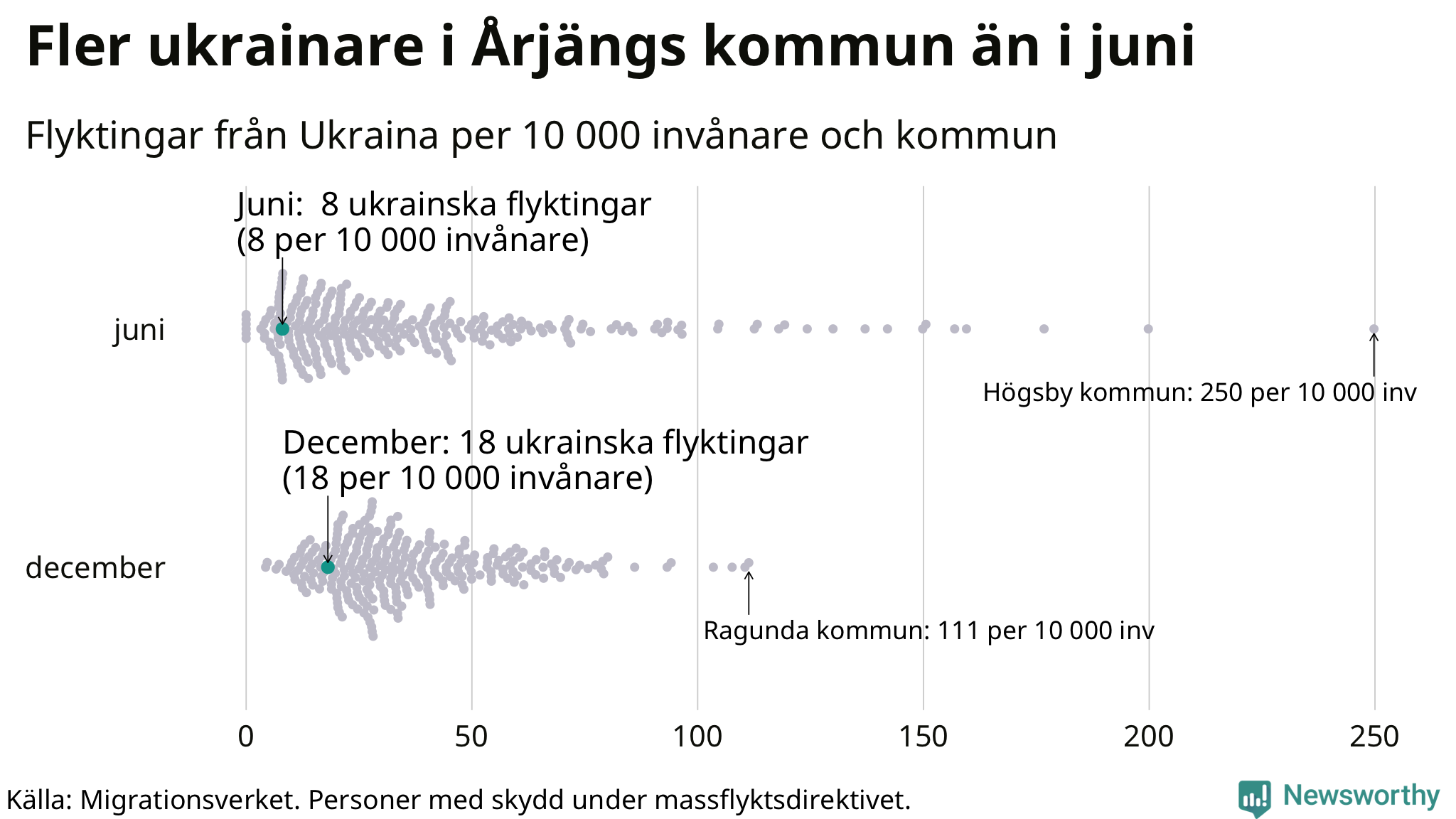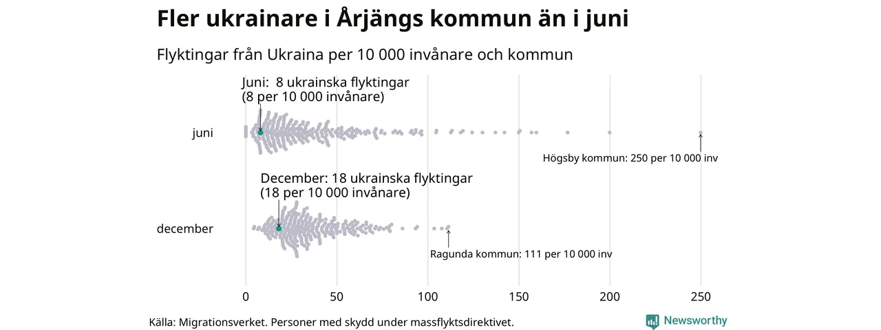 Varje punkt representerar en kommun och placeringen på X-axeln representerar hur många ukrainska flyktingar som fanns per invånare i kommunen i slutet på juni samt slutet på december 2022.