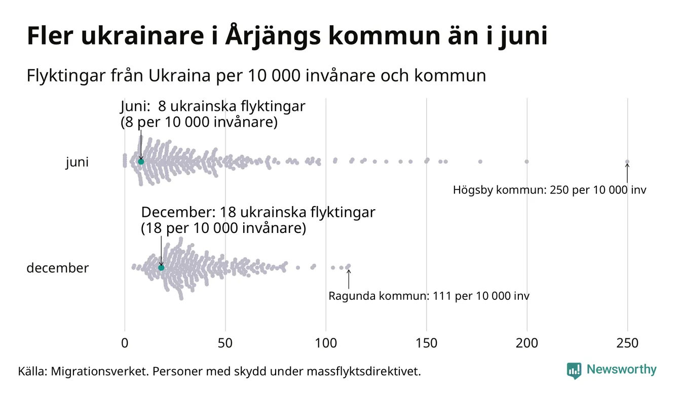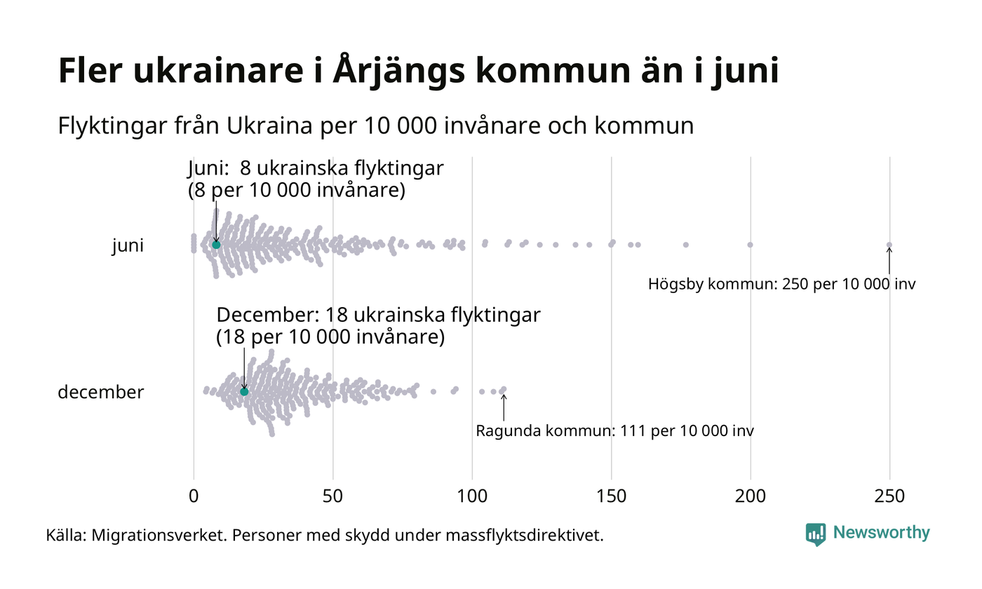 Av de 8 miljoner människor som flytt Ukraina sedan Rysslands invasion i februari har drygt 50 000 kommit till Sverige och i slutet av december fanns knappt 39 000 personer som hade skydd under massflyktsdirektivet i Migrationsverkets system. Och av dem fanns 18 i Årjäng. Det är tio fler än i slutet av juni.