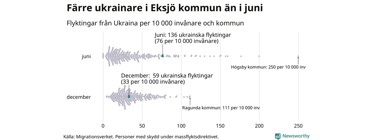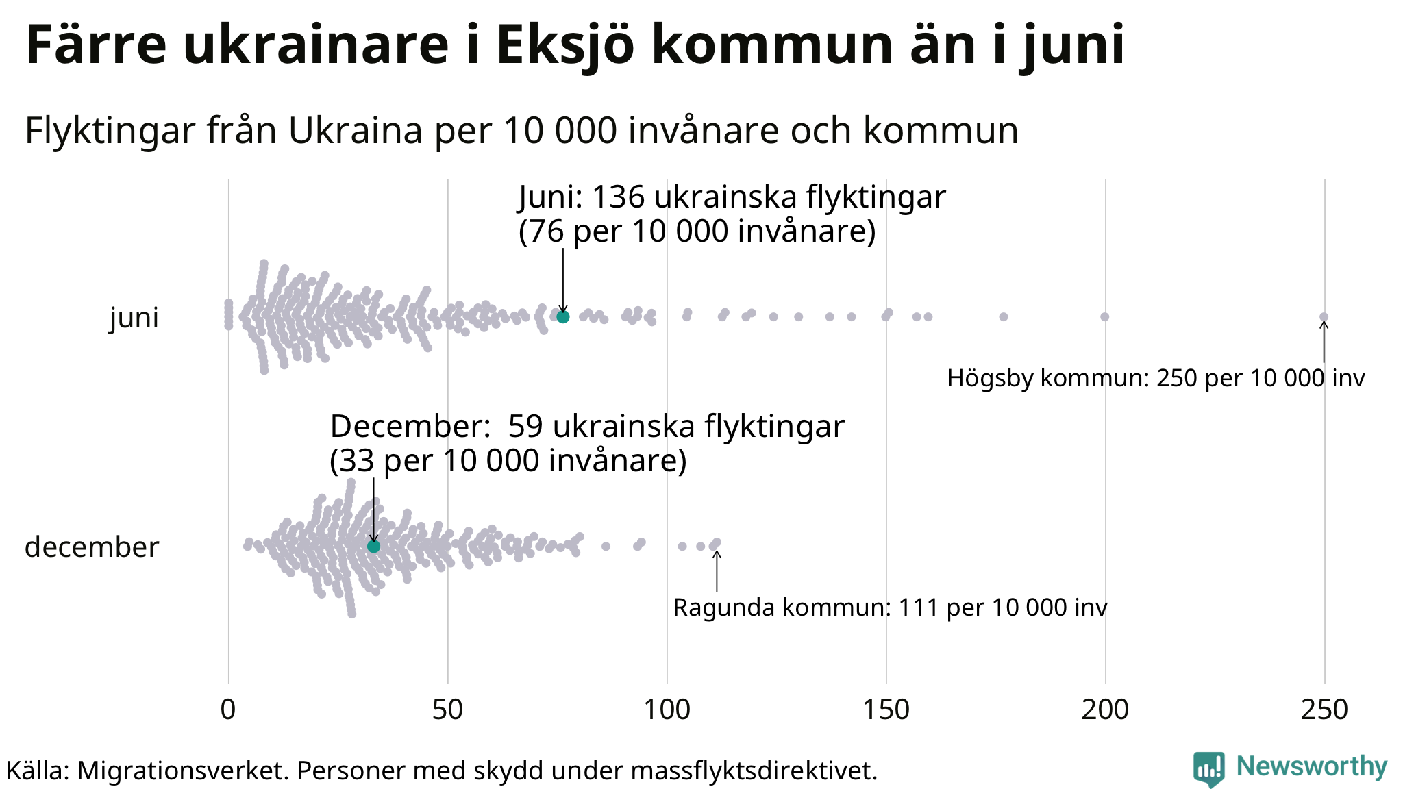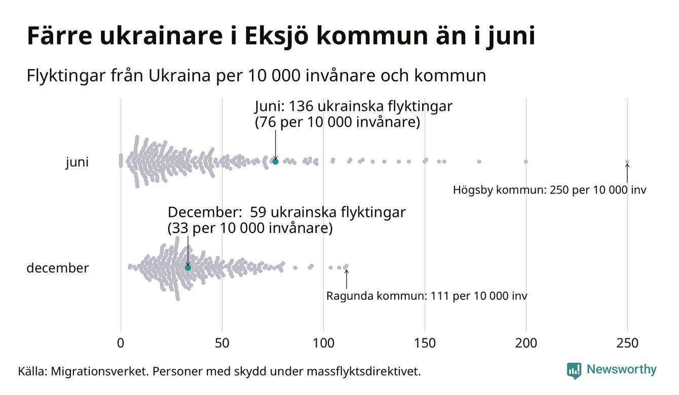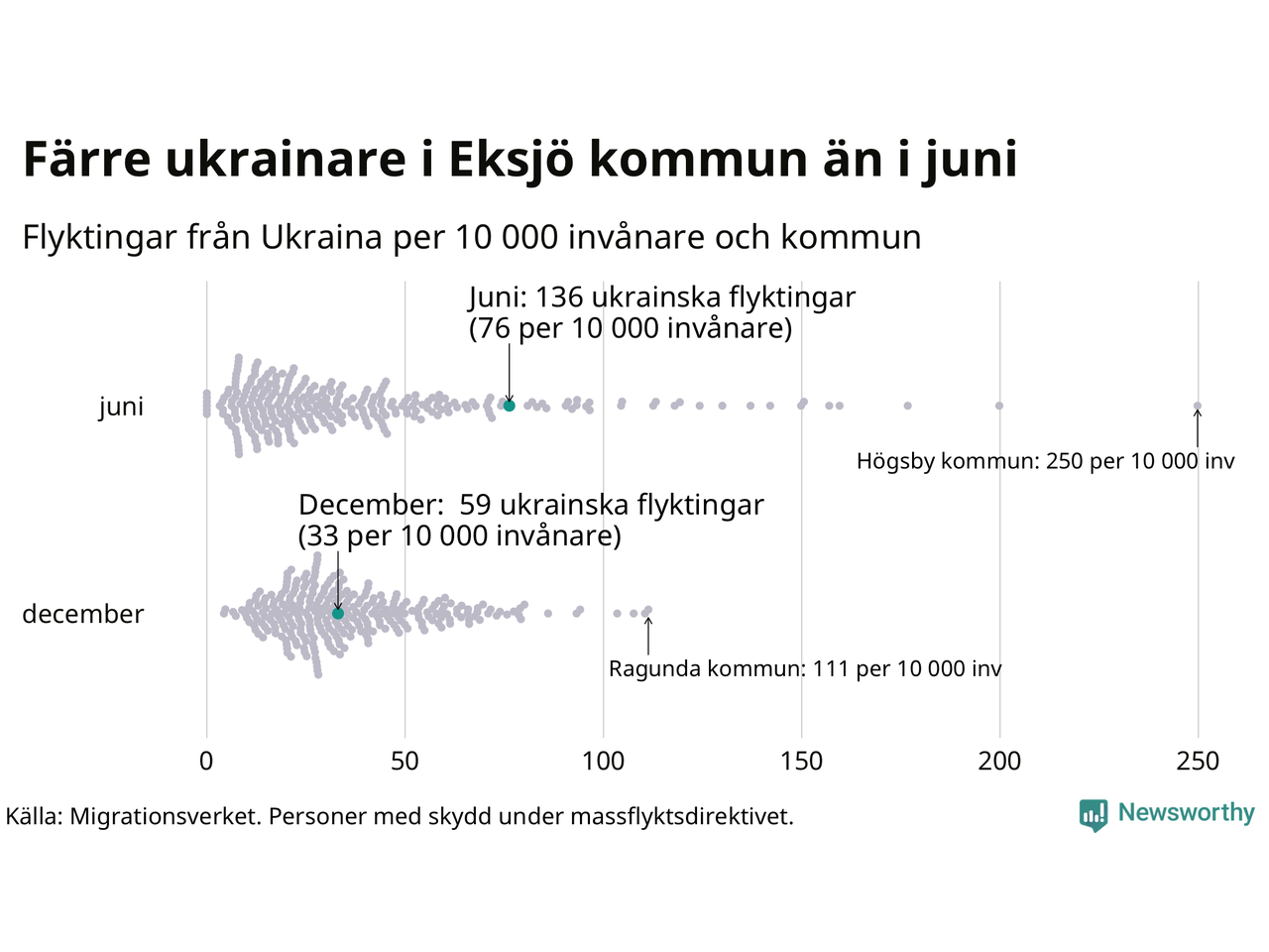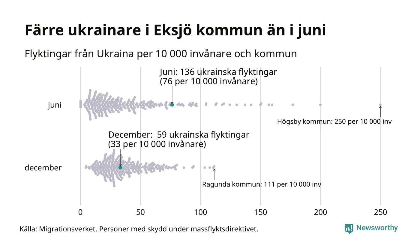 Av de 8 miljoner människor som flytt Ukraina sedan Rysslands invasion i februari har drygt 50 000 kommit till Sverige och i slutet av december fanns knappt 39 000 personer som hade skydd under massflyktsdirektivet i Migrationsverkets system. Och av dem fanns 59 i Eksjö. Det är 77 färre än i slutet av juni.