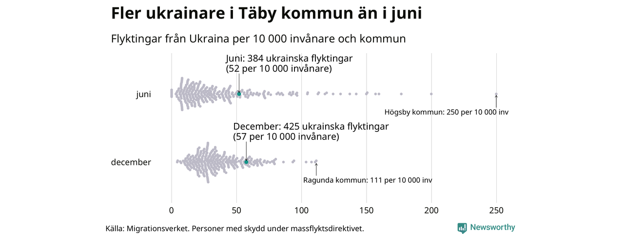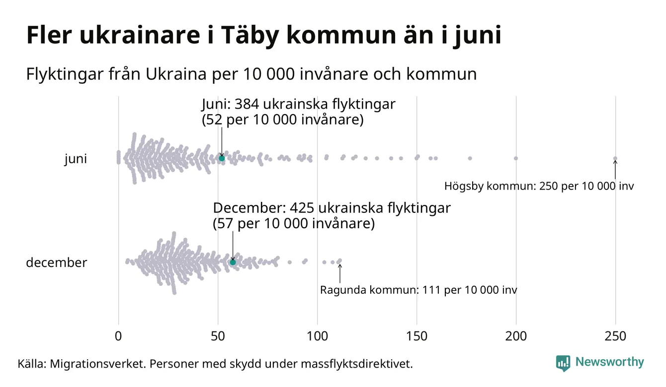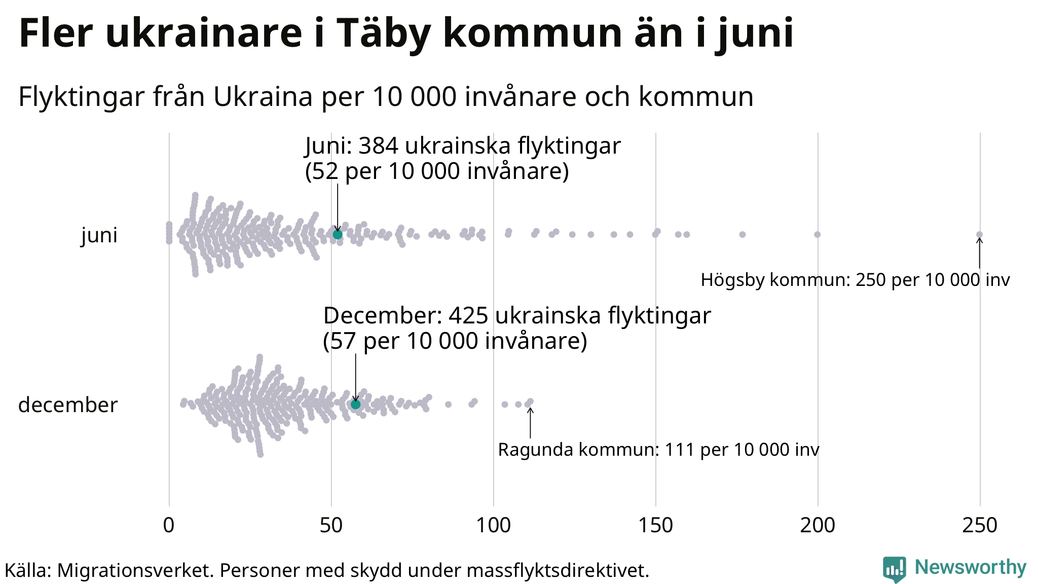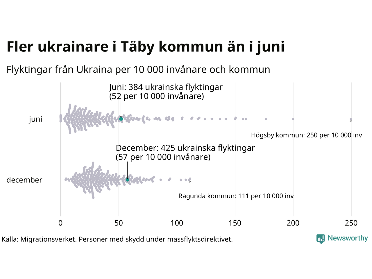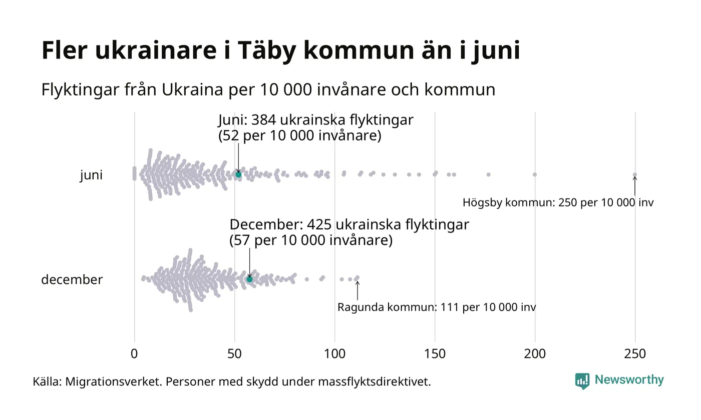 Av de 8 miljoner människor som flytt Ukraina sedan Rysslands invasion i februari har drygt 50 000 kommit till Sverige och i slutet av december fanns knappt 39 000 personer som hade skydd under massflyktsdirektivet i Migrationsverkets system. Och av dem fanns 425 i Täby. Det är 41 fler än i slutet av juni.