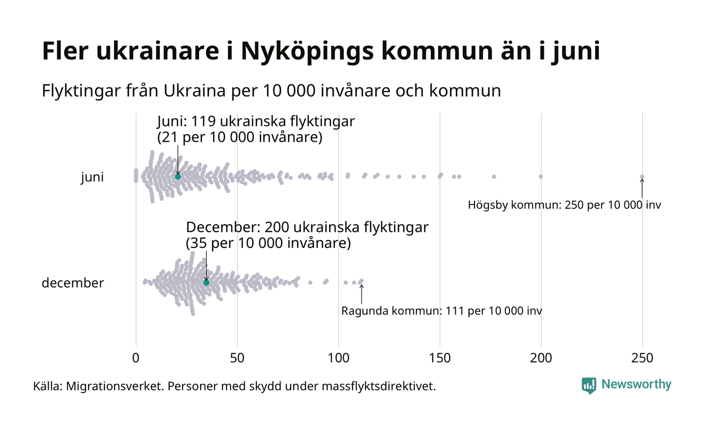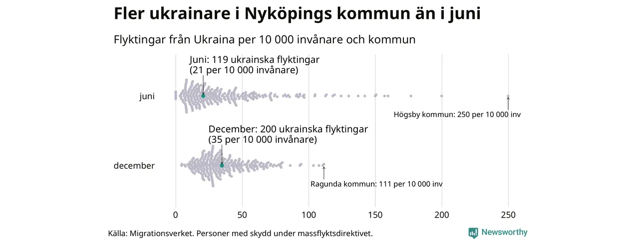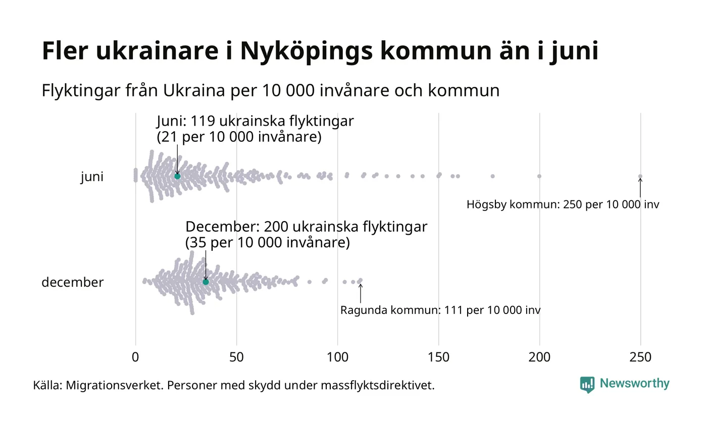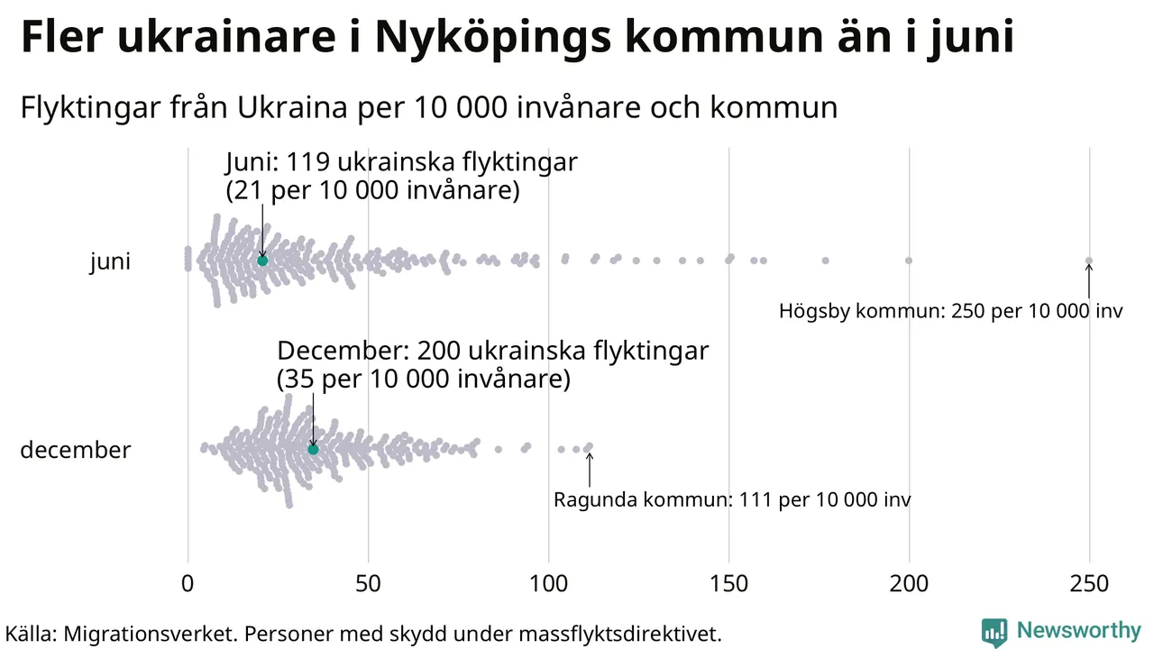 Av de 8 miljoner människor som flytt Ukraina sedan Rysslands invasion i februari har drygt 50 000 kommit till Sverige och i slutet av december fanns knappt 39 000 personer som hade skydd under massflyktsdirektivet i Migrationsverkets system. Och av dem fanns 200 i Nyköping. Det är 81 fler än i slutet av juni.
