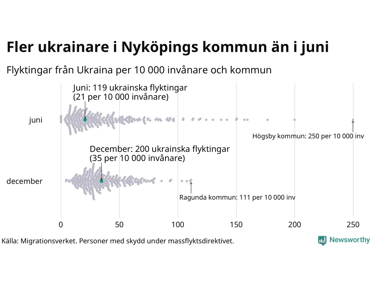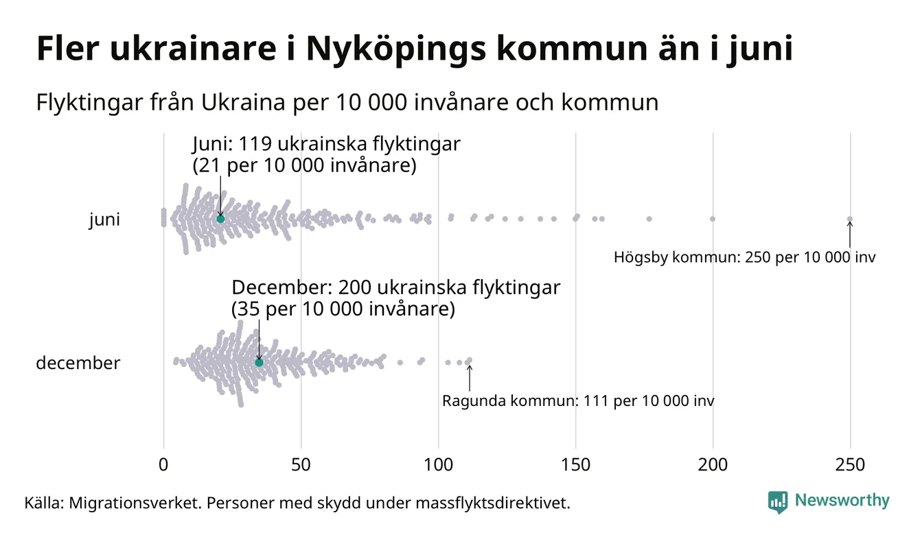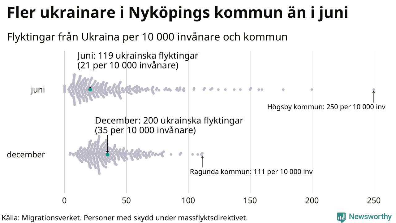 Av de 8 miljoner människor som flytt Ukraina sedan Rysslands invasion i februari har drygt 50 000 kommit till Sverige och i slutet av december fanns knappt 39 000 personer som hade skydd under massflyktsdirektivet i Migrationsverkets system. Och av dem fanns 200 i Nyköping. Det är 81 fler än i slutet av juni.
