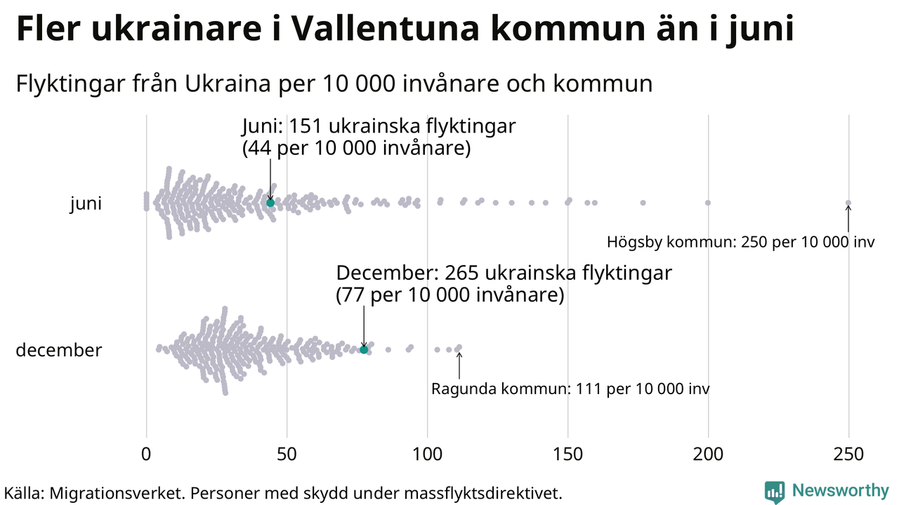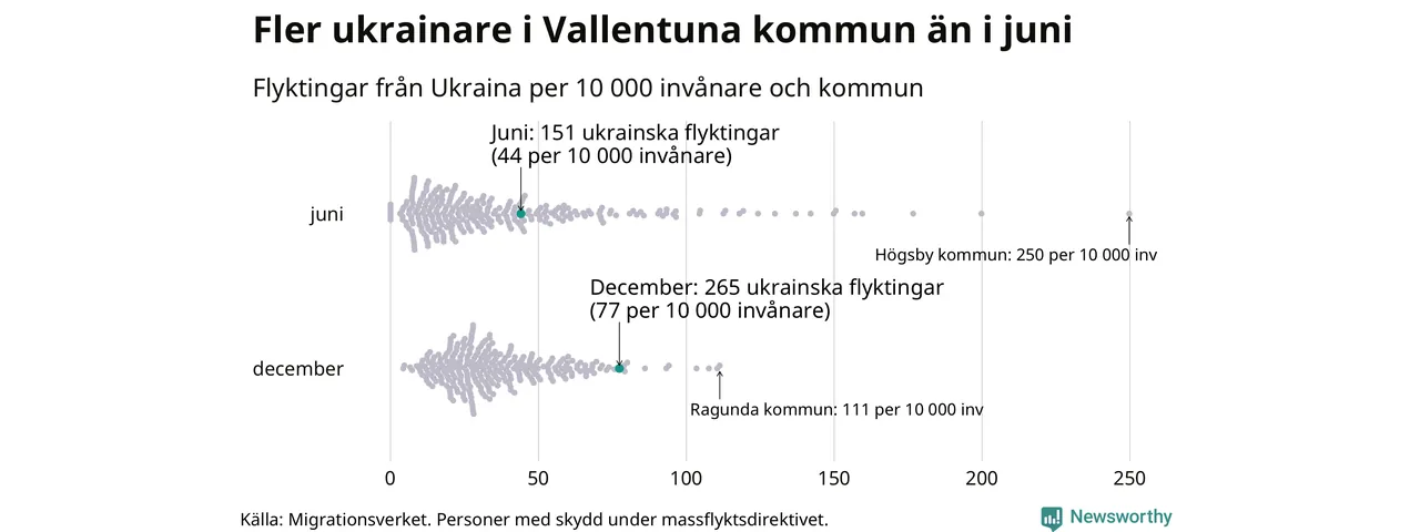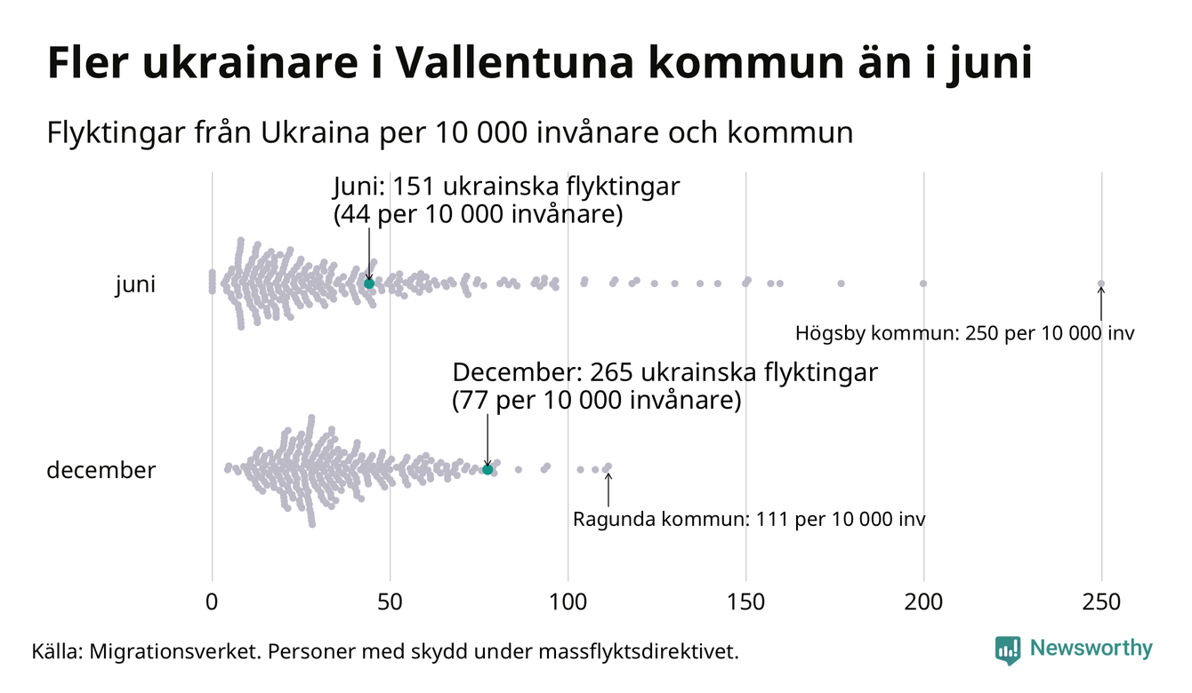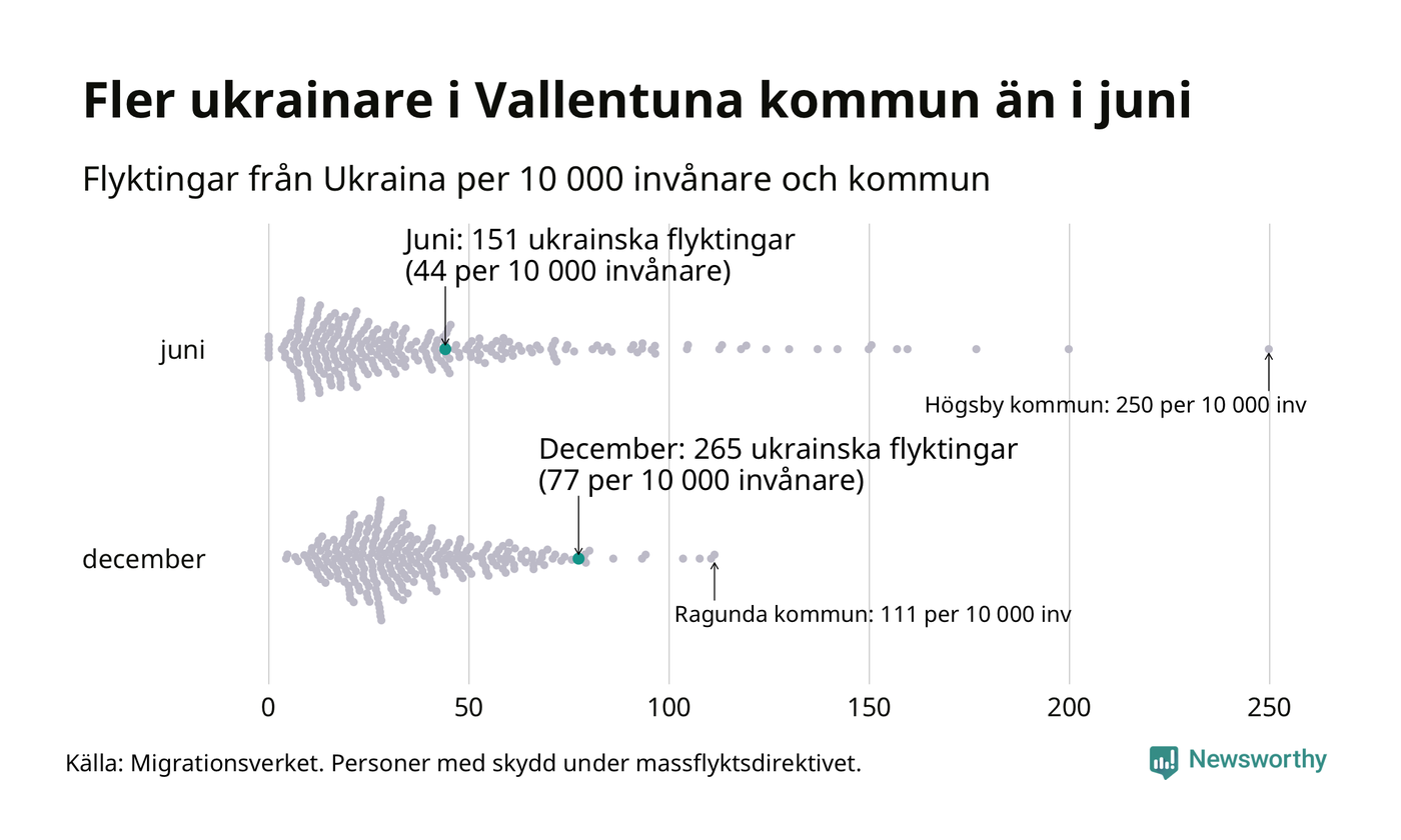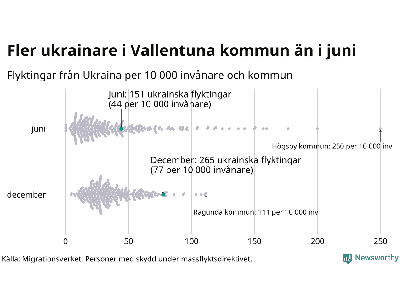 Av de 8 miljoner människor som flytt Ukraina sedan Rysslands invasion i februari har drygt 50 000 kommit till Sverige och i slutet av december fanns knappt 39 000 personer som hade skydd under massflyktsdirektivet i Migrationsverkets system. Och av dem fanns 265 i Vallentuna. Det är 114 fler än i slutet av juni.