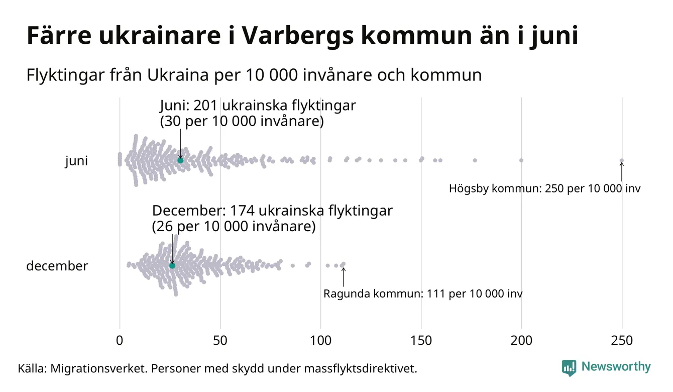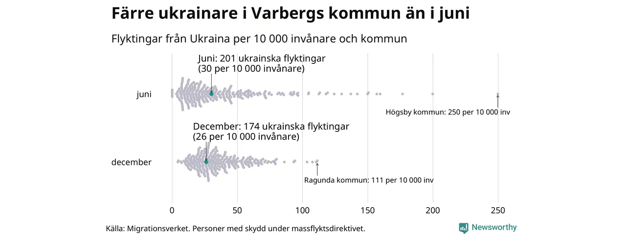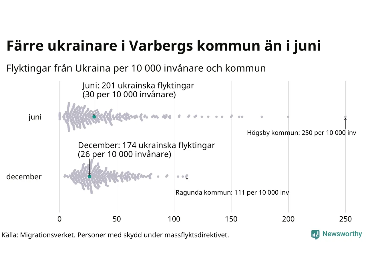 Av de 8 miljoner människor som flytt Ukraina sedan Rysslands invasion i februari har drygt 50 000 kommit till Sverige och i slutet av december fanns knappt 39 000 personer som hade skydd under massflyktsdirektivet i Migrationsverkets system. Och av dem fanns 174 i Varberg. Det är 27 färre än i slutet av juni.