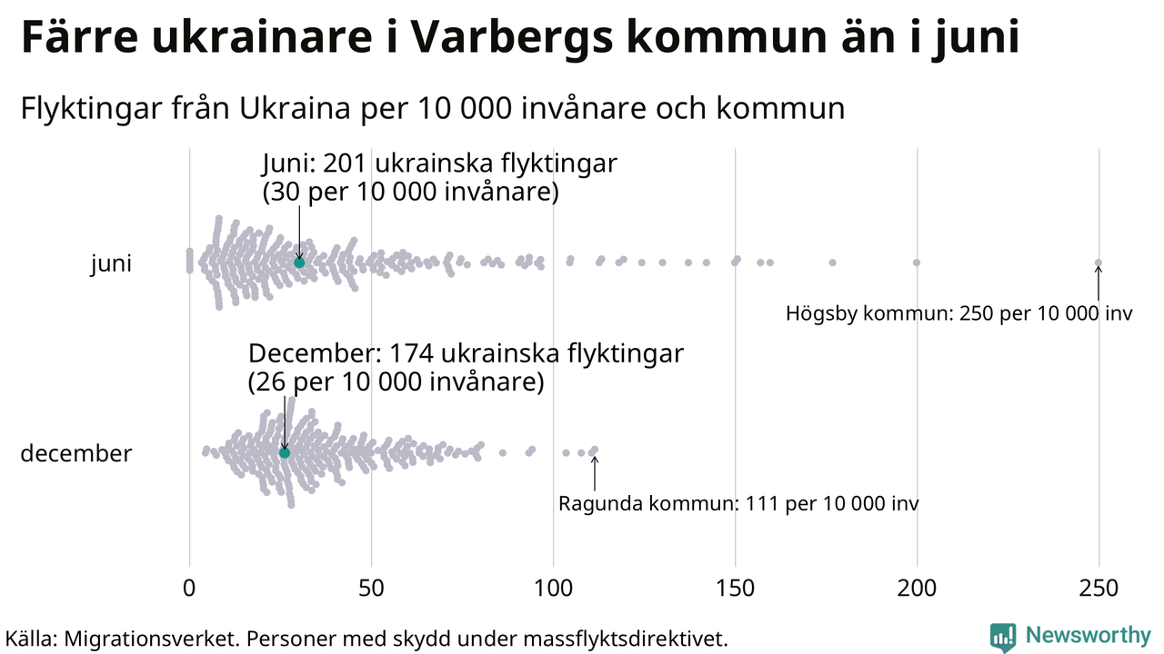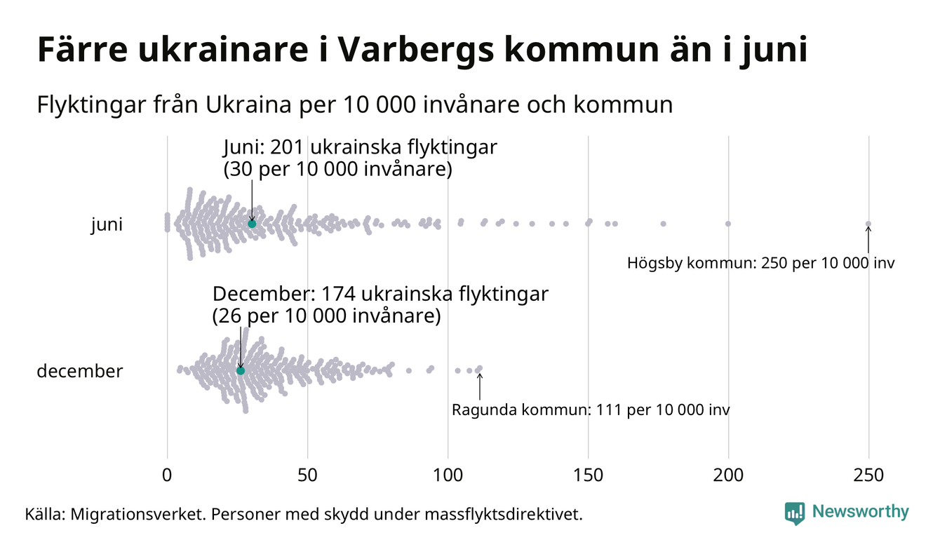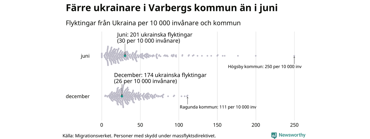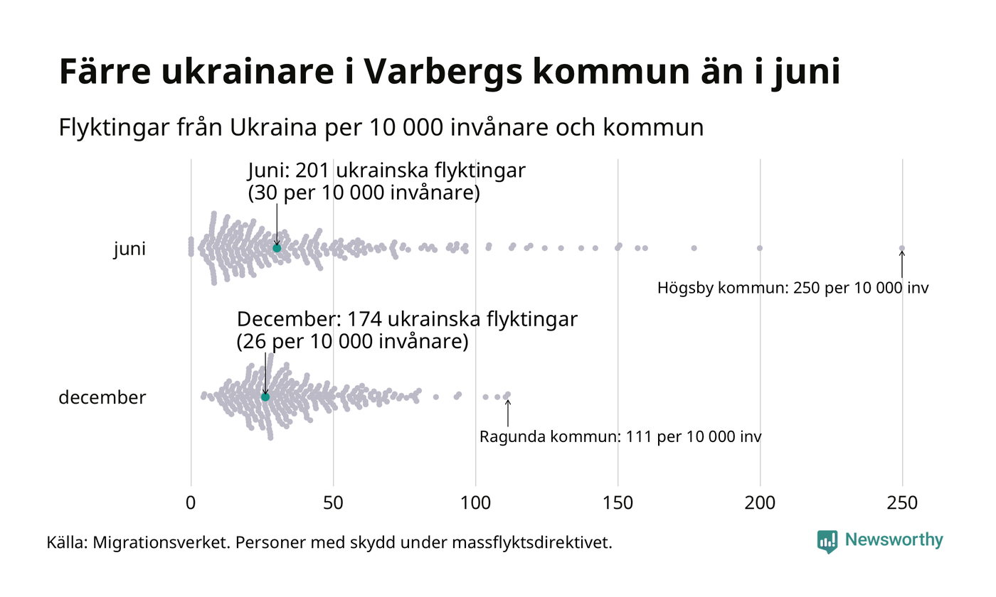 Av de 8 miljoner människor som flytt Ukraina sedan Rysslands invasion i februari har drygt 50 000 kommit till Sverige och i slutet av december fanns knappt 39 000 personer som hade skydd under massflyktsdirektivet i Migrationsverkets system. Och av dem fanns 174 i Varberg. Det är 27 färre än i slutet av juni.