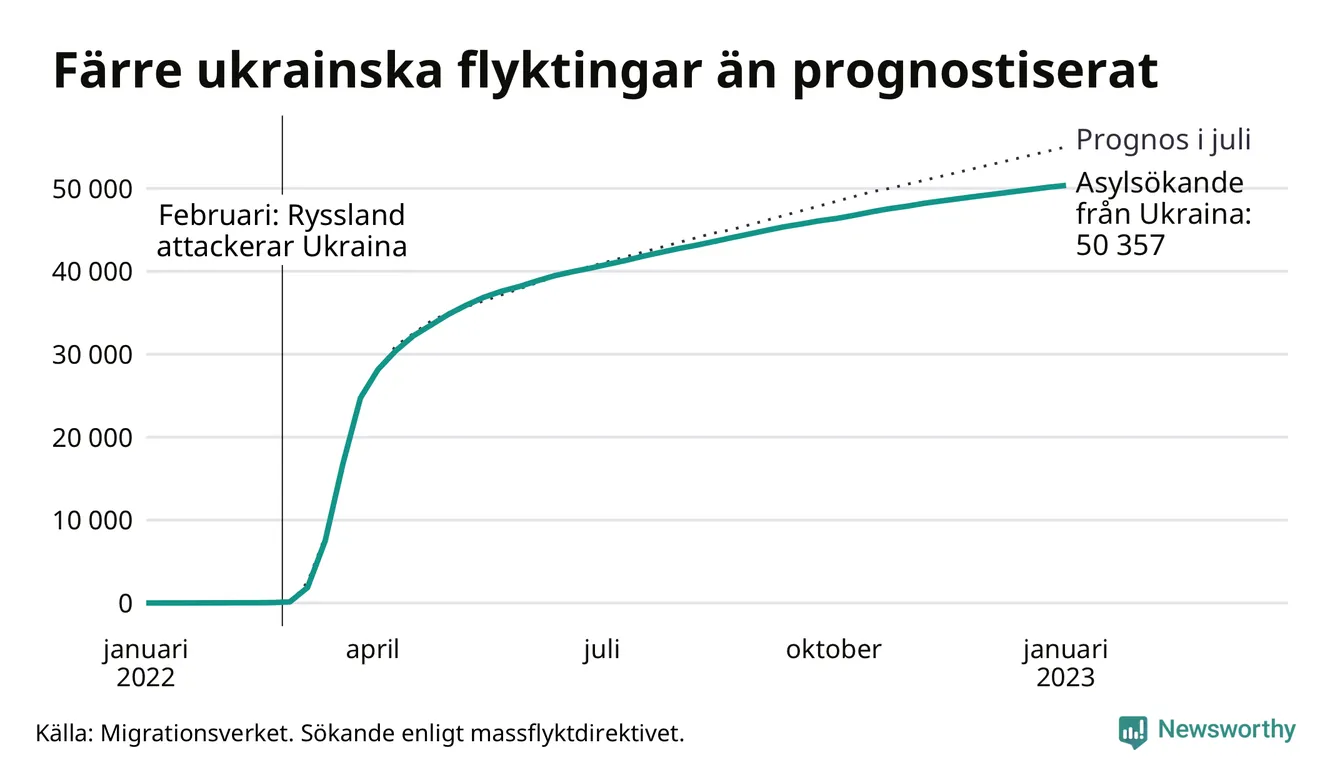 Fördelningstalen byggde på en prognos från Migrationsverket där man räknade med att 55 000 från Ukraina skulle söka skydd i Sverige under året. I själva verket blev de något färre – drygt 50 000. Dessutom har runt 6 000 lämnat Sverige igen. Av dem som stannat i landet var det en större andel än beräknat som ordnade sitt boende på egen hand – och därmed inte omfattades av den nya lagen. Av kommunernas 23 500 platser var drygt 15 400 fyllda i slutet av december.