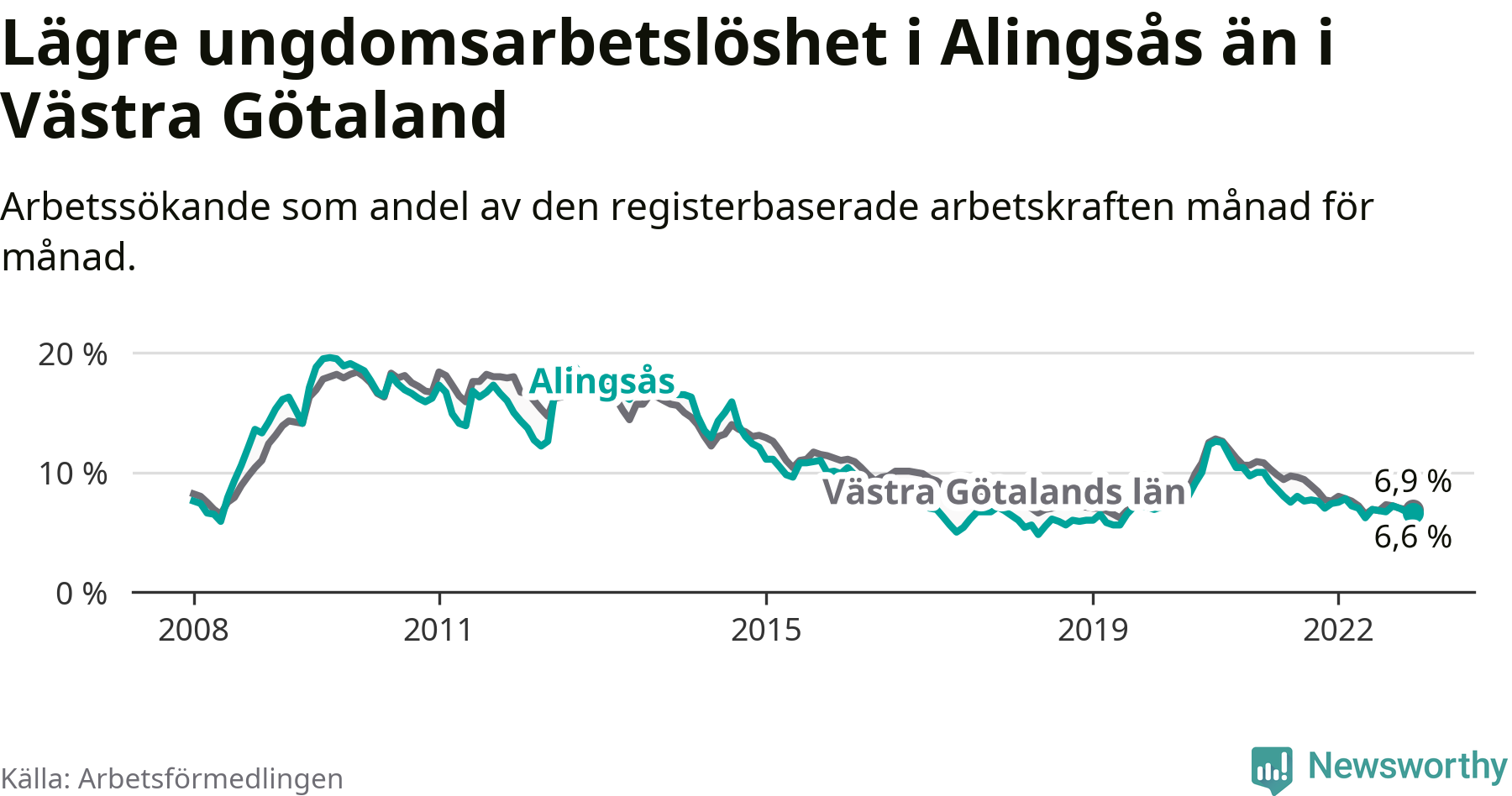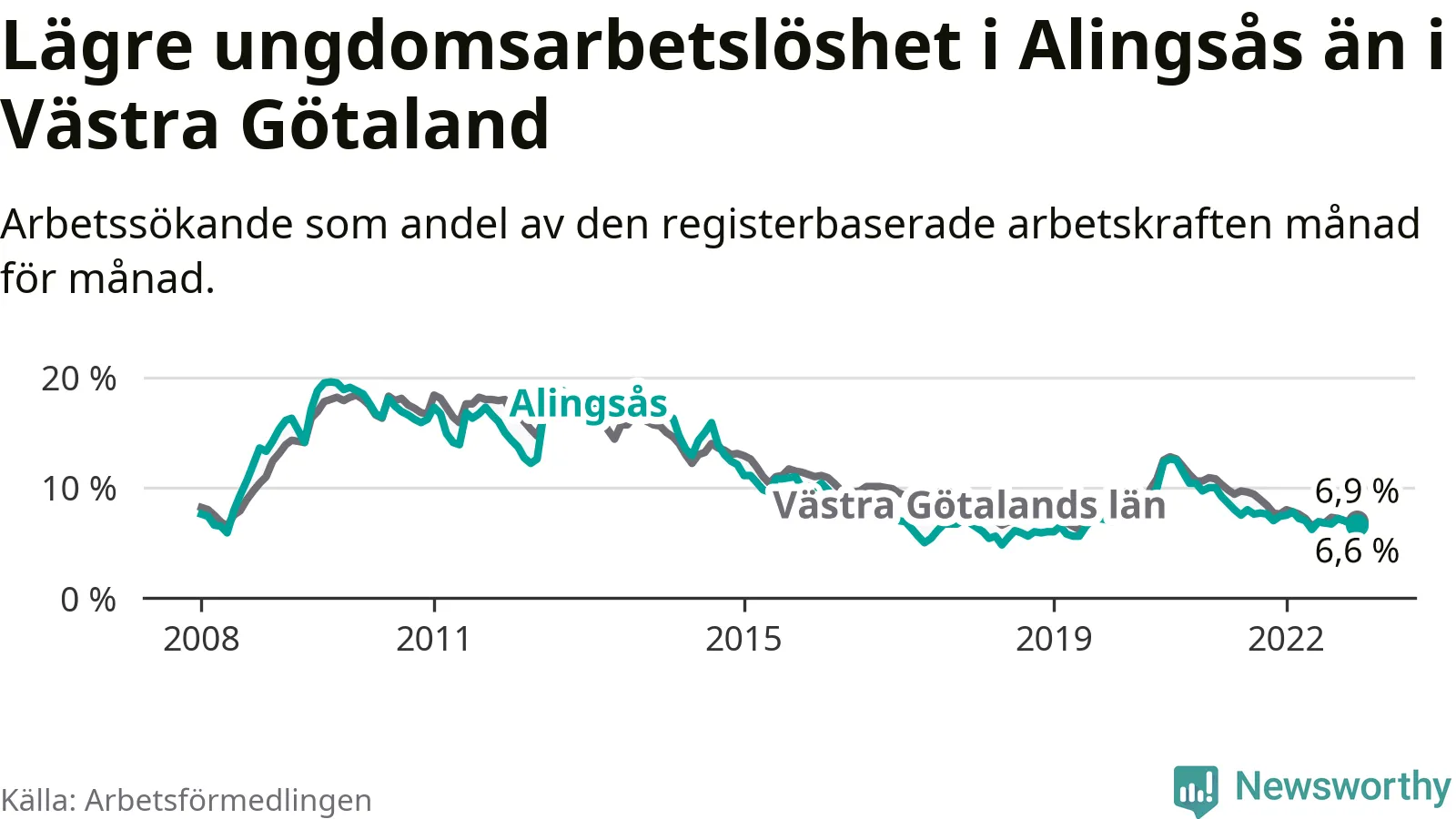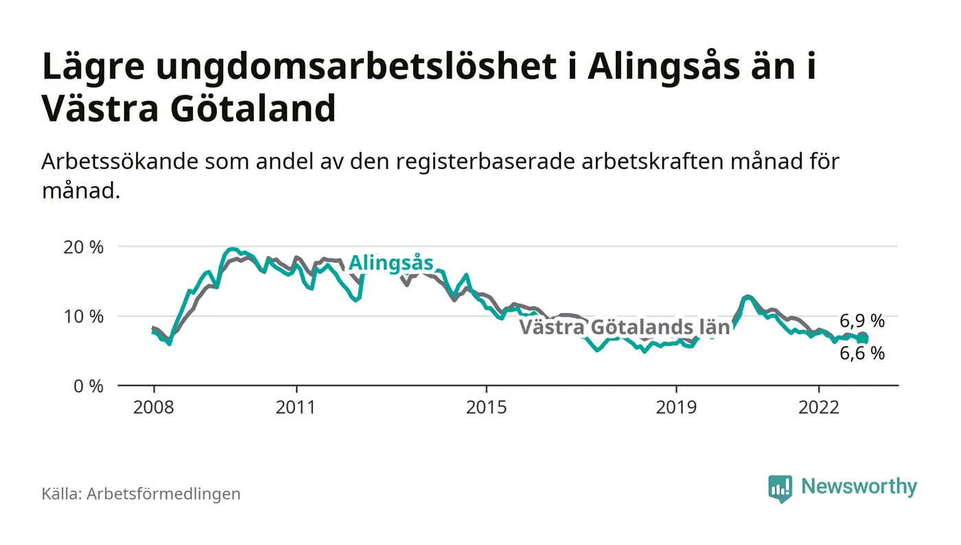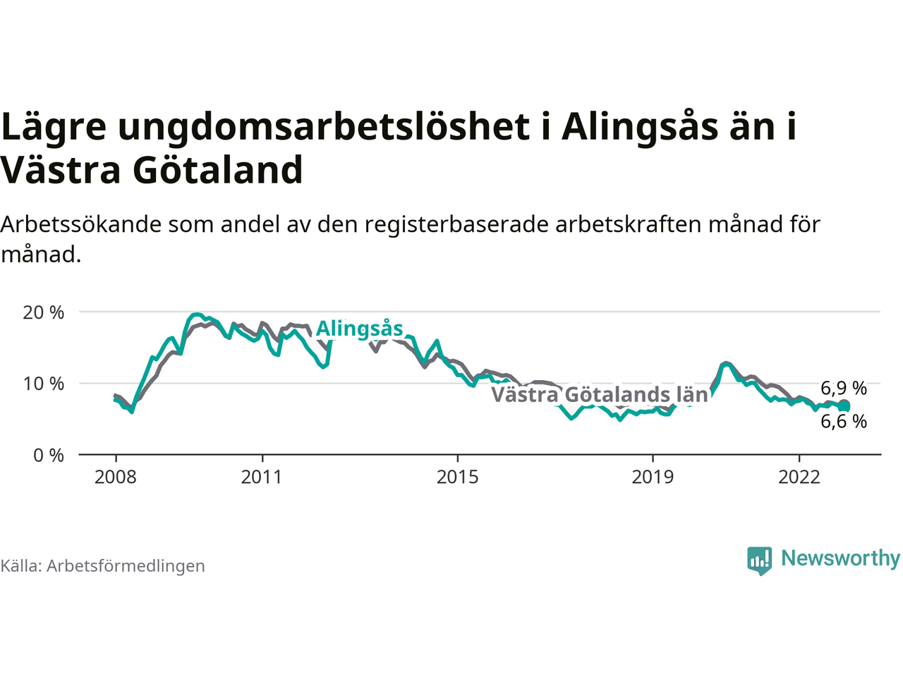 Precis som den totala arbetslösheten ligger ungdomsarbetslösheten i Alingsås lägre än i Västra Götaland som helhet. Skillnaden mellan kommunen och länet är 0,3 procentenheter.