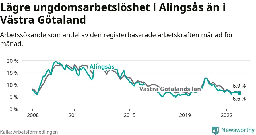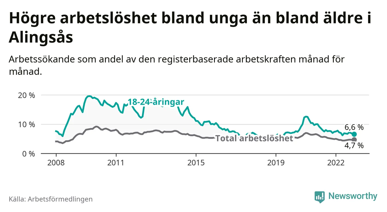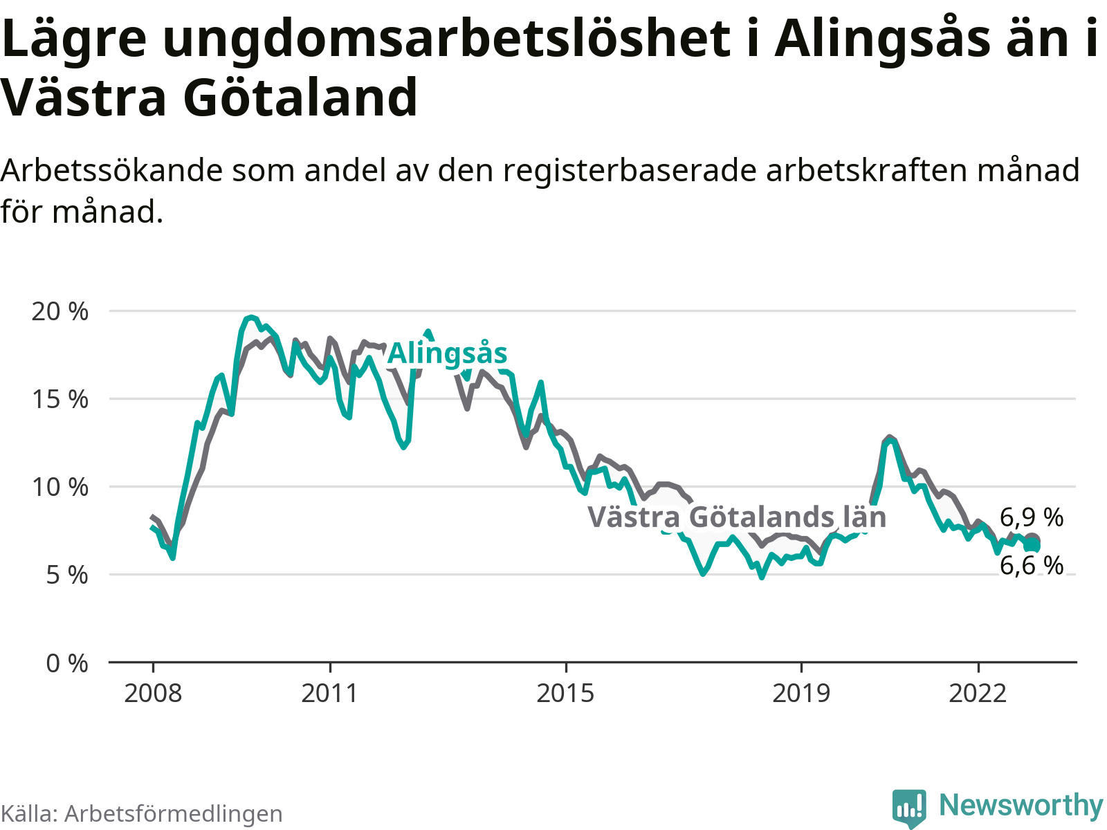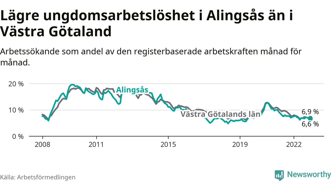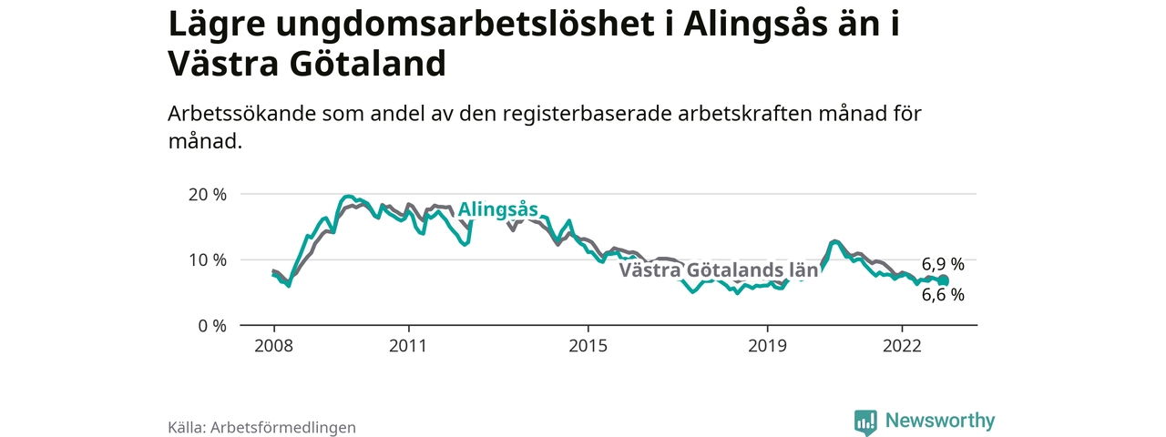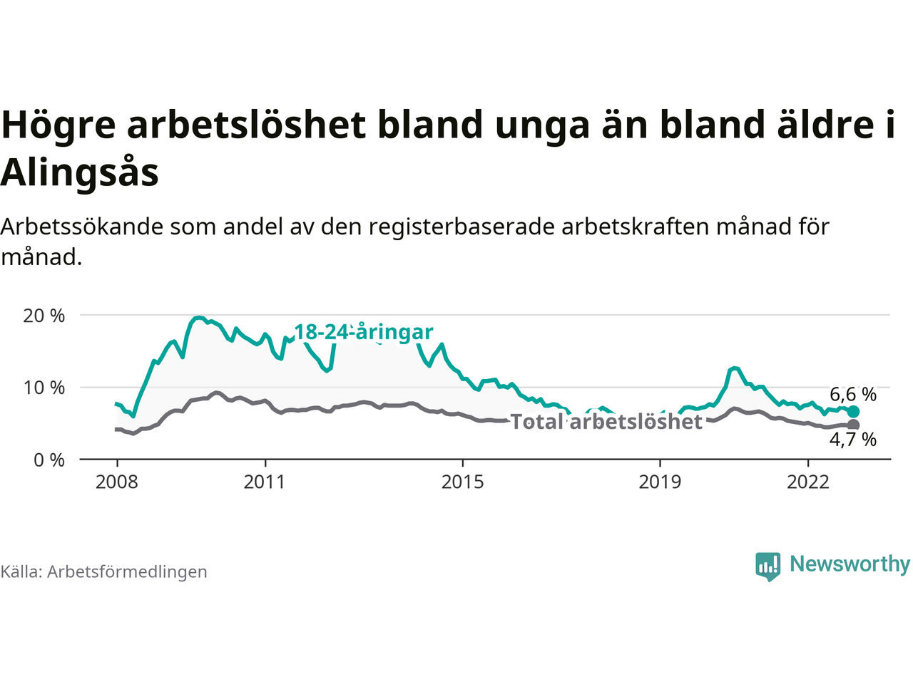 Precis som den totala arbetslösheten ligger ungdomsarbetslösheten i Alingsås lägre än i Västra Götaland som helhet. Skillnaden mellan kommunen och länet är 0,3 procentenheter.