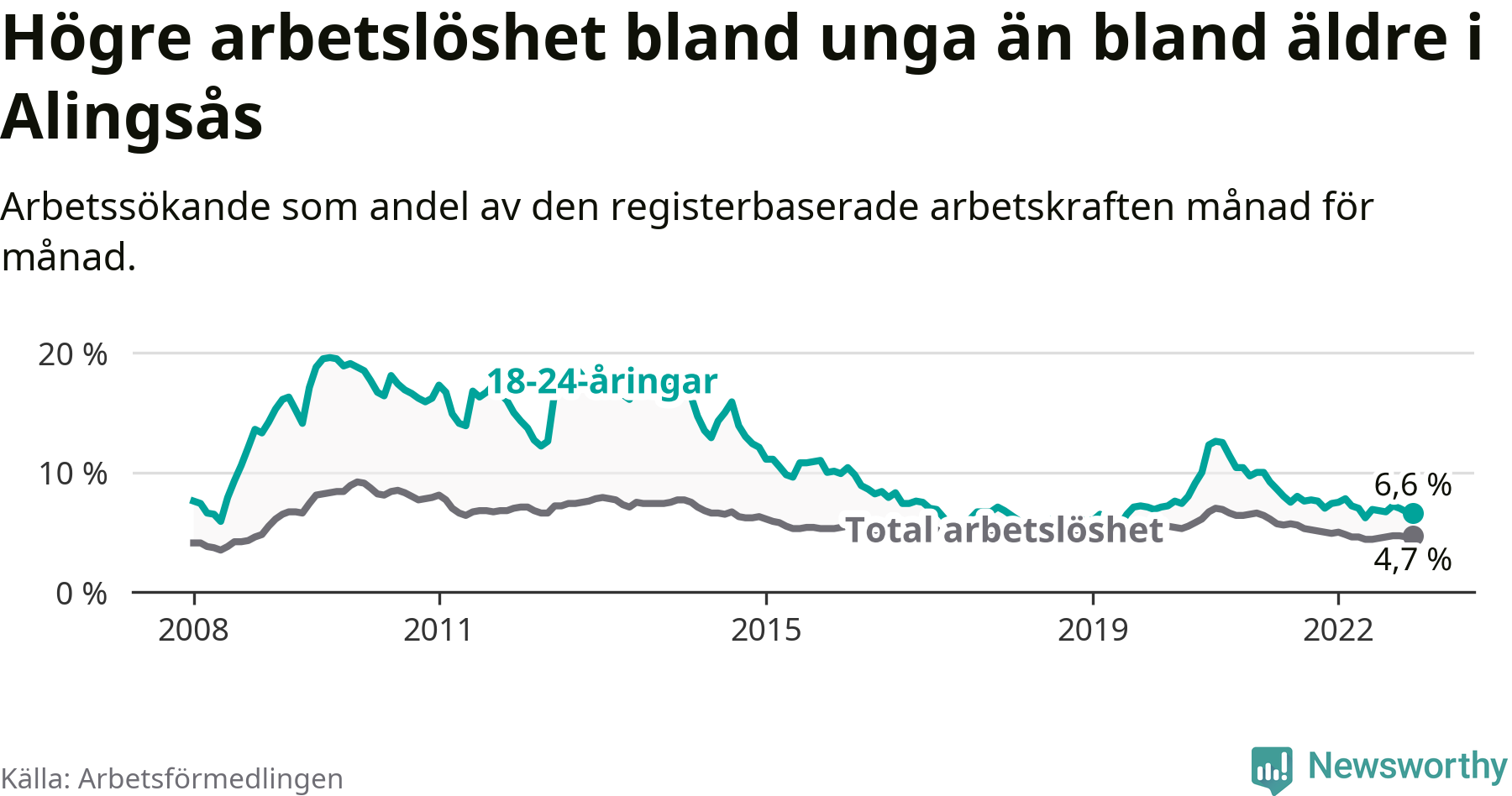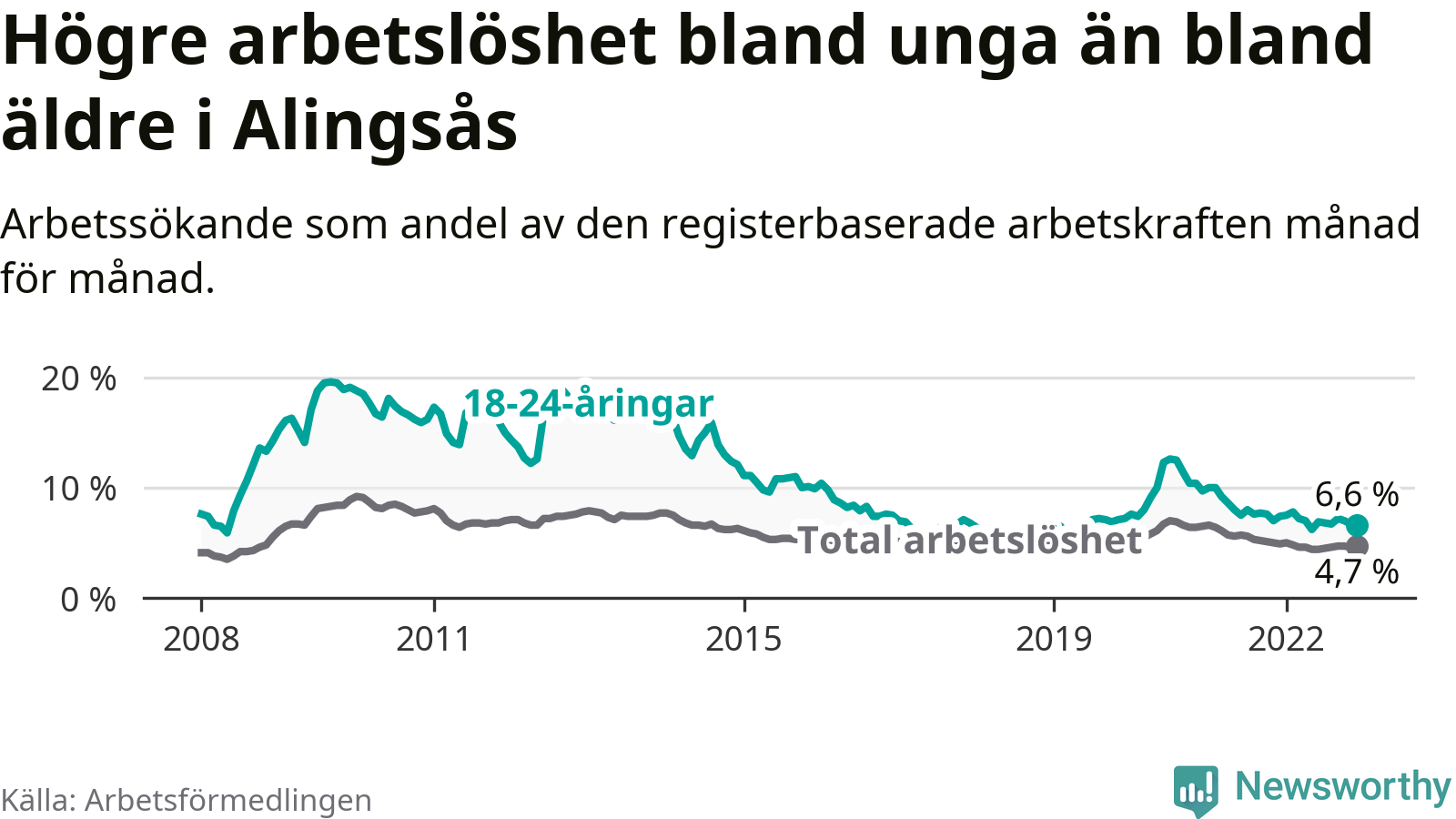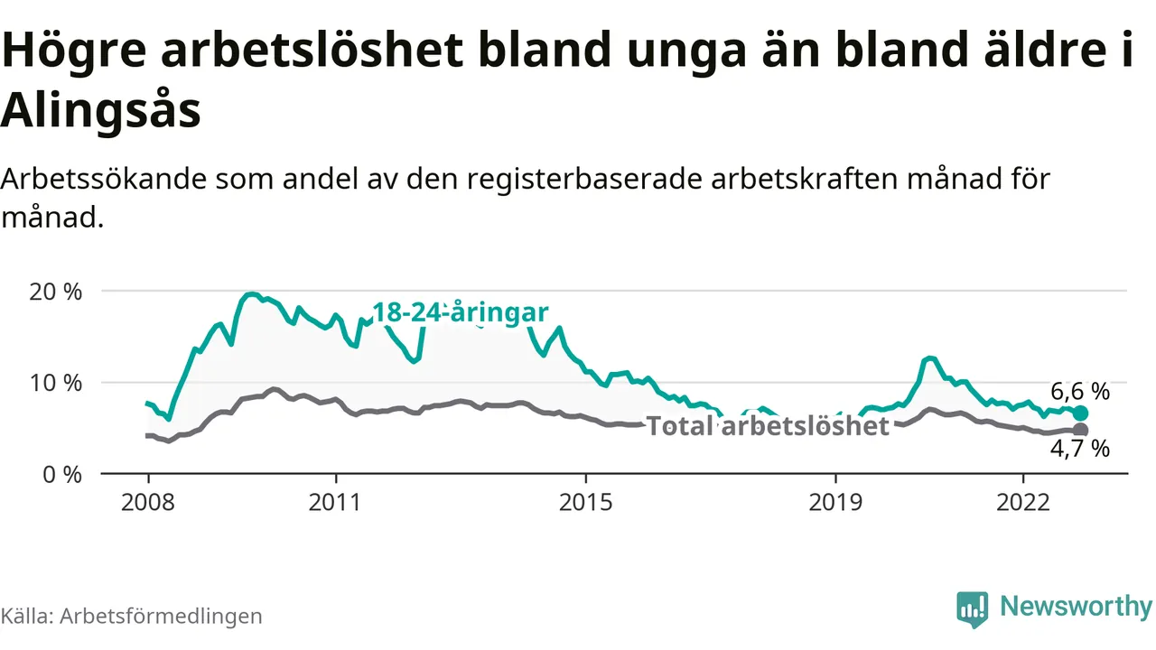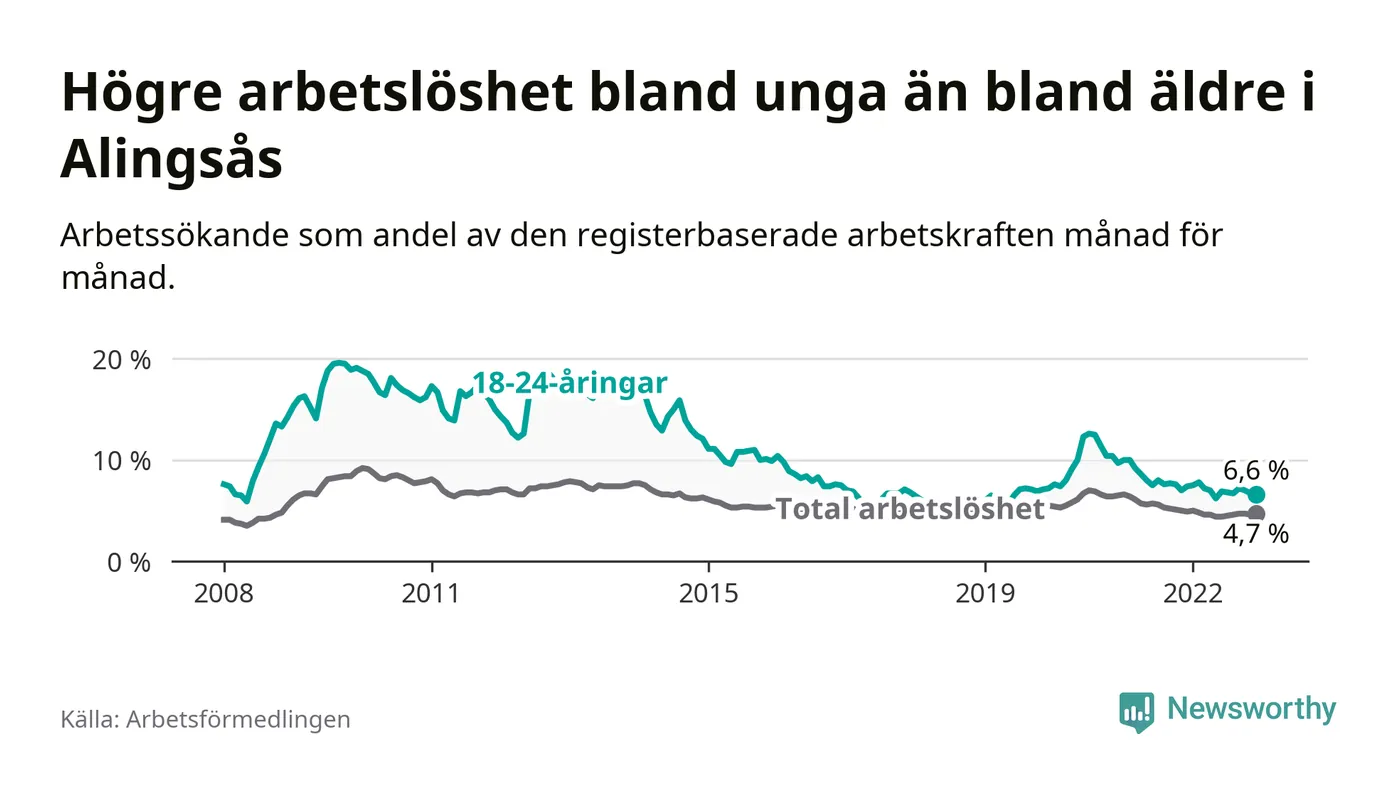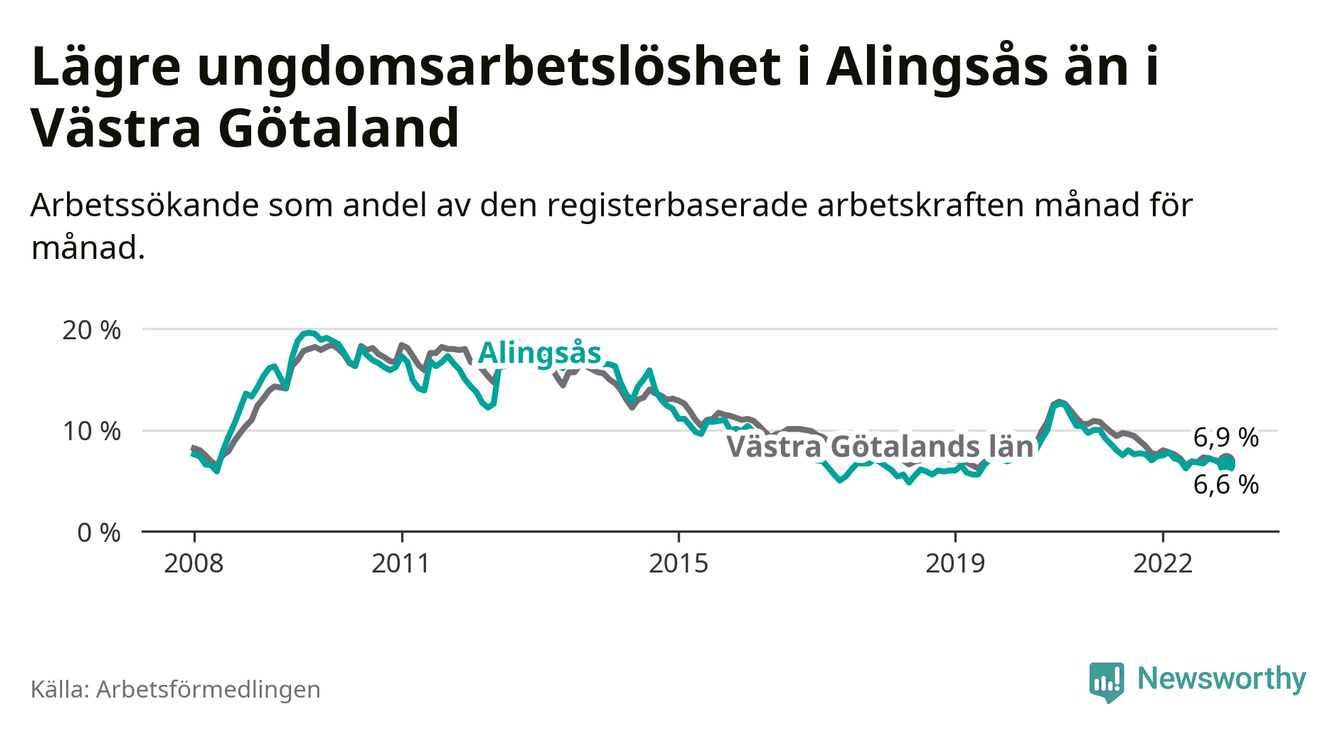 Precis som den totala arbetslösheten ligger ungdomsarbetslösheten i Alingsås lägre än i Västra Götaland som helhet. Skillnaden mellan kommunen och länet är 0,3 procentenheter.