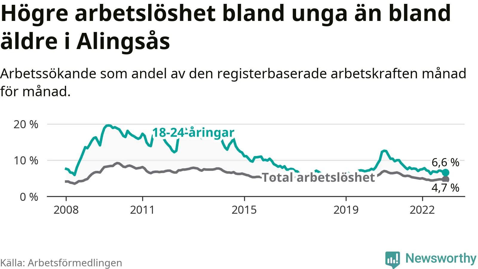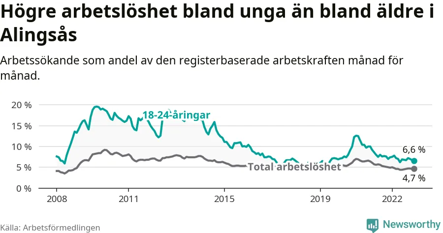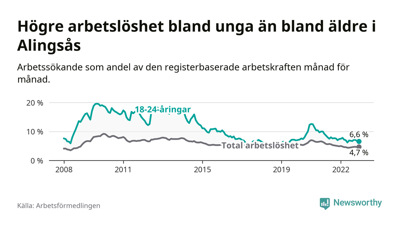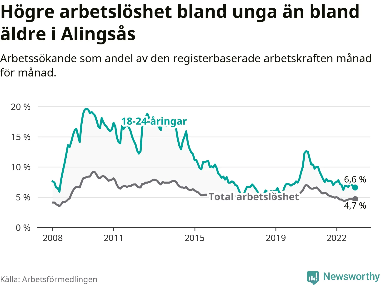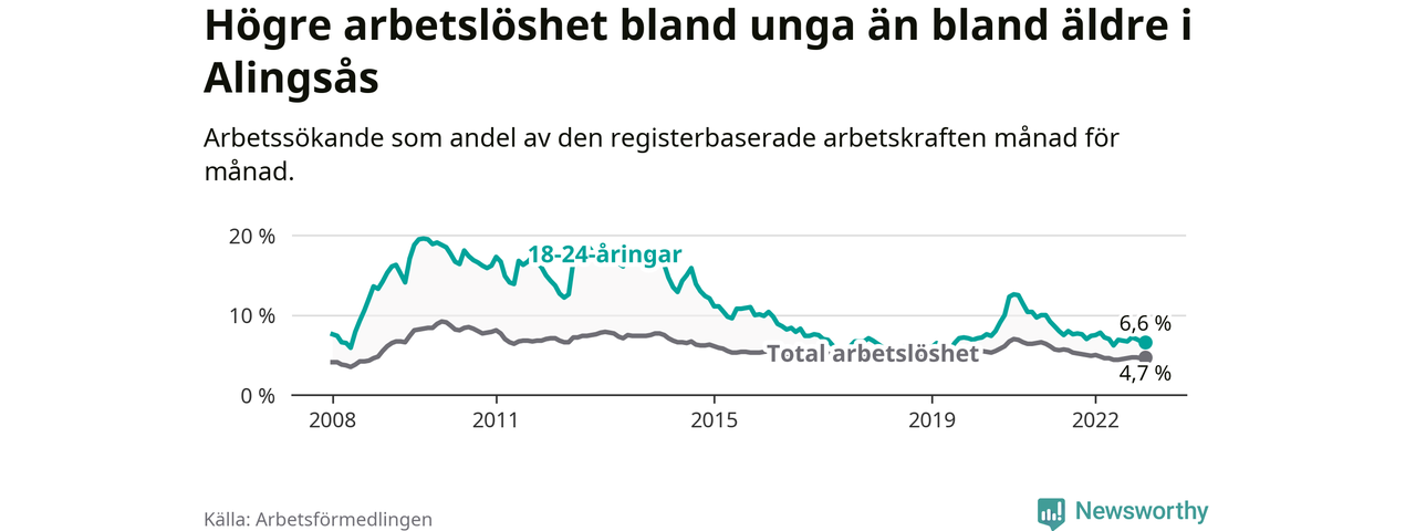Precis som den totala arbetslösheten ligger ungdomsarbetslösheten i Alingsås lägre än i Västra Götaland som helhet. Skillnaden mellan kommunen och länet är 0,3 procentenheter.