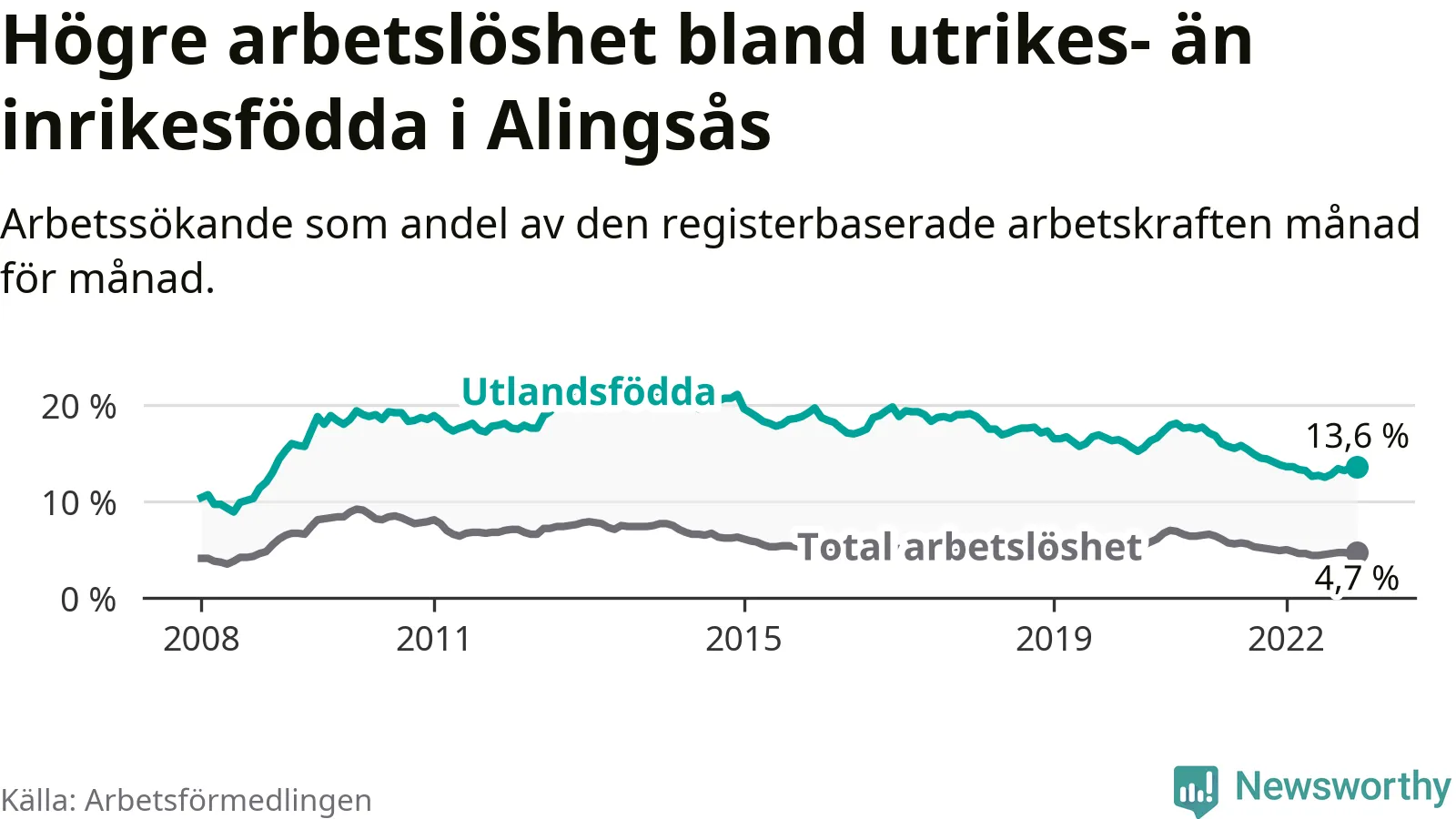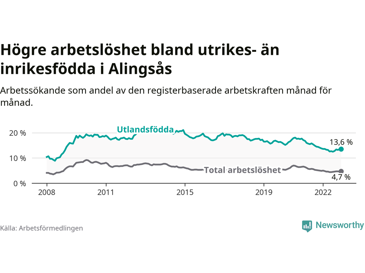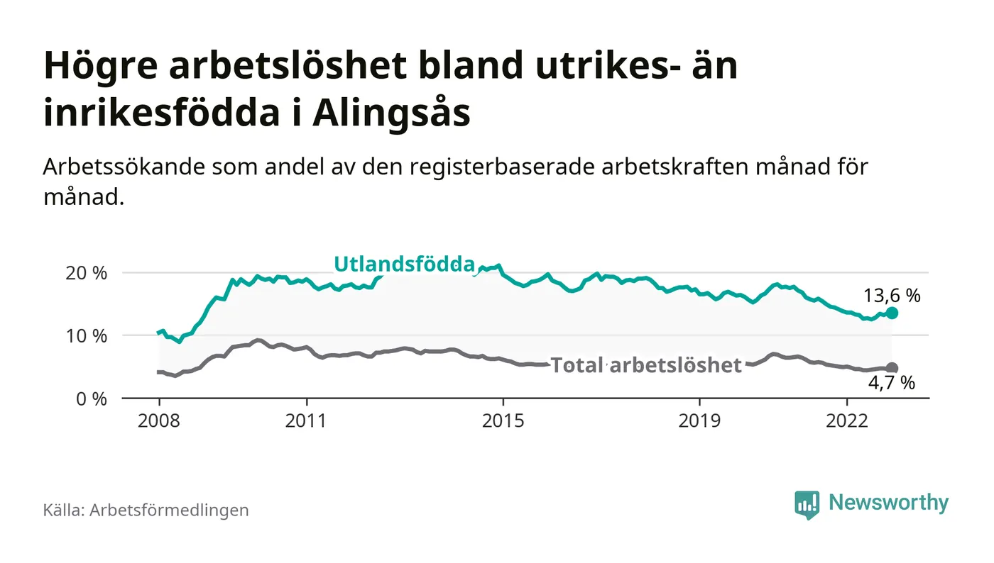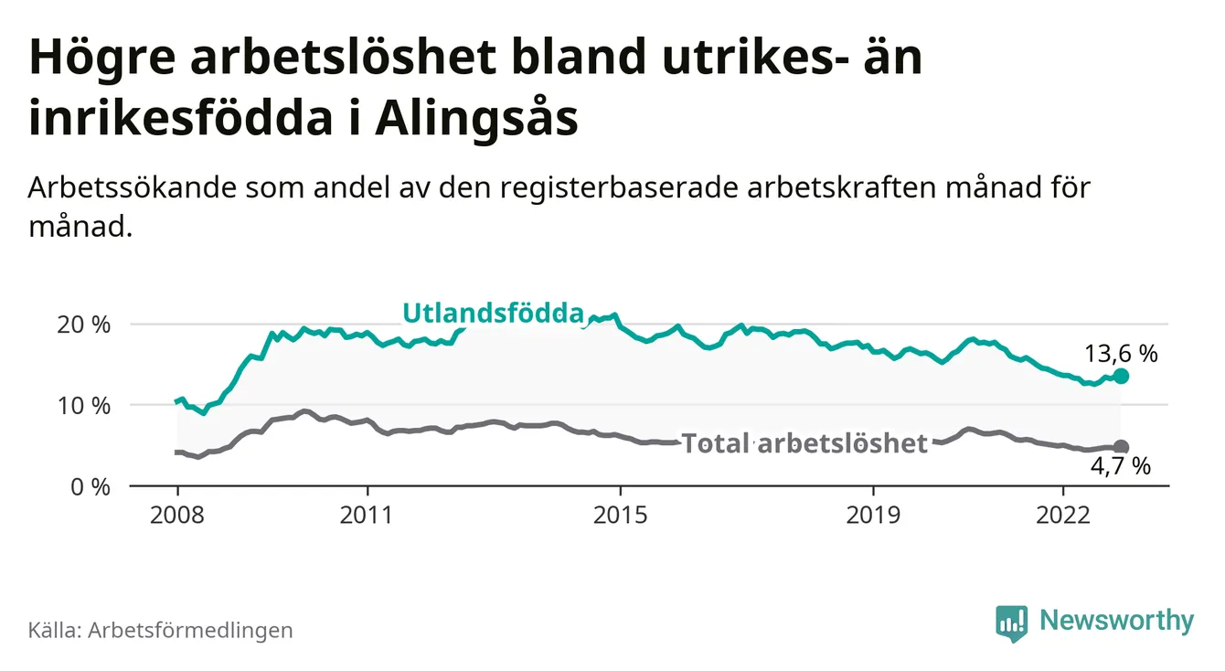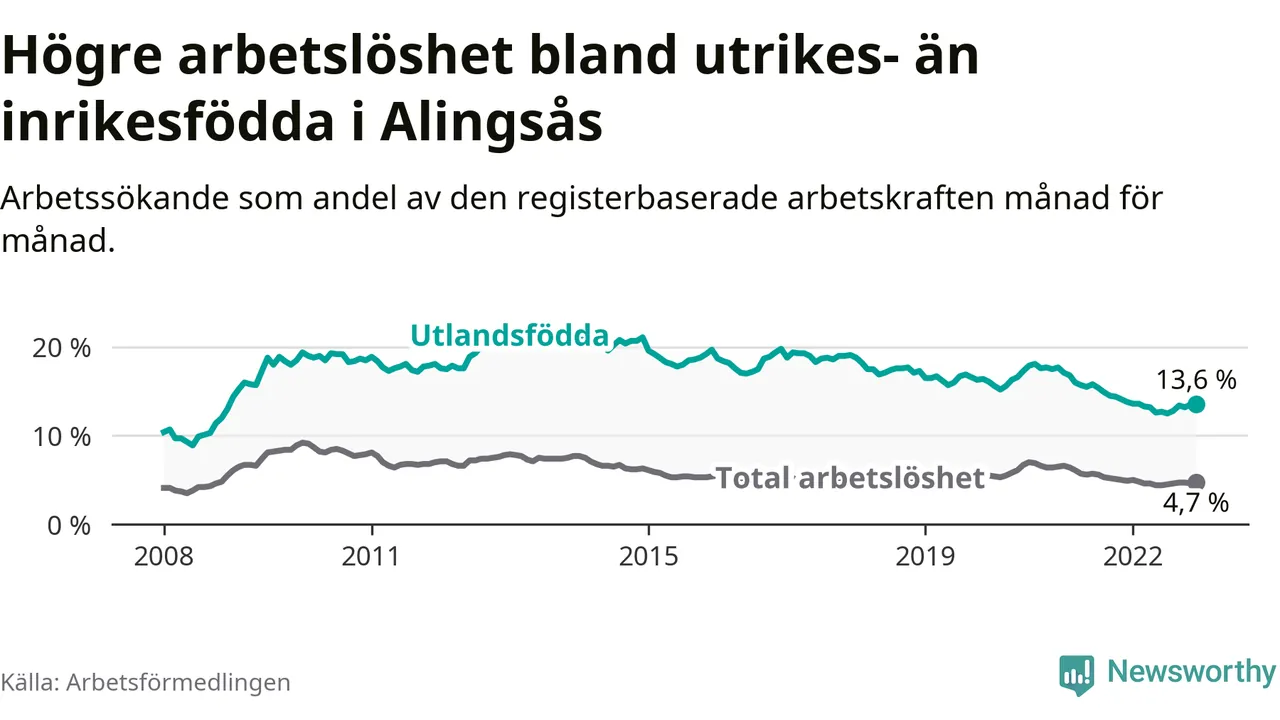 Skillnaden i arbetslöshet mellan utrikesfödda och hela befolkningen är 8,9 procentenheter i Alingsås. Det är ungefär samma skillnad som för ett år sedan.