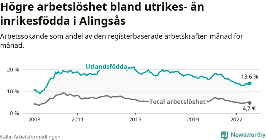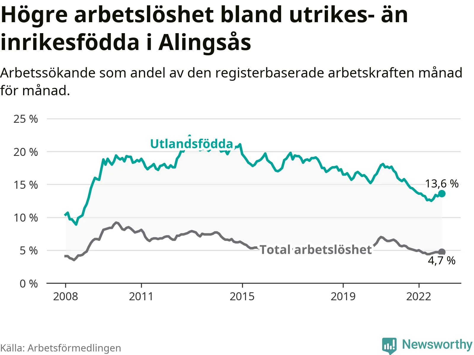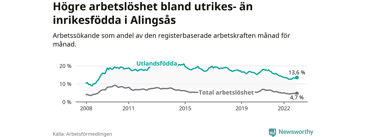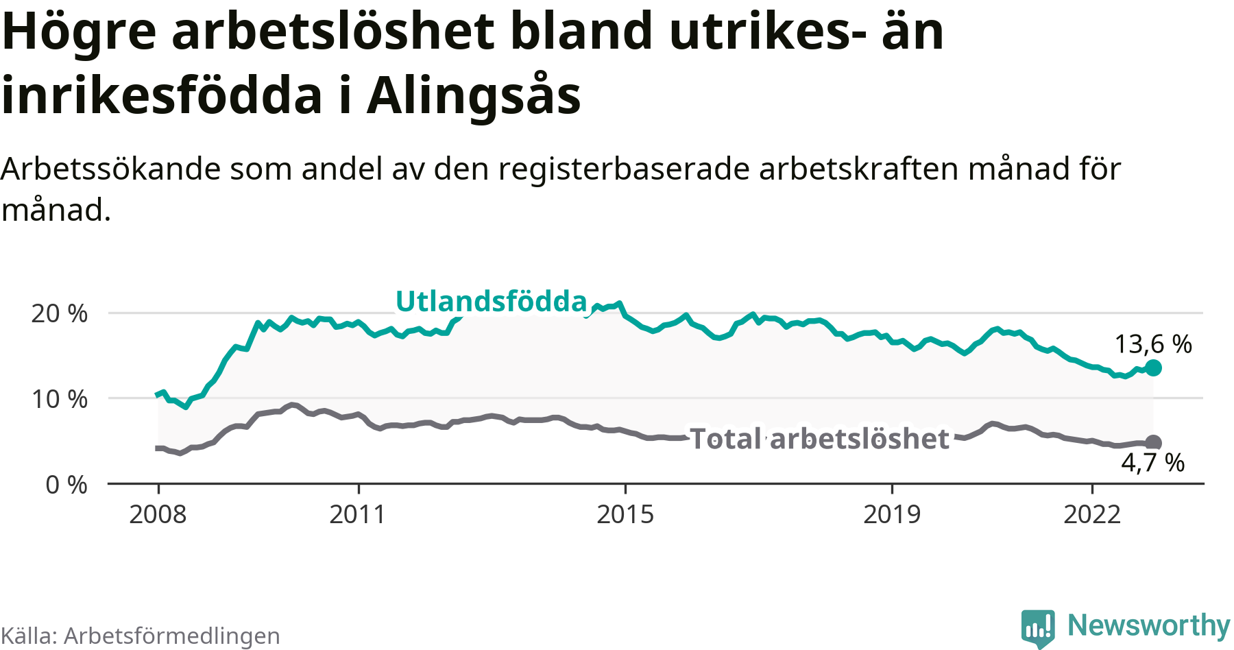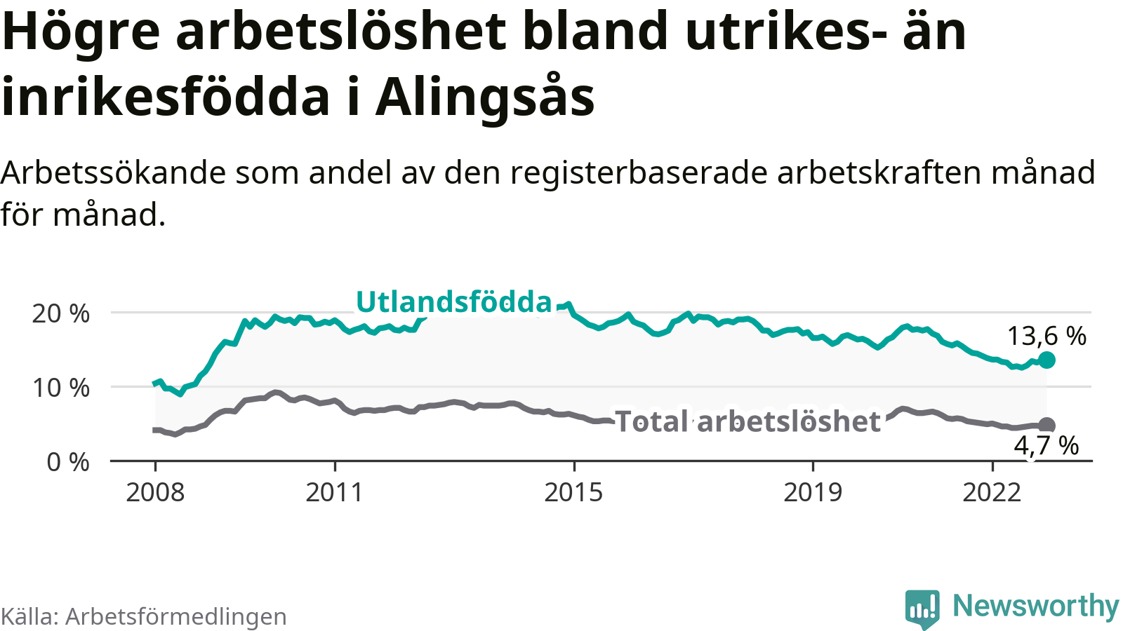 Skillnaden i arbetslöshet mellan utrikesfödda och hela befolkningen är 8,9 procentenheter i Alingsås. Det är ungefär samma skillnad som för ett år sedan.