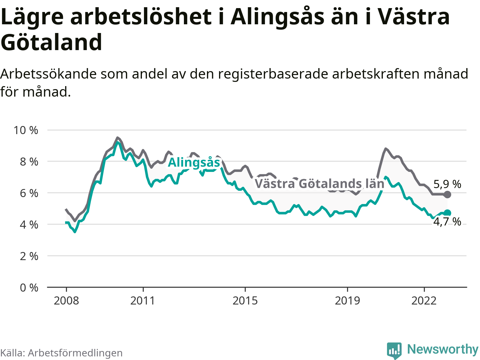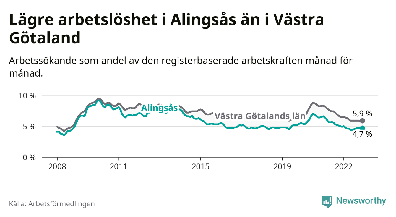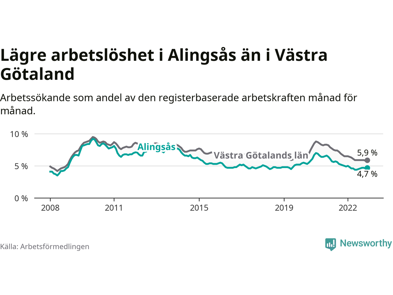 Alingsås hade redan tidigare lägre arbetslöshet än snittet i hela Västra Götalands län och nu växer klyftan (4,7 procent i kommunen, jämfört med 5,9 procent i hela länet). Tjörn och Öckerö har den lägsta arbetslösheten i länet (2,6 procent), medan Trollhättan har den högsta (9,1 procent). För att Alingsås skulle komma ner i samma arbetslöshetsnivå som Tjörn och Öckerö skulle 419 personer behöva sysselsättas.