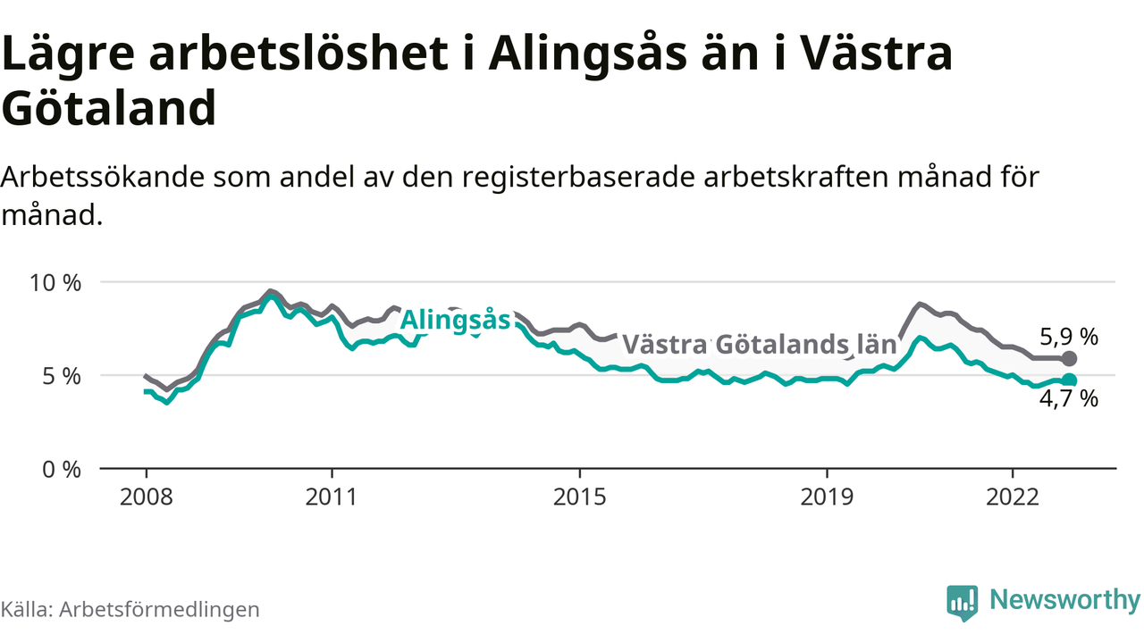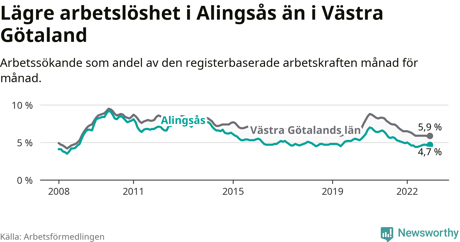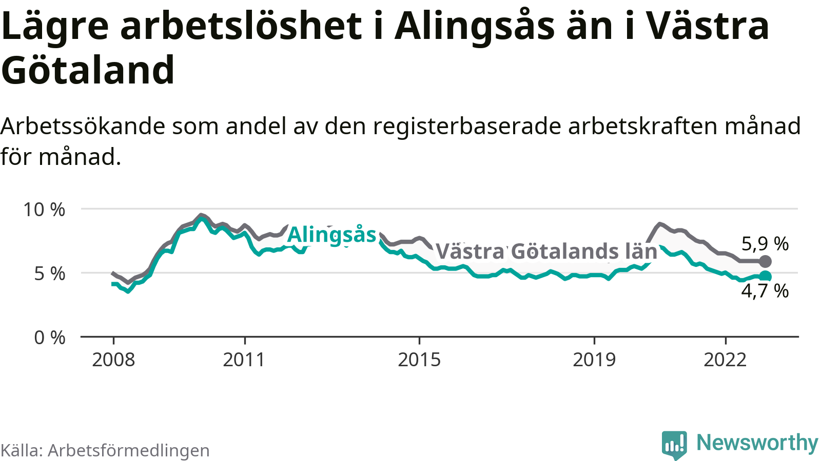 Alingsås hade redan tidigare lägre arbetslöshet än snittet i hela Västra Götalands län och nu växer klyftan (4,7 procent i kommunen, jämfört med 5,9 procent i hela länet). Tjörn och Öckerö har den lägsta arbetslösheten i länet (2,6 procent), medan Trollhättan har den högsta (9,1 procent). För att Alingsås skulle komma ner i samma arbetslöshetsnivå som Tjörn och Öckerö skulle 419 personer behöva sysselsättas.