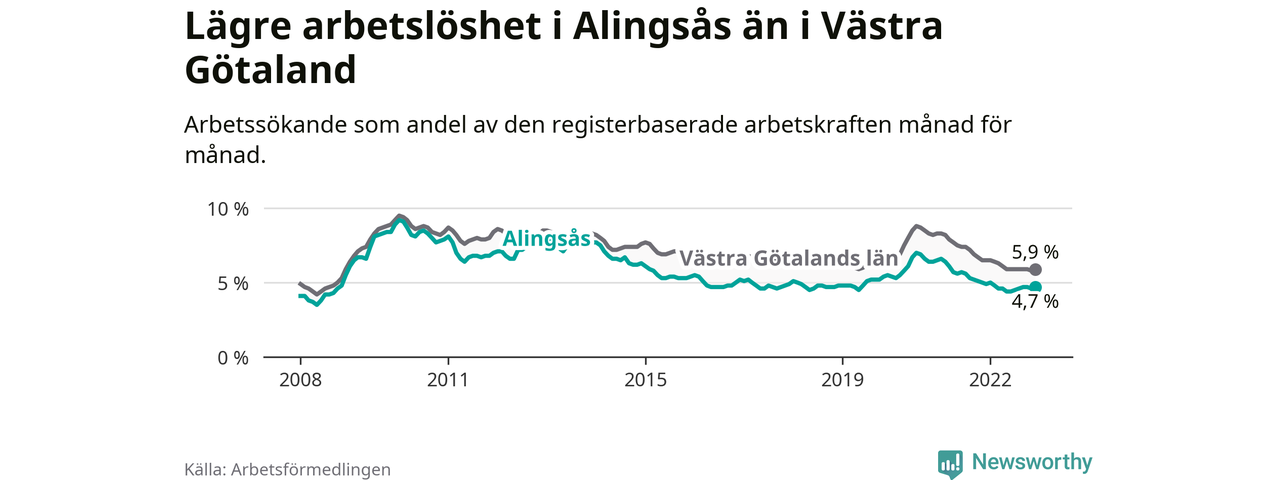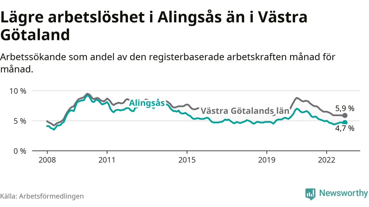 Under december månad rapporterade Alingsås kommun en total arbetslöshet på 4,7 procent. Det är en minskning jämfört med samma tidpunkt i fjol (−0,2 procentenheter). Även i Västra Götalands län sjunker arbetslösheten .