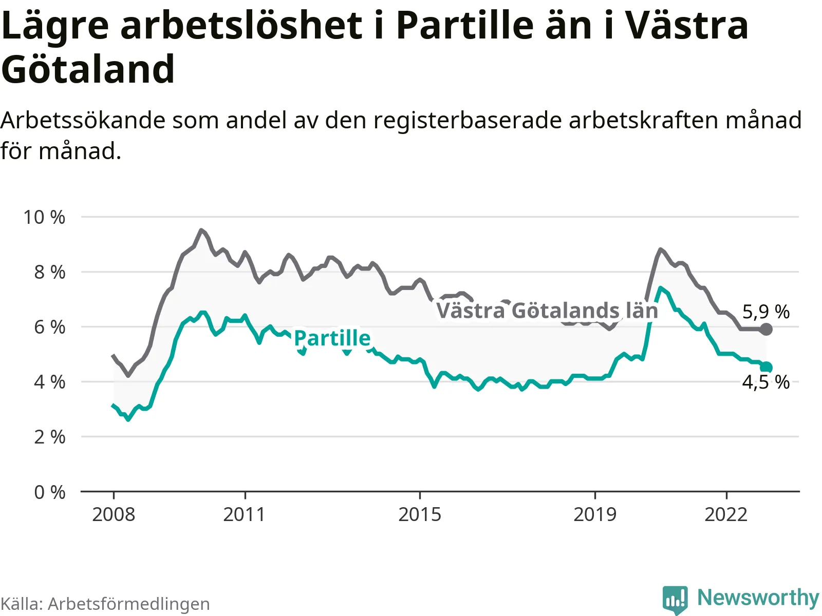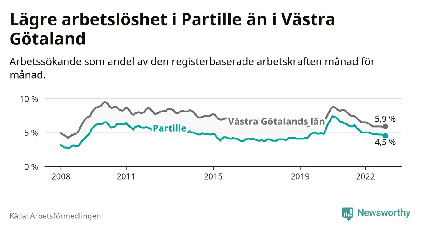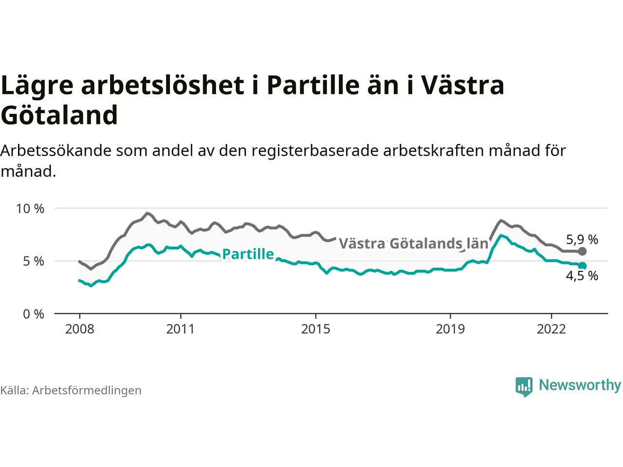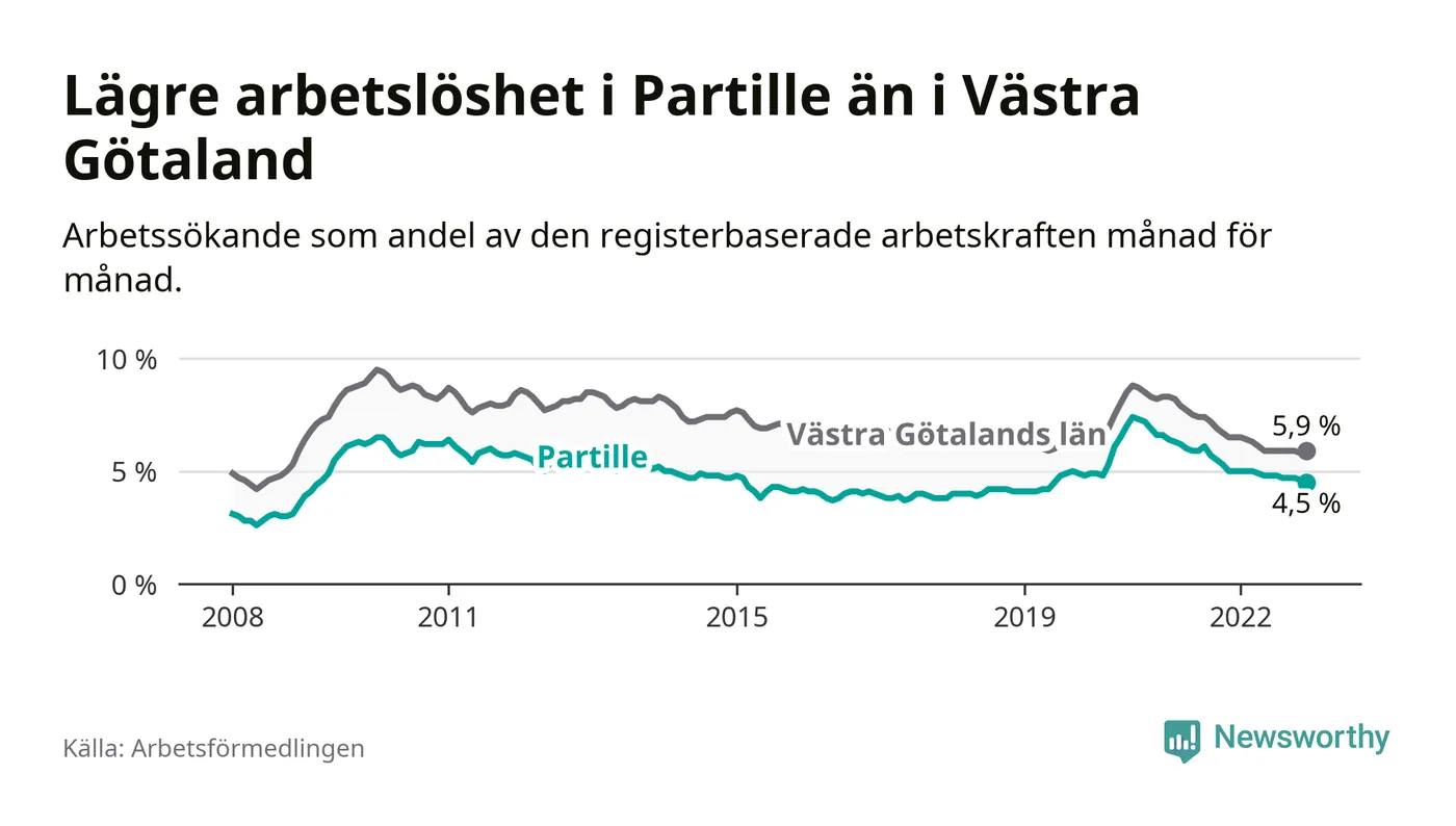 Partille hade redan tidigare lägre arbetslöshet än snittet i hela Västra Götalands län och nu växer klyftan (4,5 procent i kommunen, jämfört med 5,9 procent i hela länet). Tjörn och Öckerö har den lägsta arbetslösheten i länet (2,6 procent), medan Trollhättan har den högsta (9,1 procent). För att Partille skulle komma ner i samma arbetslöshetsnivå som Tjörn och Öckerö skulle 375 personer behöva sysselsättas.