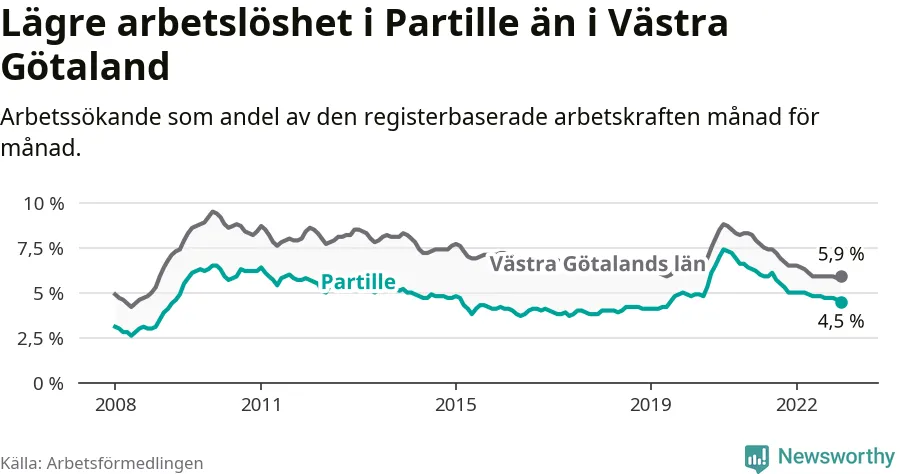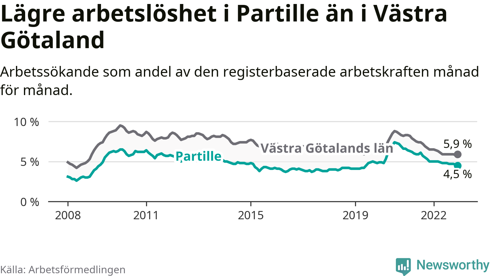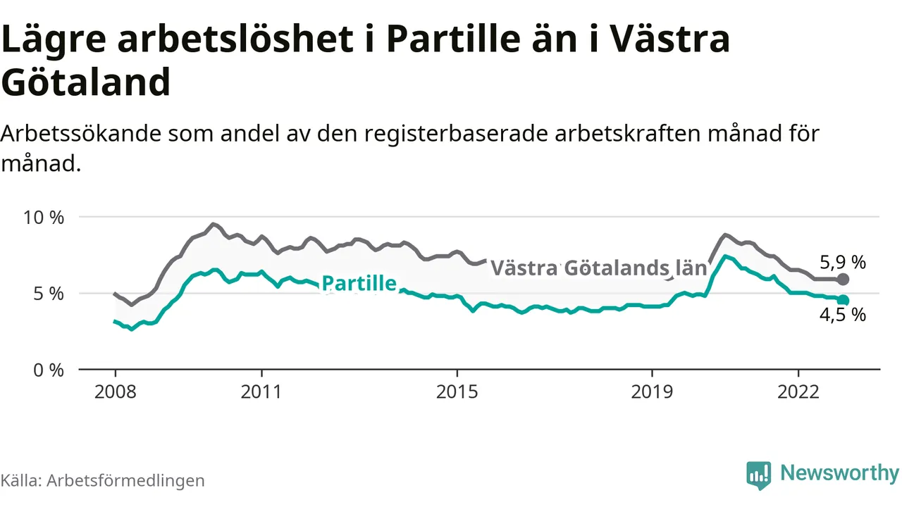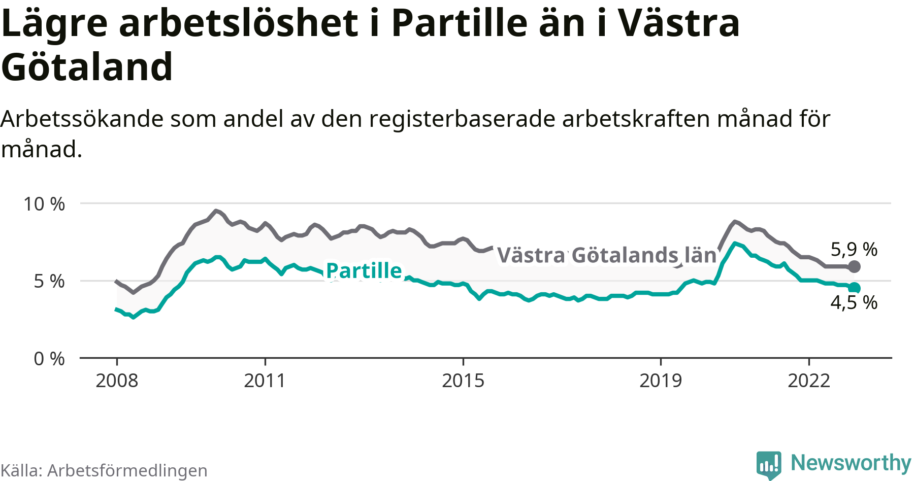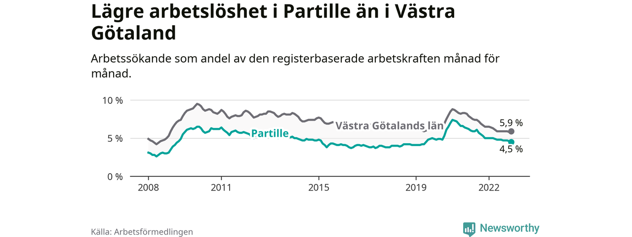 Partille hade redan tidigare lägre arbetslöshet än snittet i hela Västra Götalands län och nu växer klyftan (4,5 procent i kommunen, jämfört med 5,9 procent i hela länet). Tjörn och Öckerö har den lägsta arbetslösheten i länet (2,6 procent), medan Trollhättan har den högsta (9,1 procent). För att Partille skulle komma ner i samma arbetslöshetsnivå som Tjörn och Öckerö skulle 375 personer behöva sysselsättas.