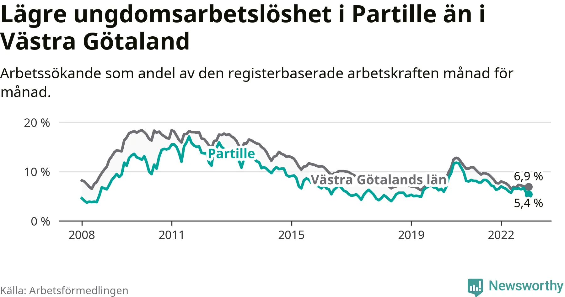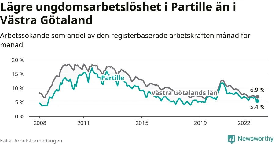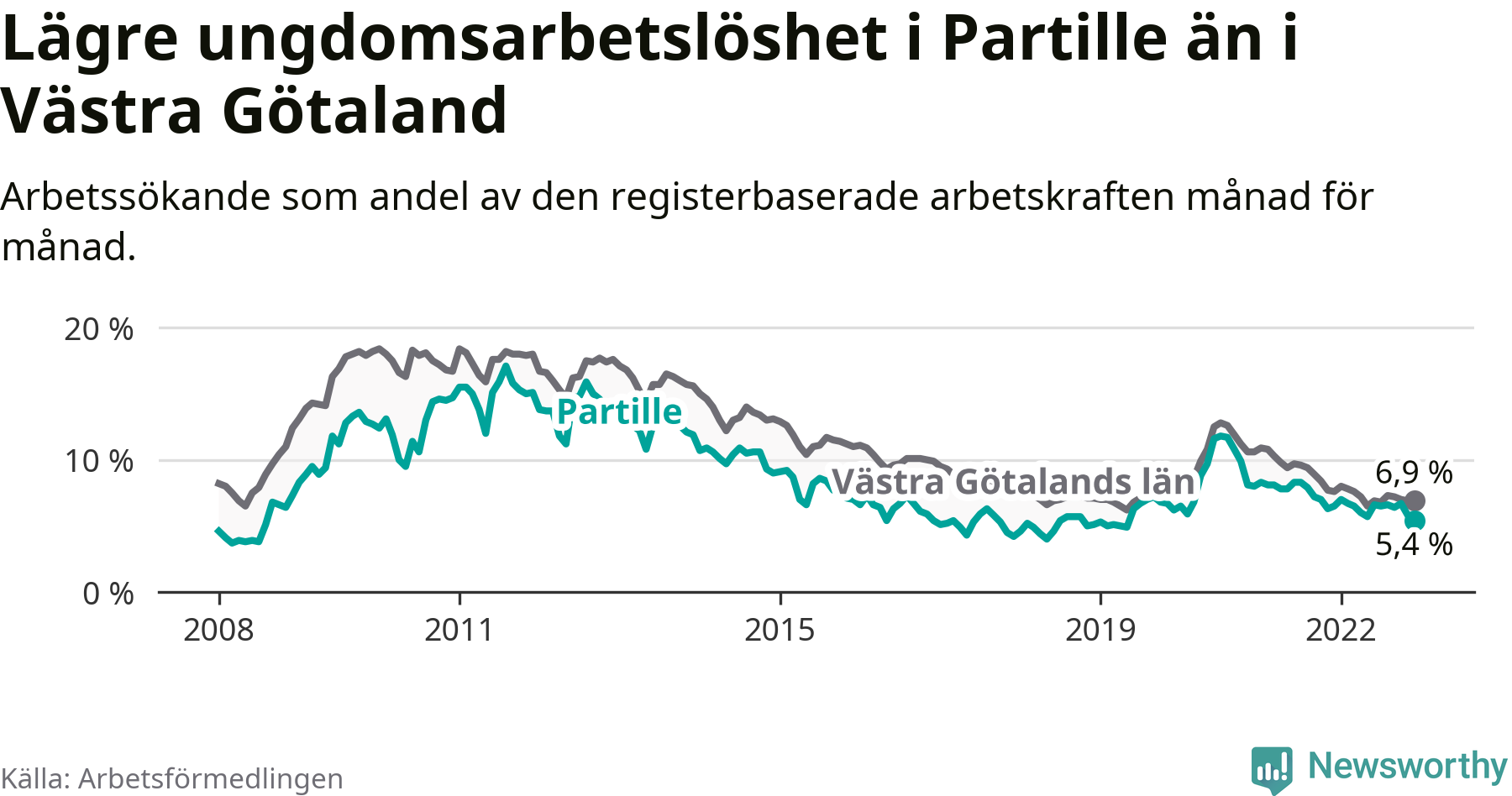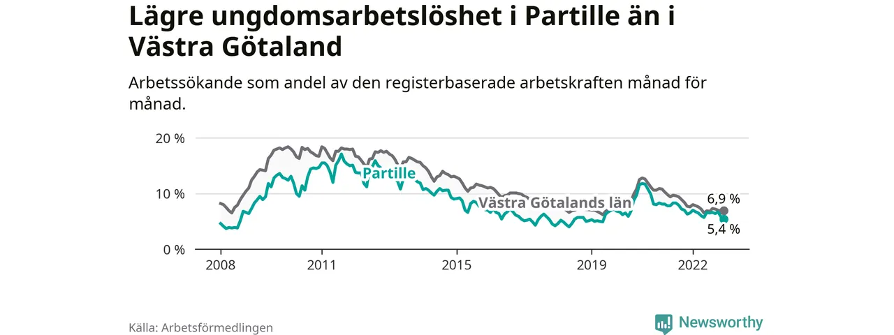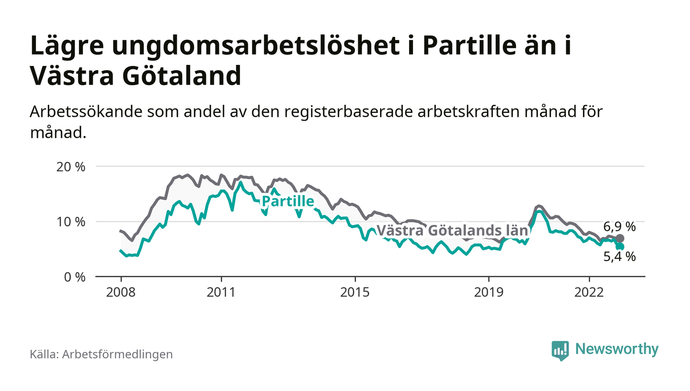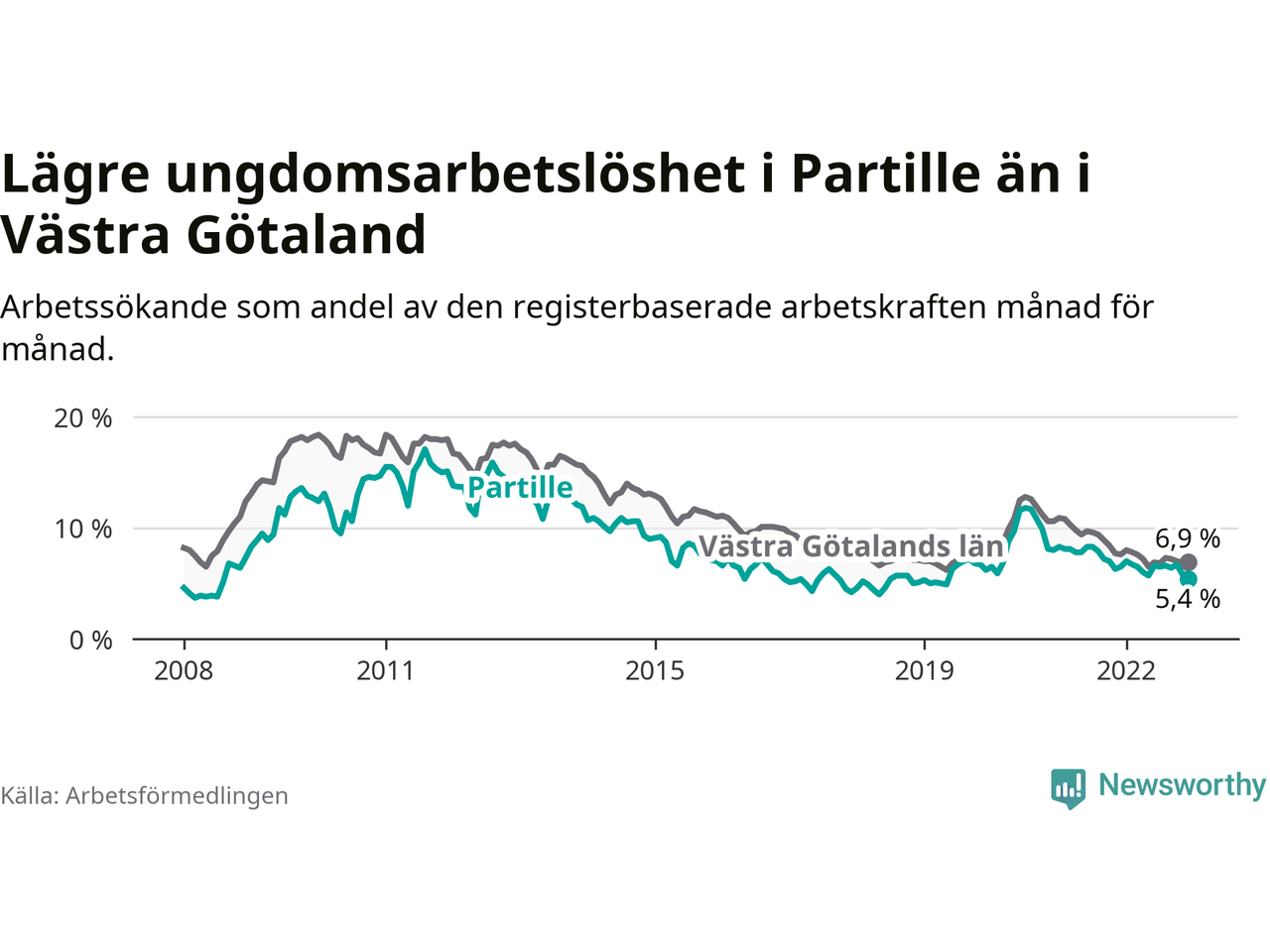 Precis som den totala arbetslösheten ligger ungdomsarbetslösheten i Partille lägre än i Västra Götaland som helhet. Skillnaden mellan kommunen och länet är 1,5 procentenheter.