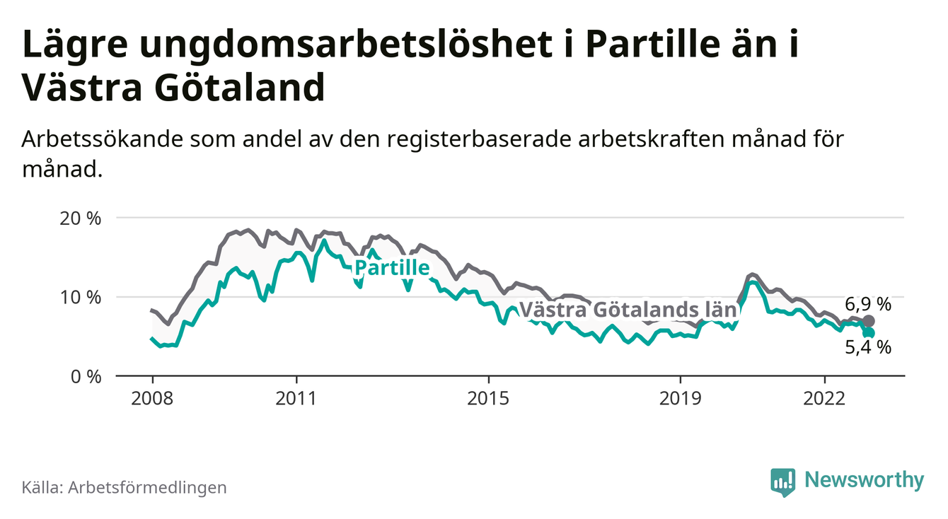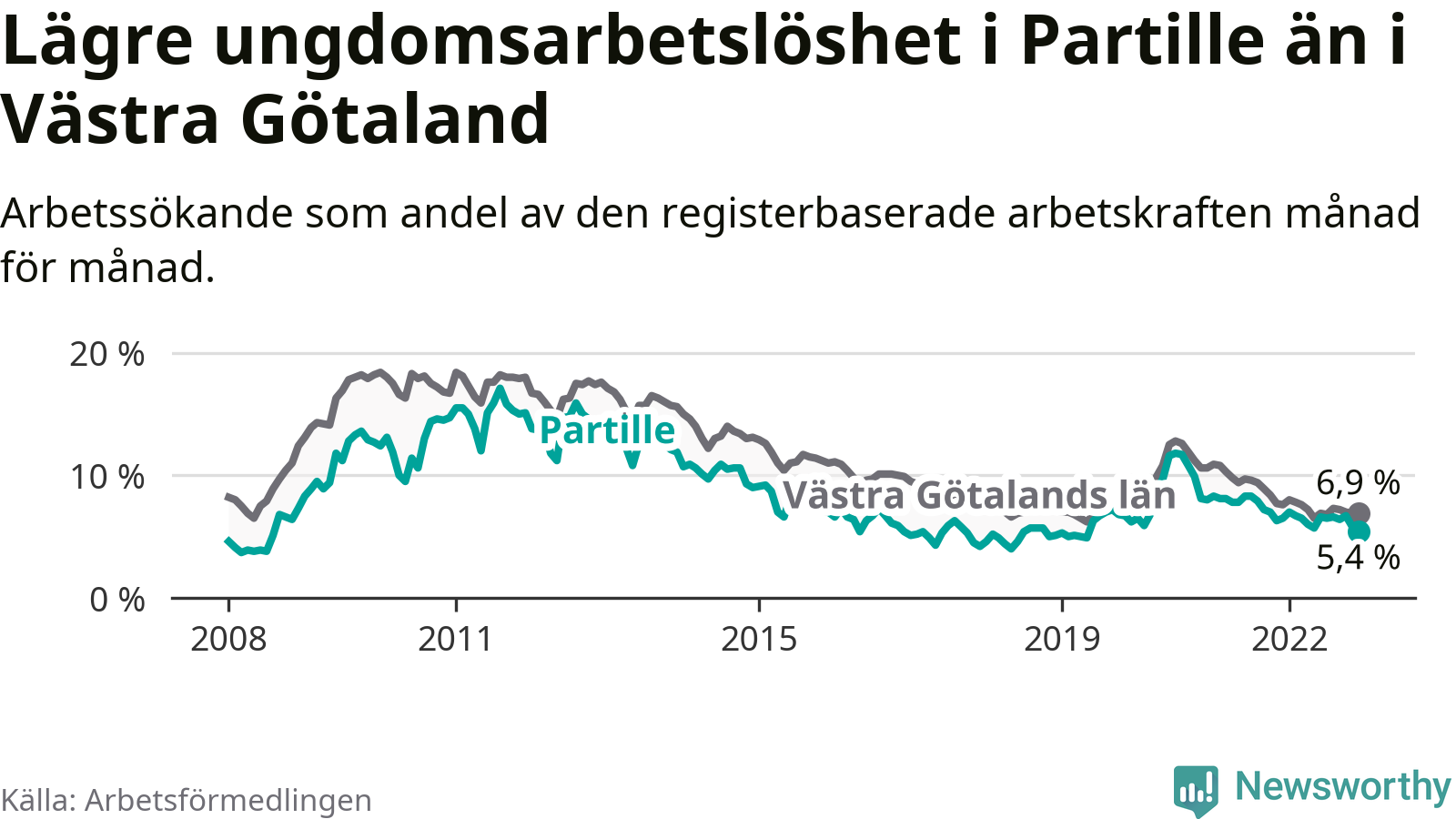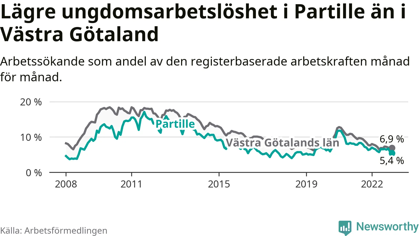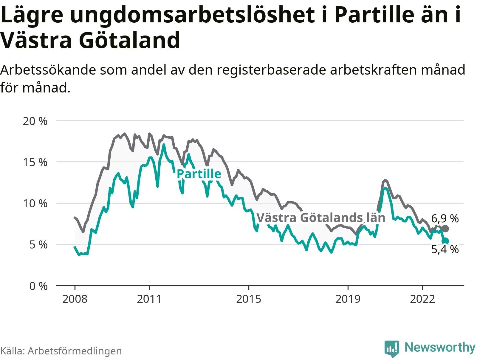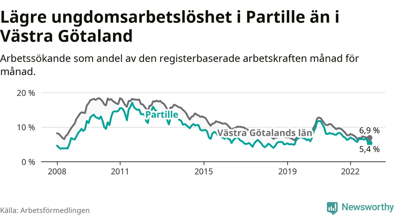 Precis som den totala arbetslösheten ligger ungdomsarbetslösheten i Partille lägre än i Västra Götaland som helhet. Skillnaden mellan kommunen och länet är 1,5 procentenheter.