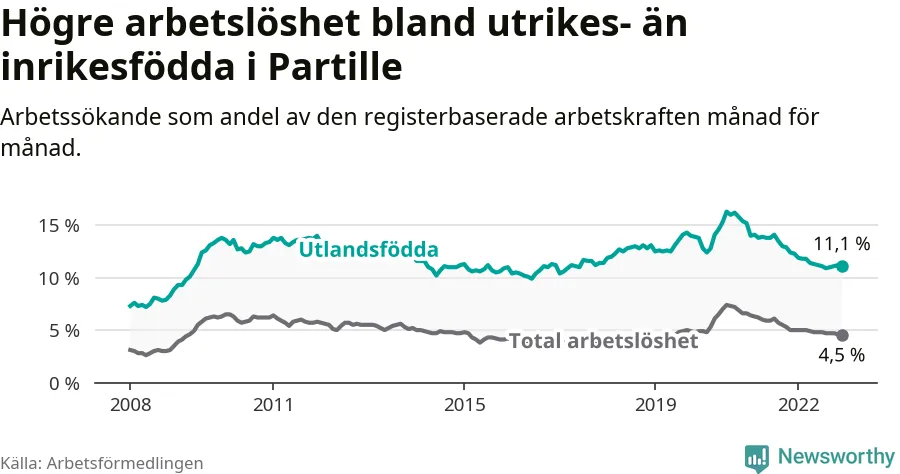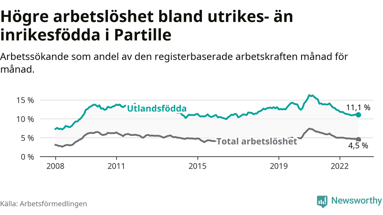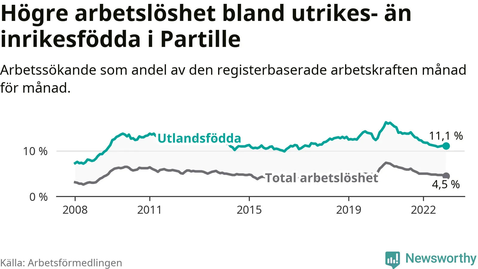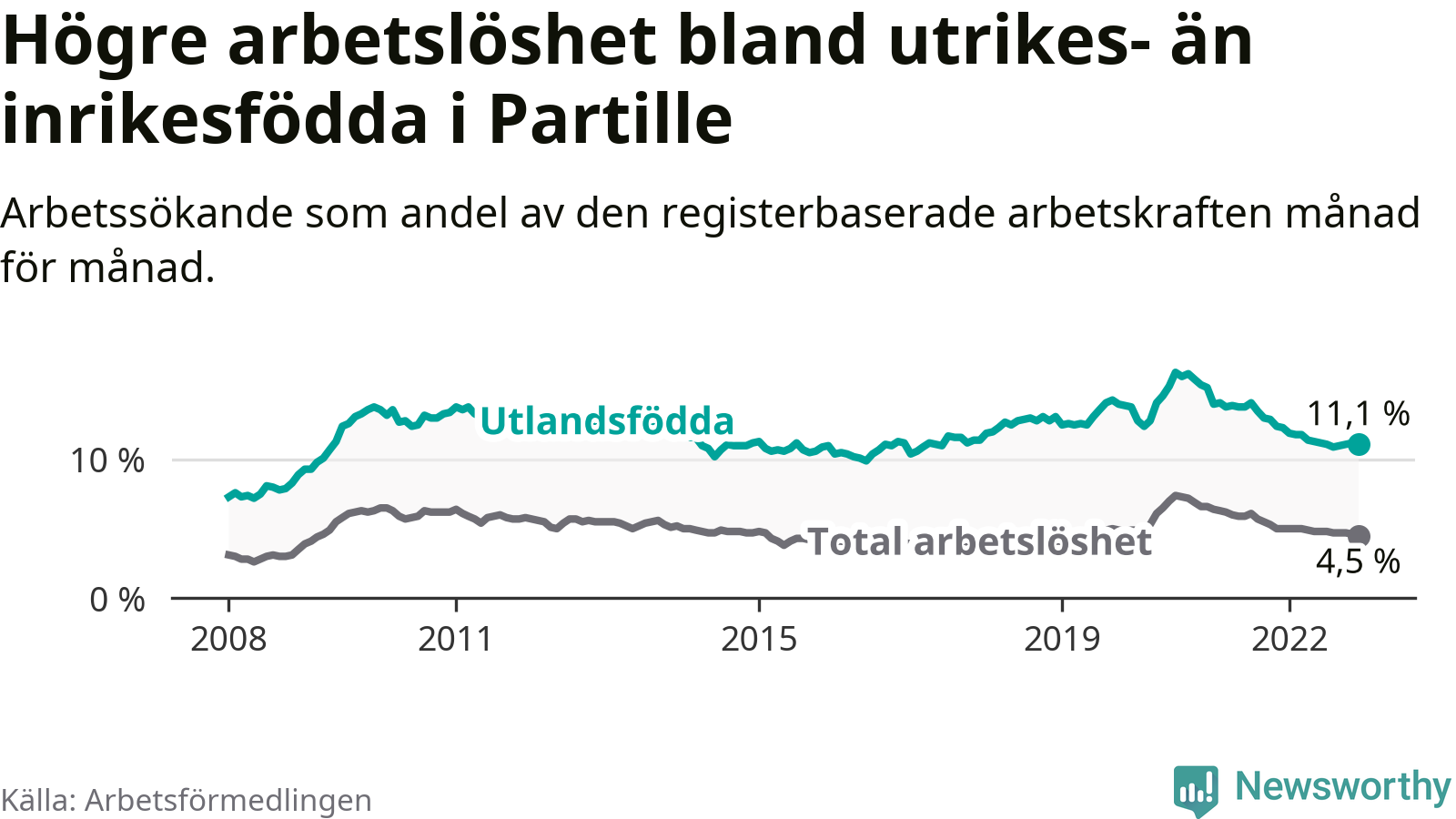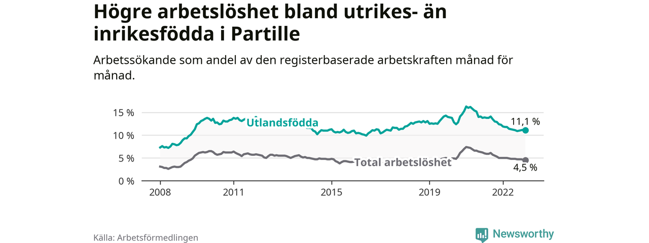 Arbetslösheten bland utlandsfödda var 11,1 procent i Partille under december månad, motsvarande 519 av 4 676 personer. Det är 1,2 procentenheter färre än vid samma tidpunkt i fjol (−52 om man räknar personer). Därmed är de utlandsföddas arbetslöshet lägre än vid samma tidpunkt i fjol för 21:a månaden i följd. Sedan mars 2021 har arbetslösheten bland utlandsfödda minskat från 13,8 till 11,1 procent.