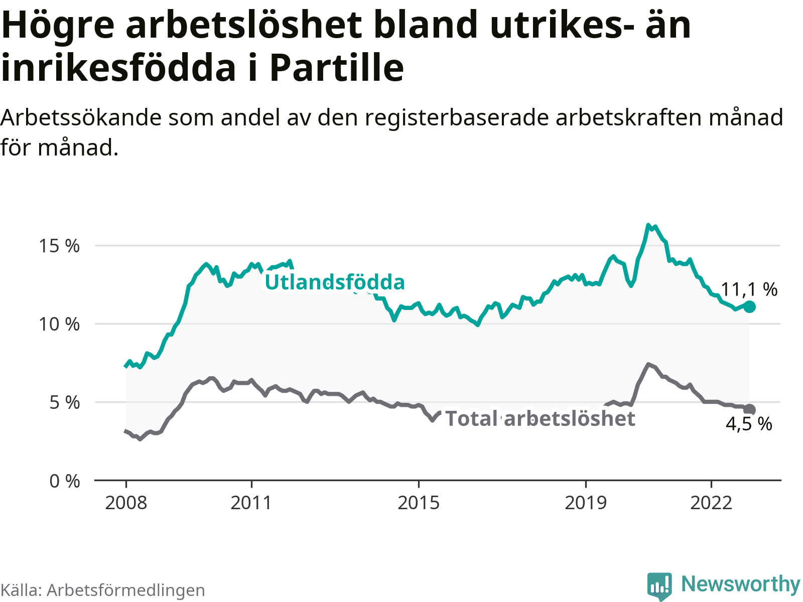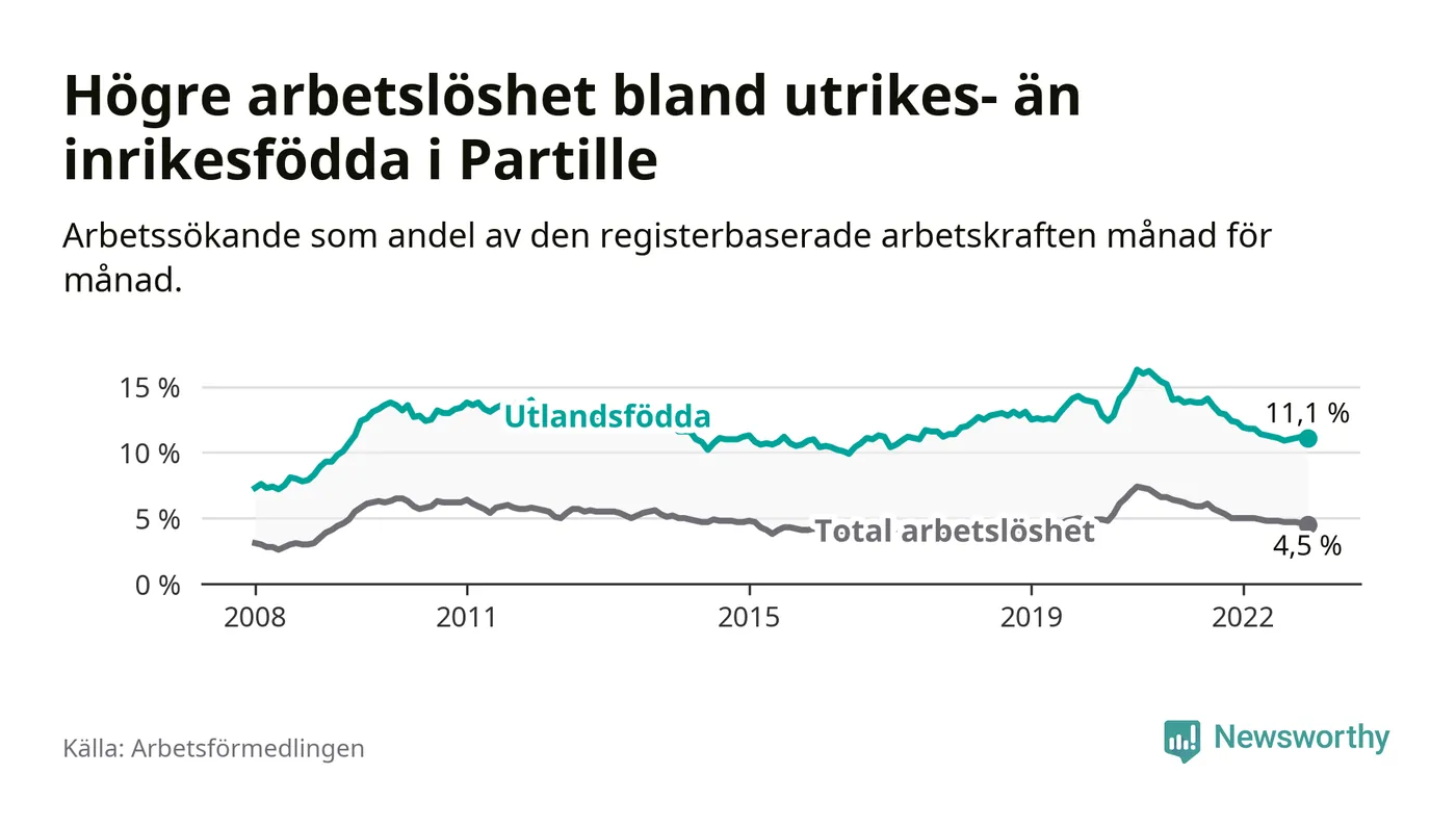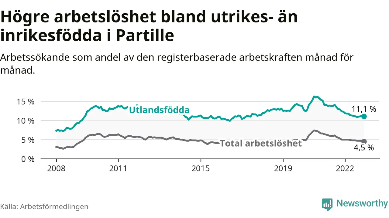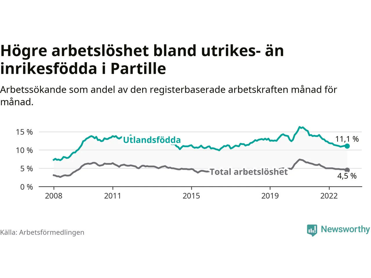 Skillnaden i arbetslöshet mellan utrikesfödda och hela befolkningen är 6,6 procentenheter i Partille. Det är en mindre skillnad än för ett år sedan (−0,7 procentenheter).