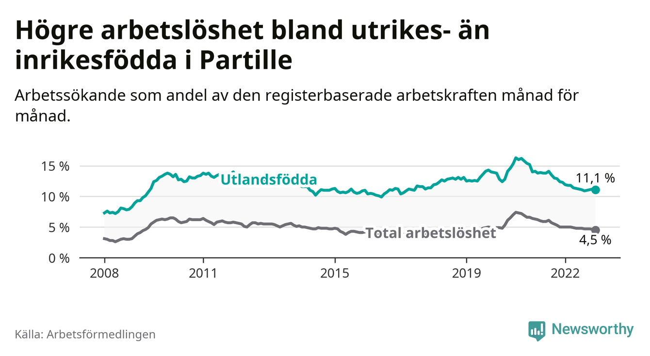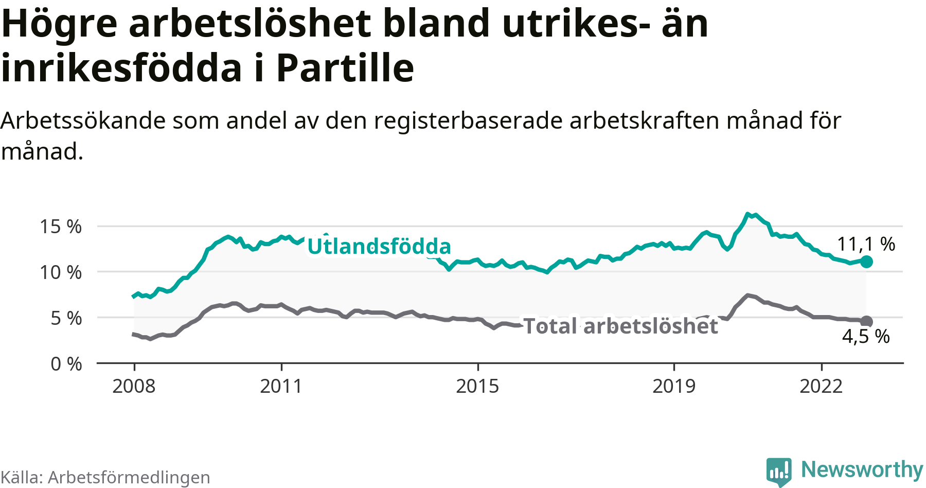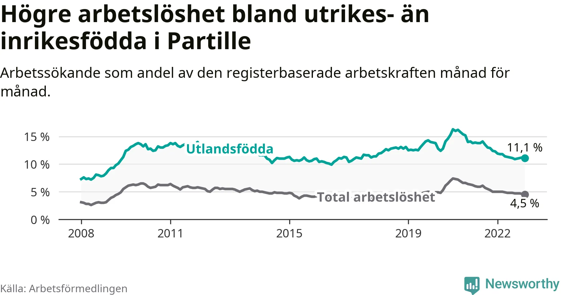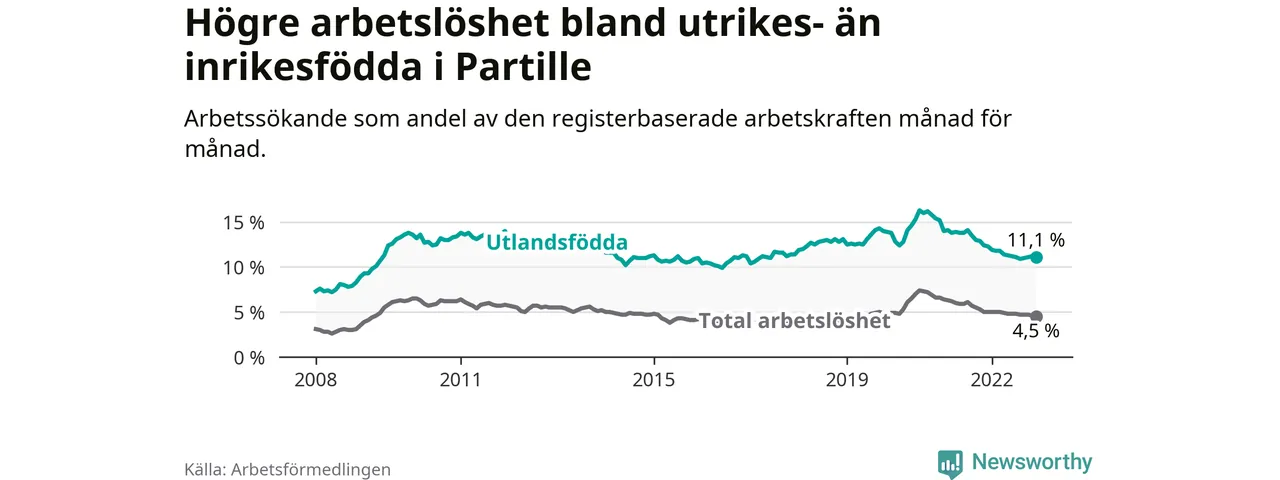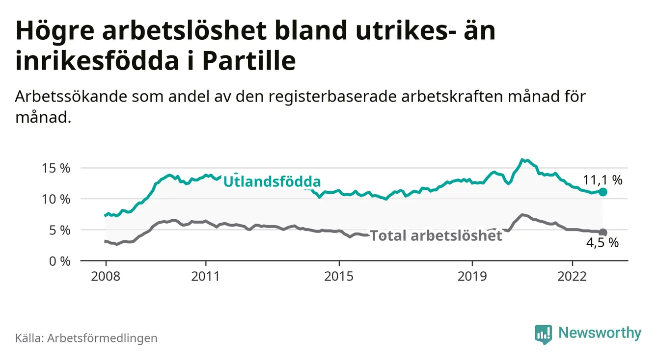 Skillnaden i arbetslöshet mellan utrikesfödda och hela befolkningen är 6,6 procentenheter i Partille. Det är en mindre skillnad än för ett år sedan (−0,7 procentenheter).