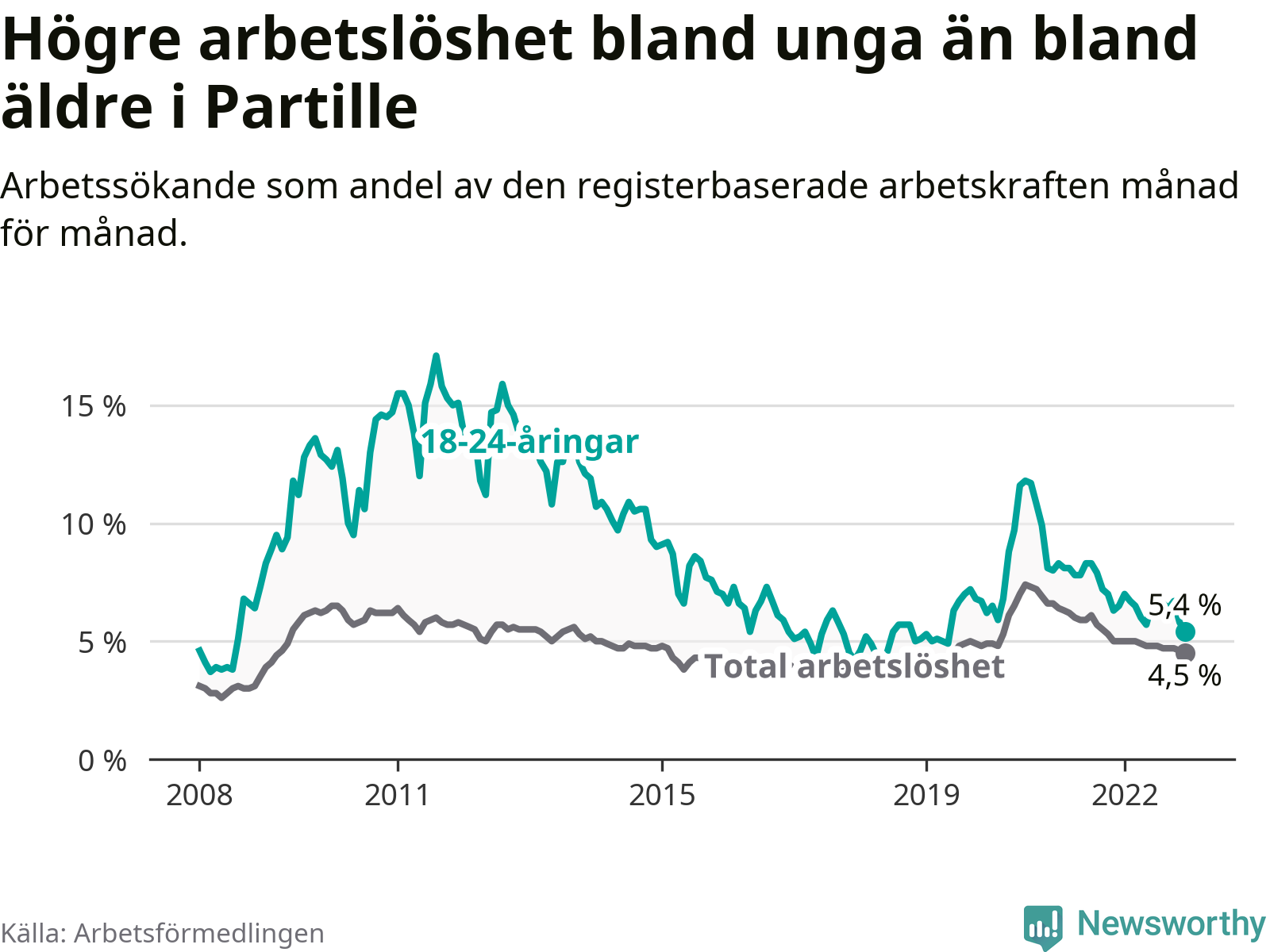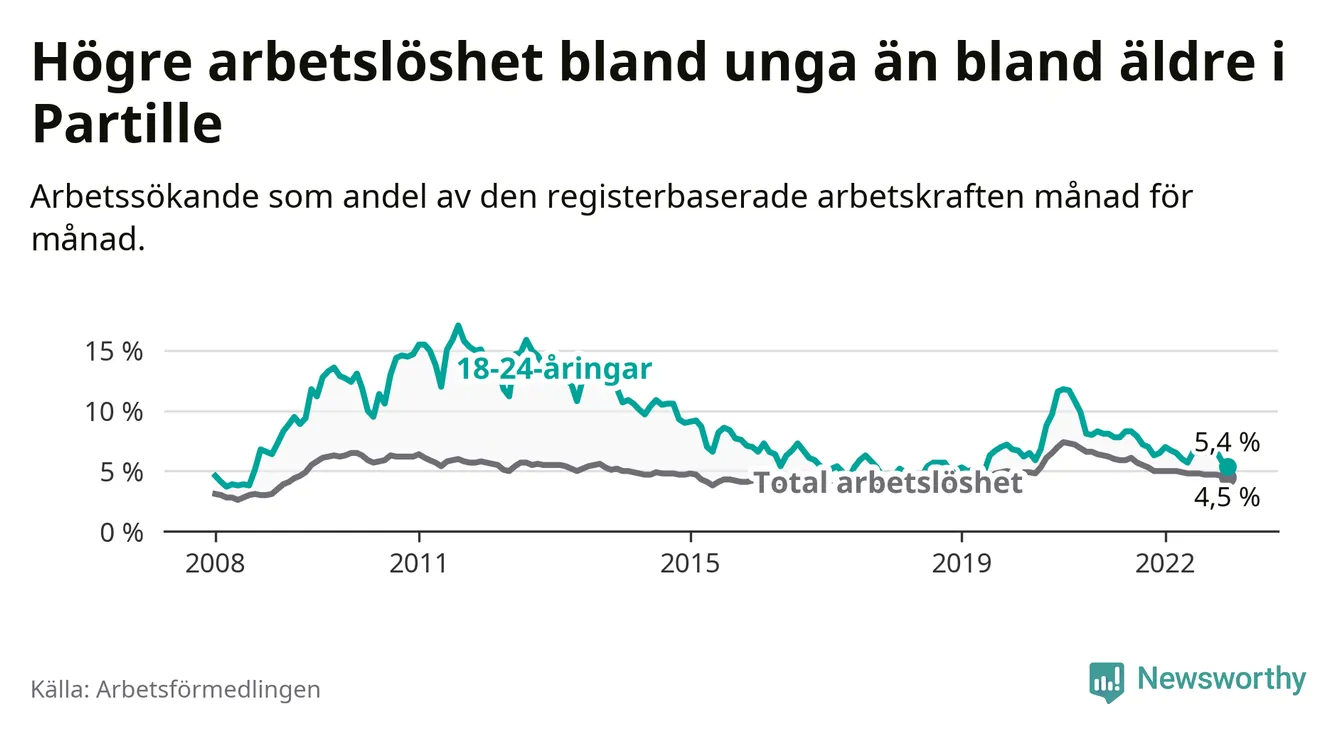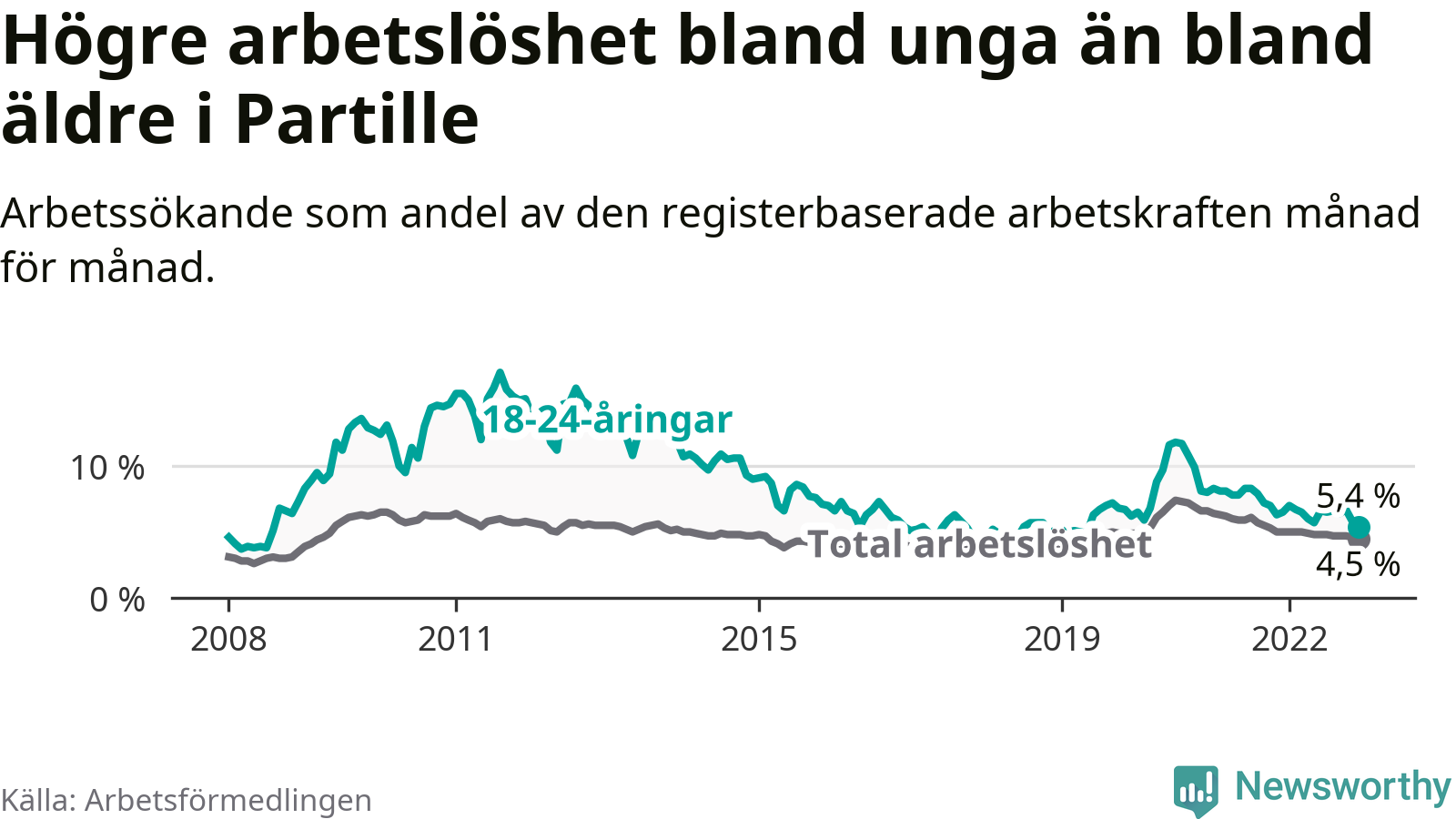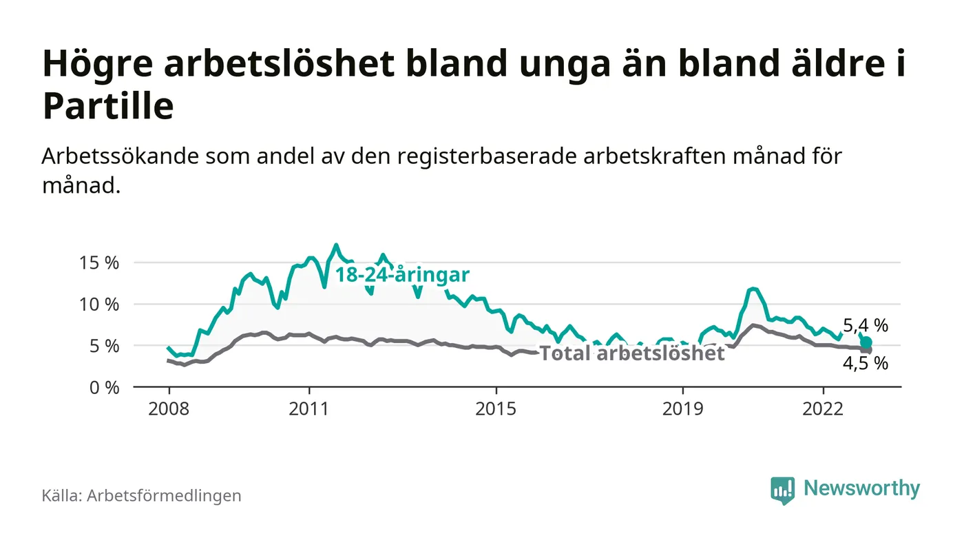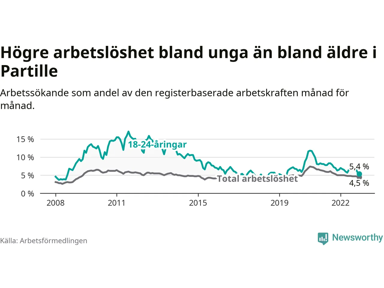 I och med den senaste månadens nedgång har de ungas arbetslöshet i Partille sjunkit 21 månader i följd (ner från 8,1 procent i mars 2021 till 5,4 procent nu). Den nuvarande arbetslöshetsnivån är den lägsta sedan maj 2019.
