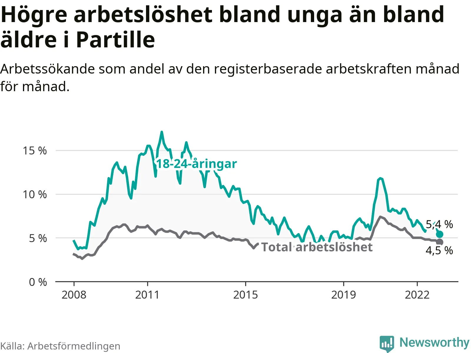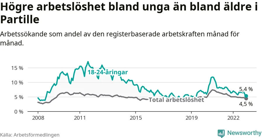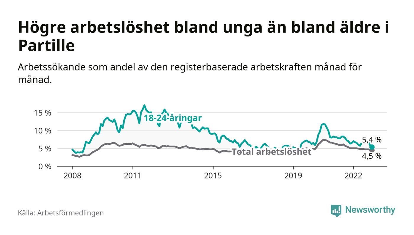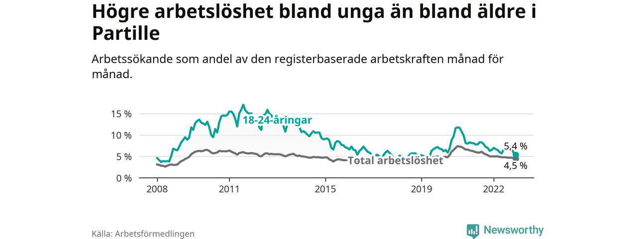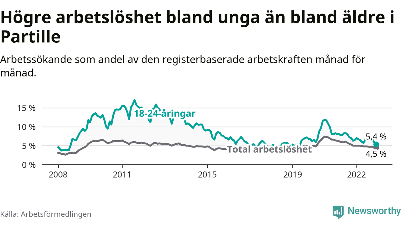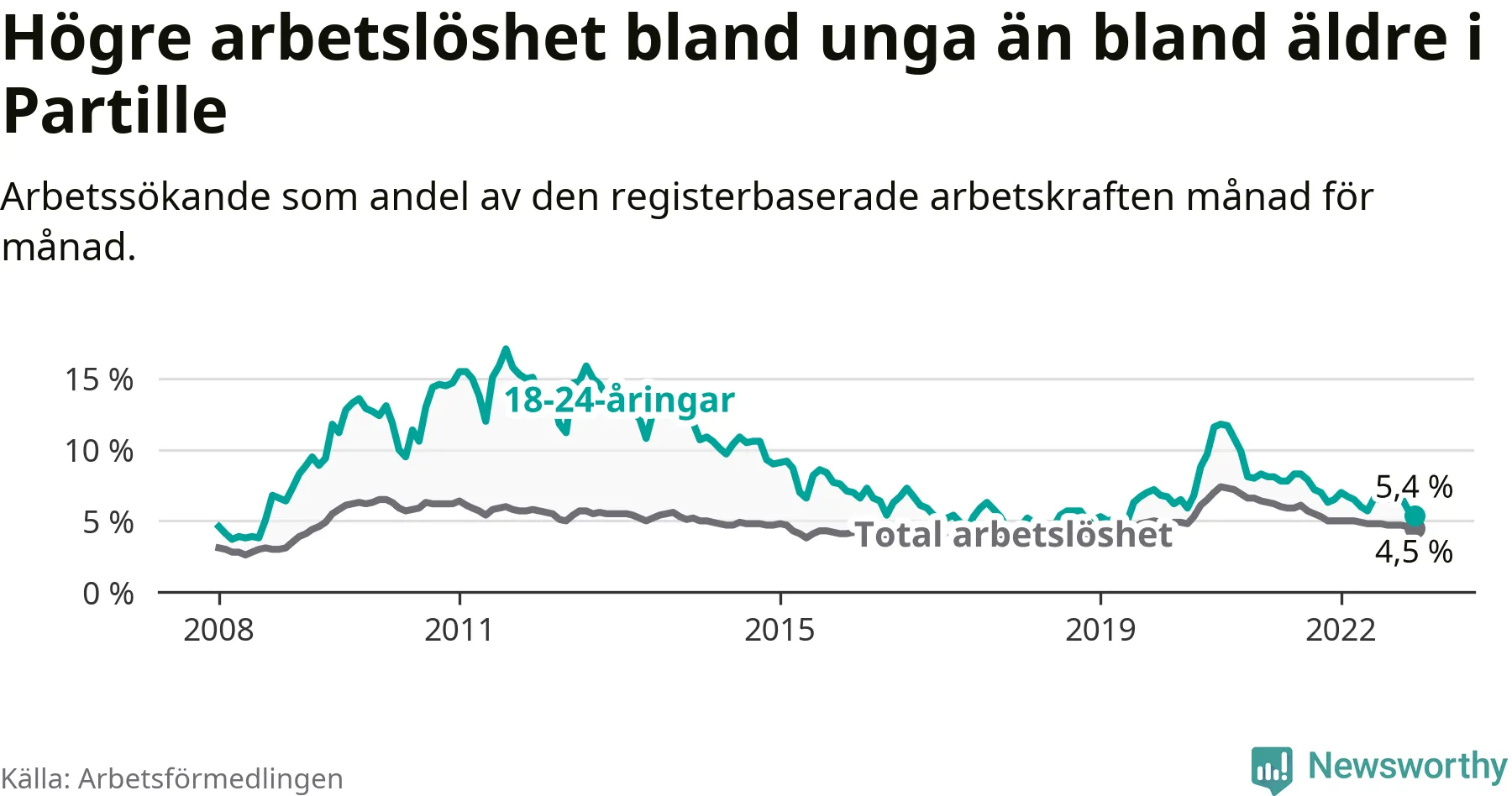 I och med den senaste månadens nedgång har de ungas arbetslöshet i Partille sjunkit 21 månader i följd (ner från 8,1 procent i mars 2021 till 5,4 procent nu). Den nuvarande arbetslöshetsnivån är den lägsta sedan maj 2019.