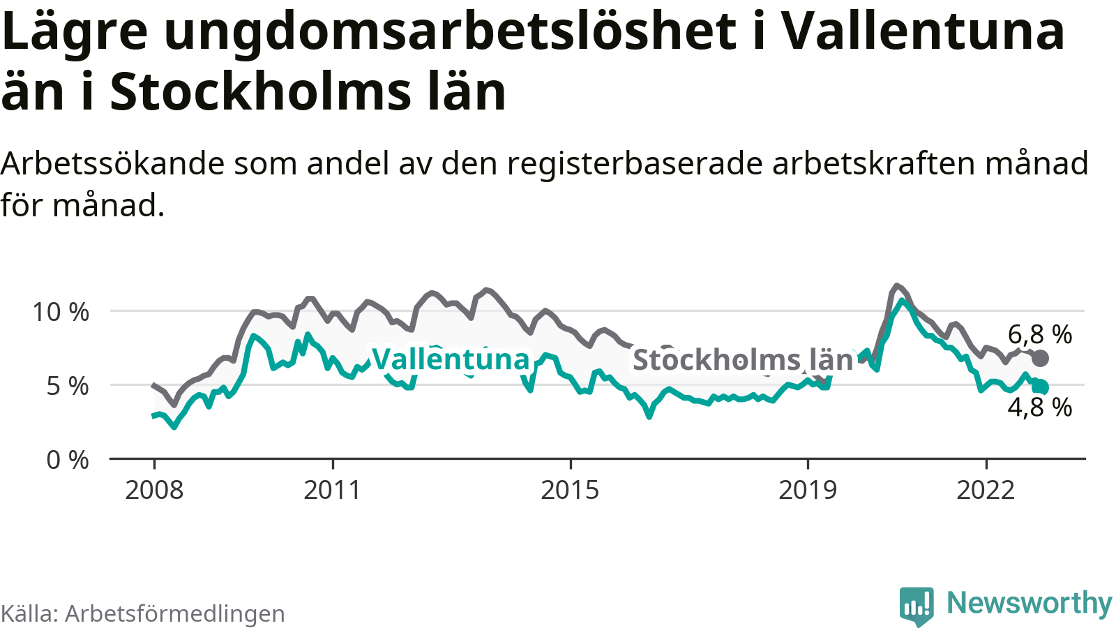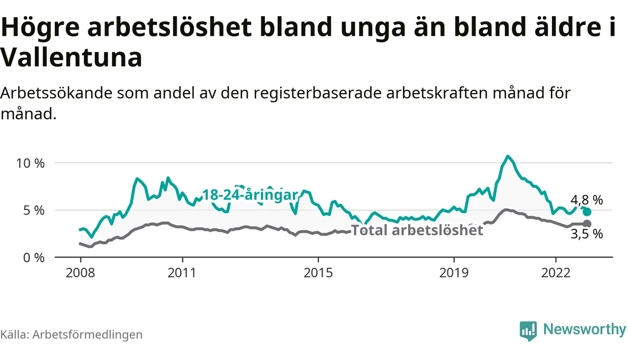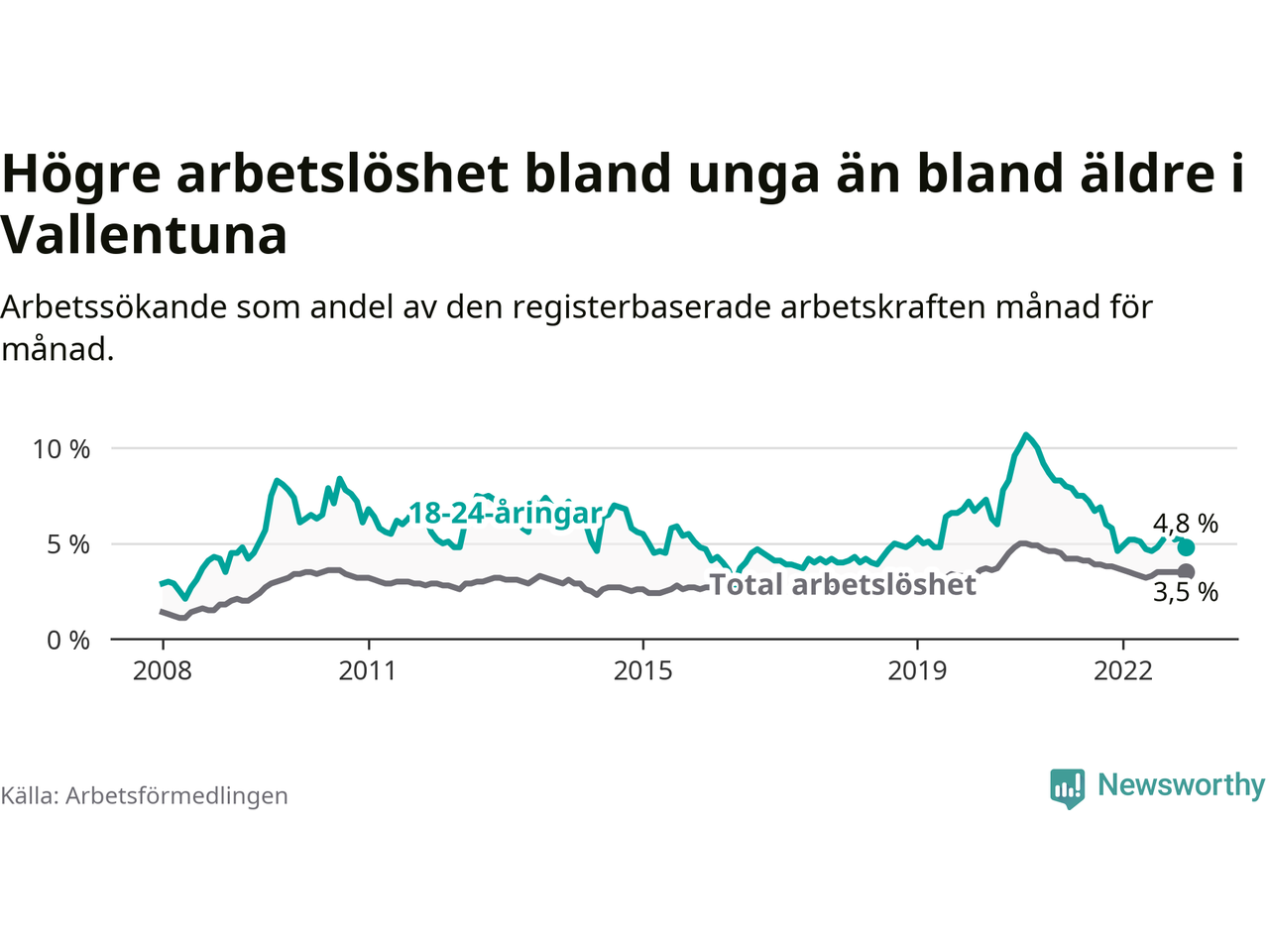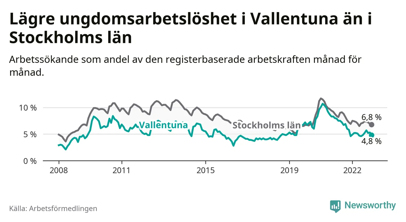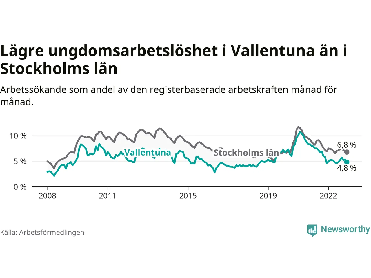 Graf: Arbetslöshet bland unga i Vallentuna kommun och Stockholms län
