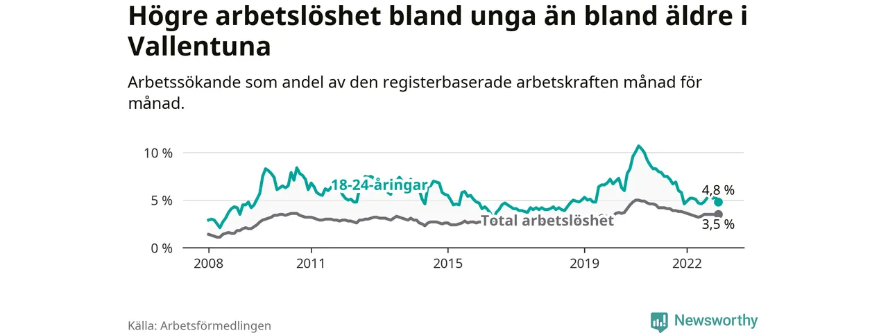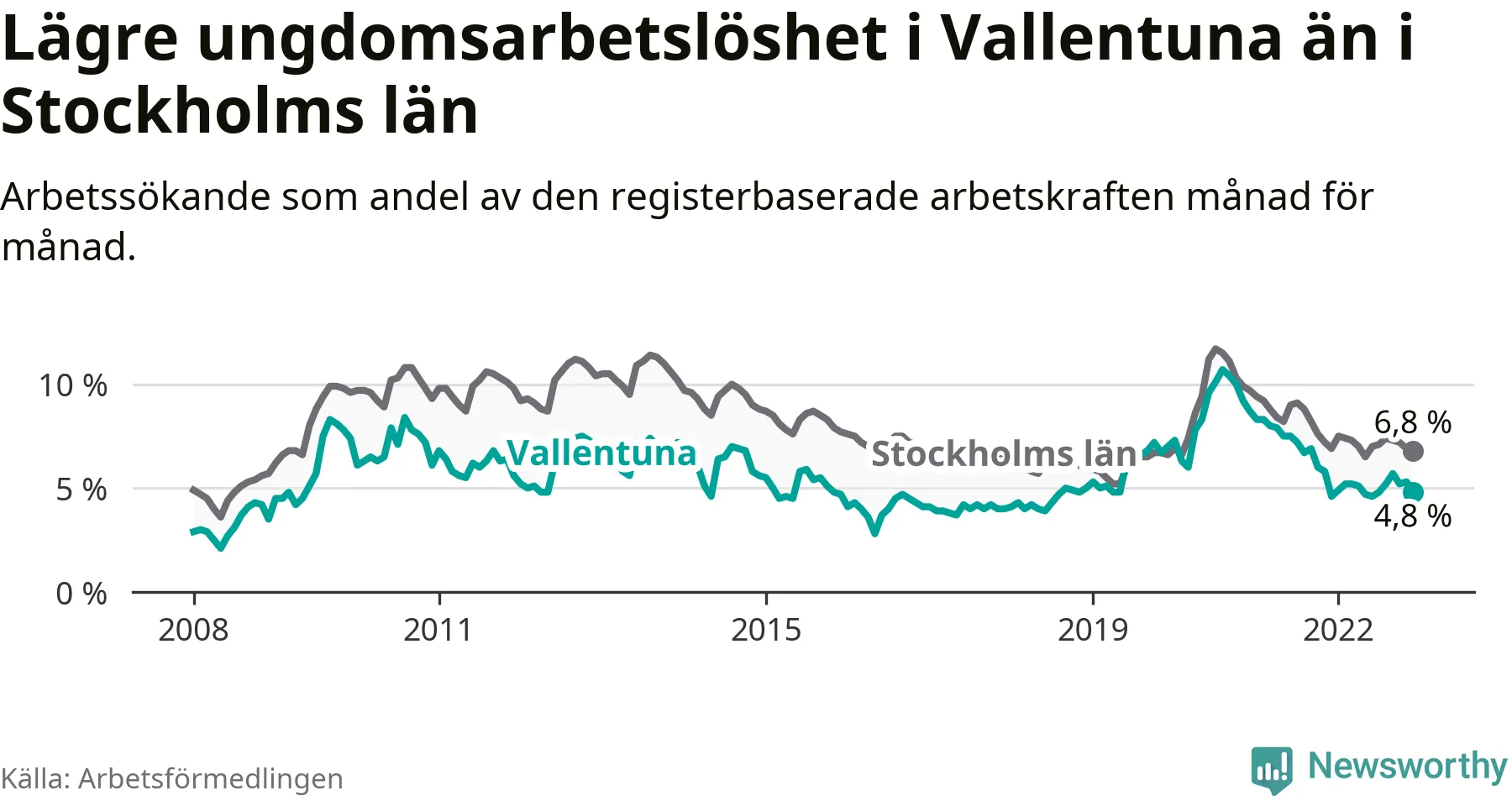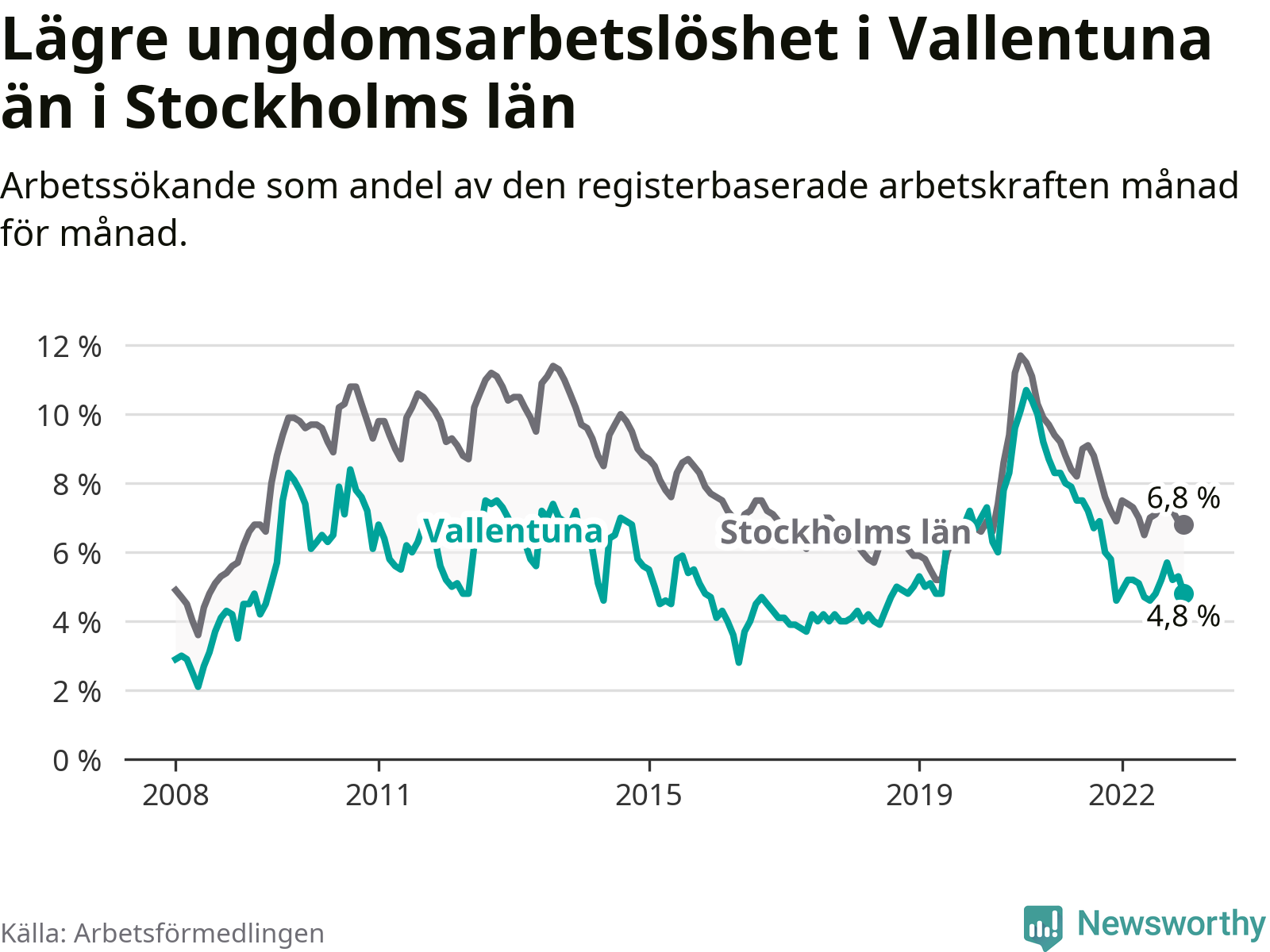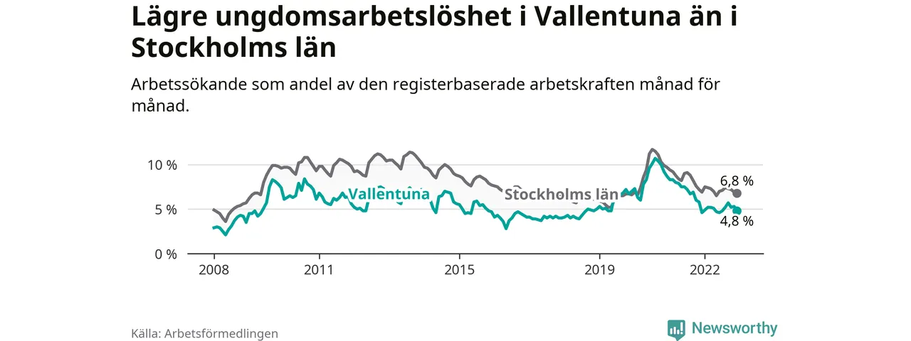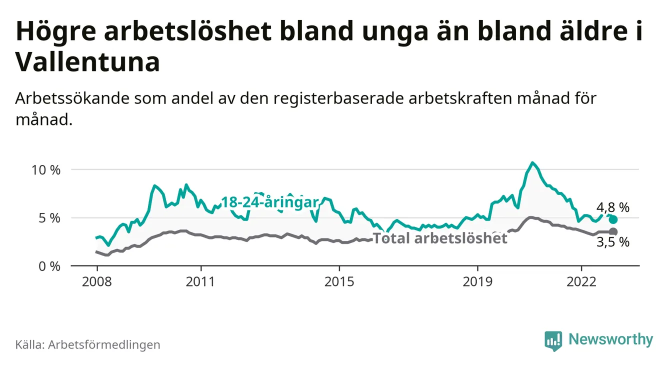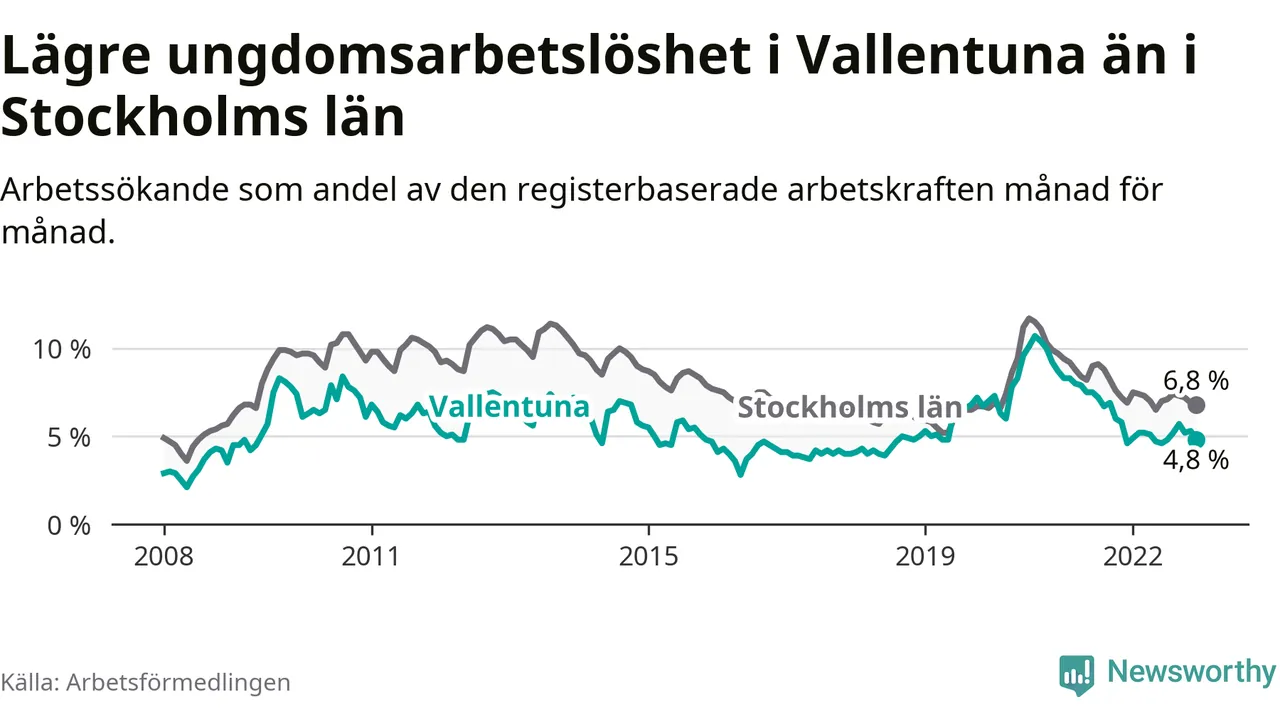 Graf: Arbetslöshet bland unga i Vallentuna kommun och Stockholms län