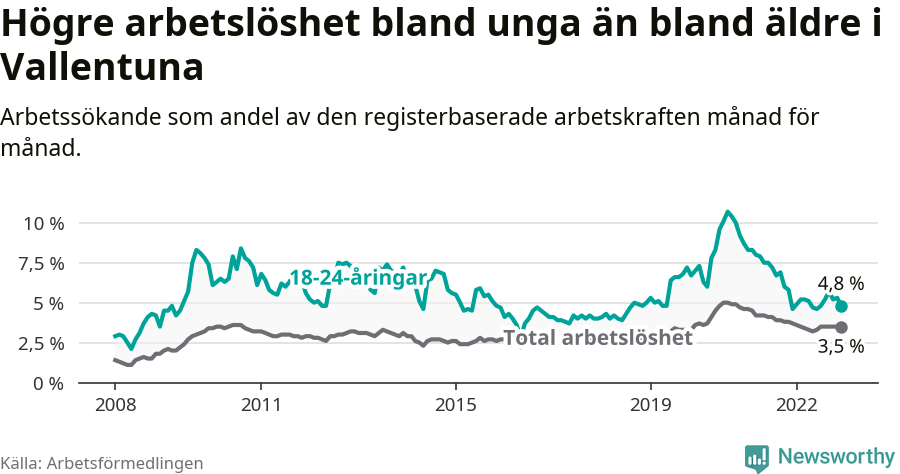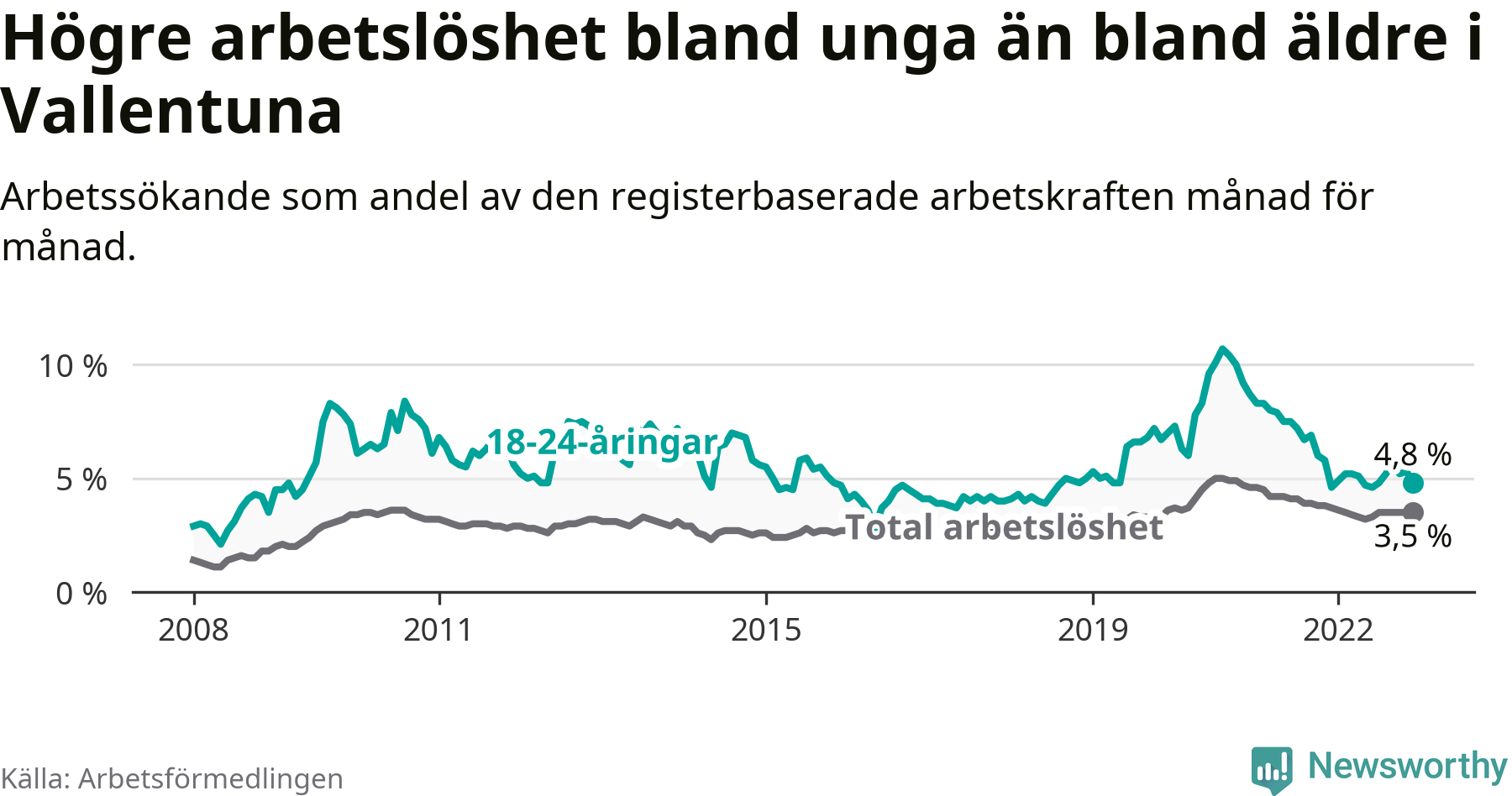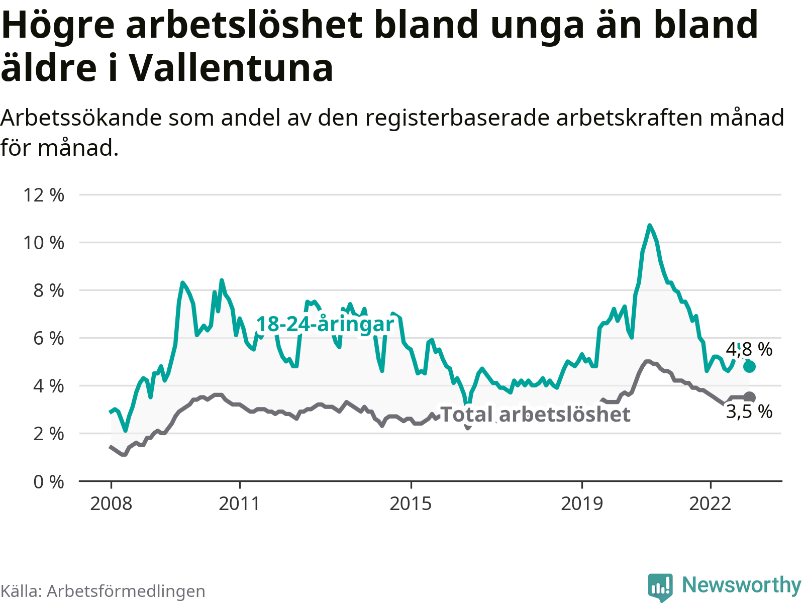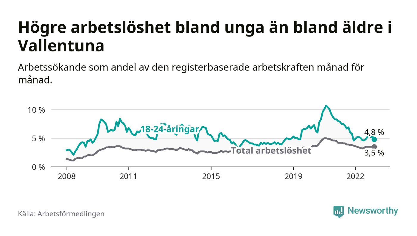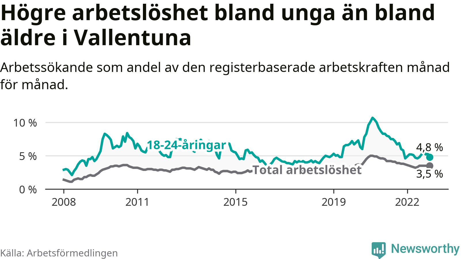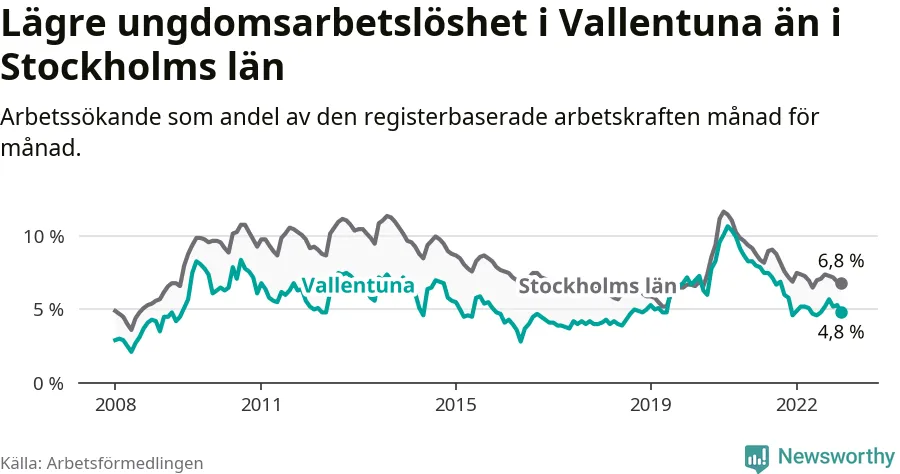 Graf: Arbetslöshet bland unga i Vallentuna kommun och Stockholms län