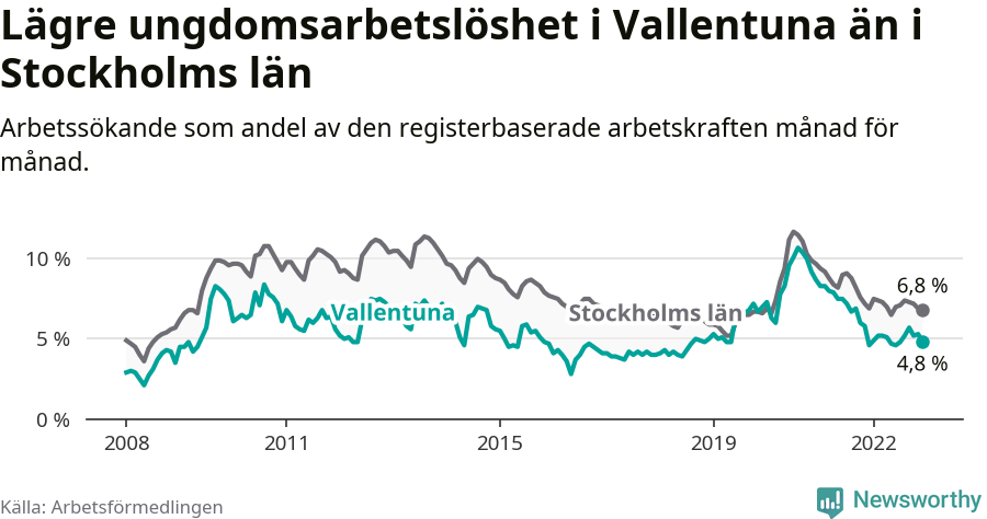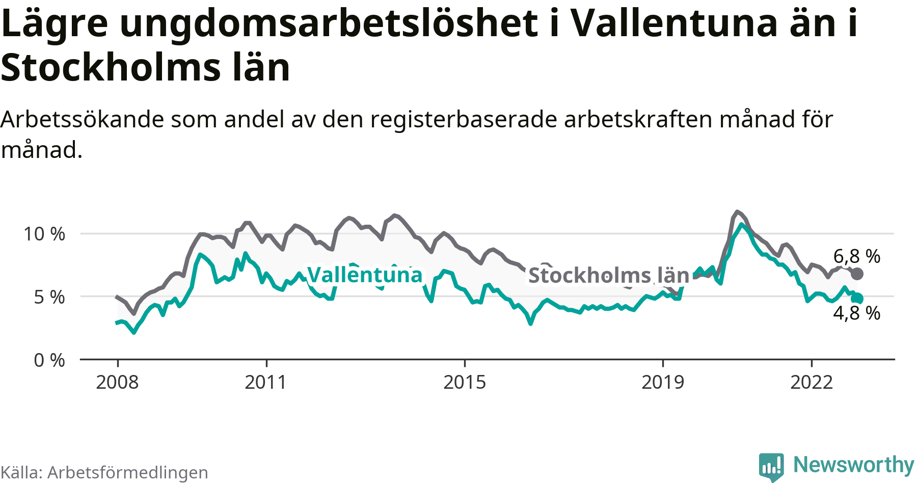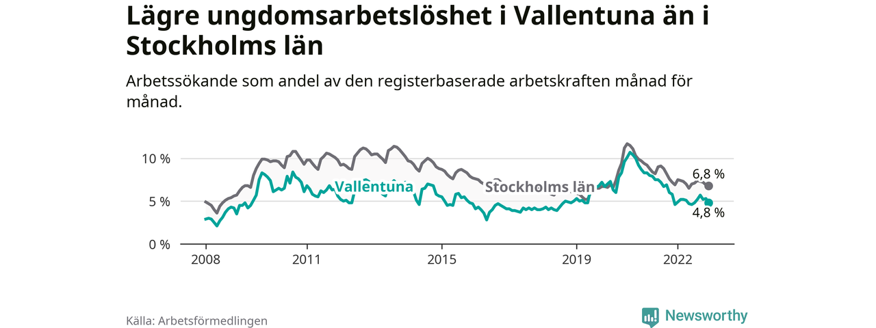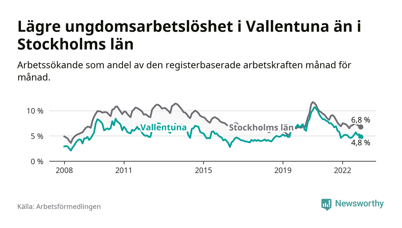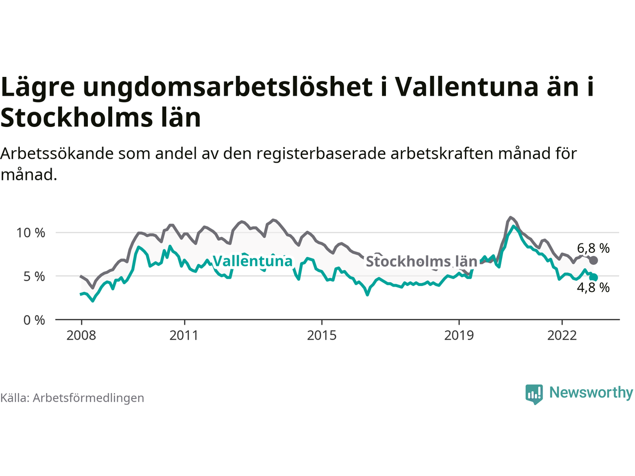 Precis som den totala arbetslösheten ligger ungdomsarbetslösheten i Vallentuna lägre än i Stockholms län som helhet. Skillnaden mellan kommunen och länet är 2,0 procentenheter.