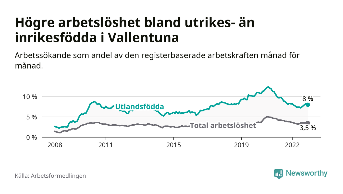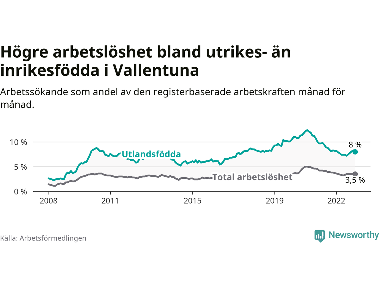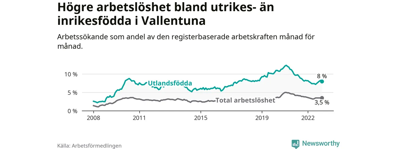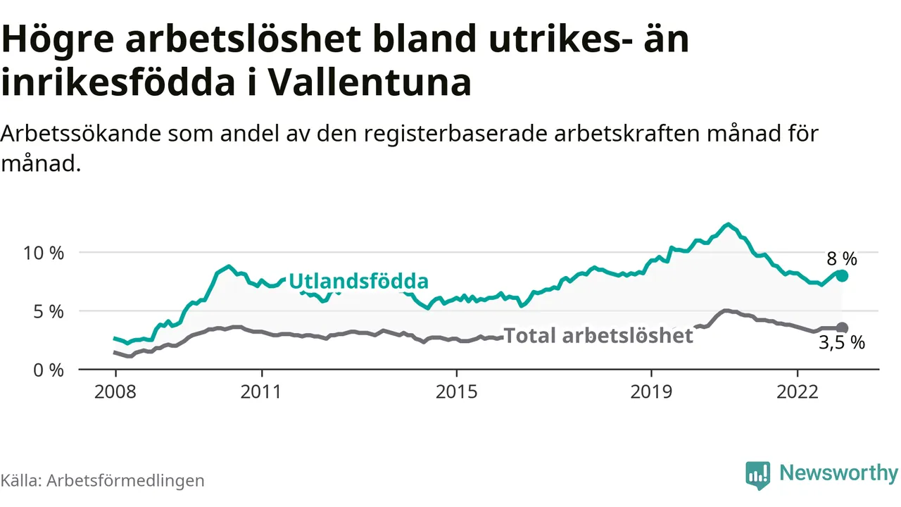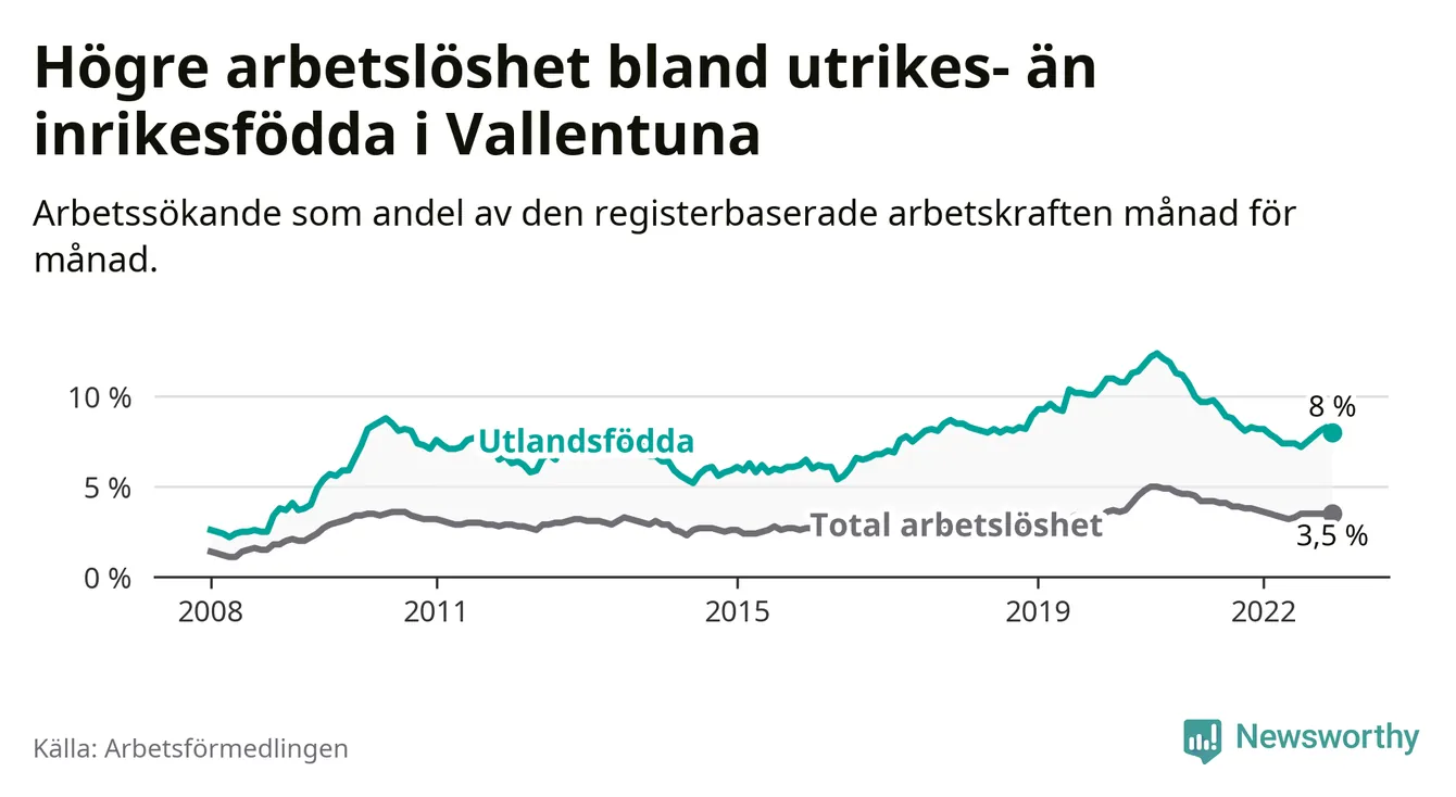 Skillnaden i arbetslöshet mellan utrikesfödda och hela befolkningen är 4,5 procentenheter i Vallentuna. Det är ungefär samma skillnad som för ett år sedan.
