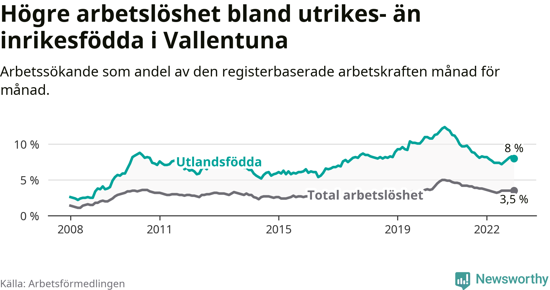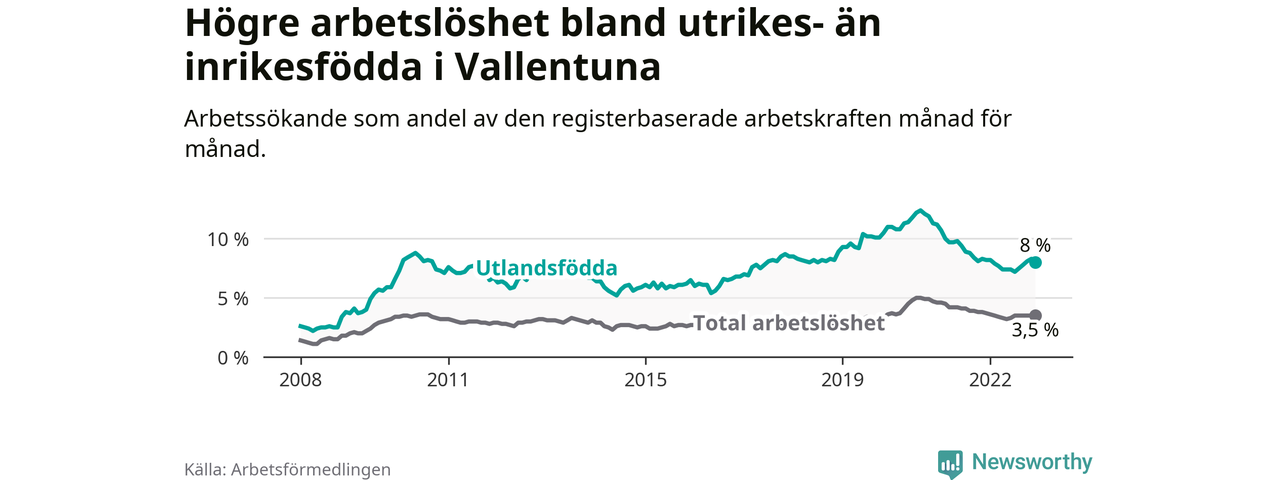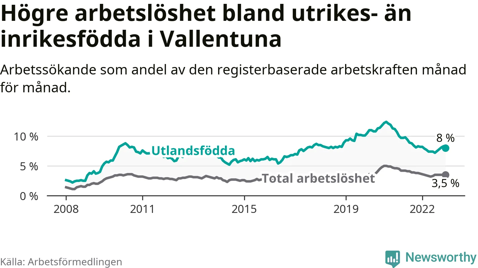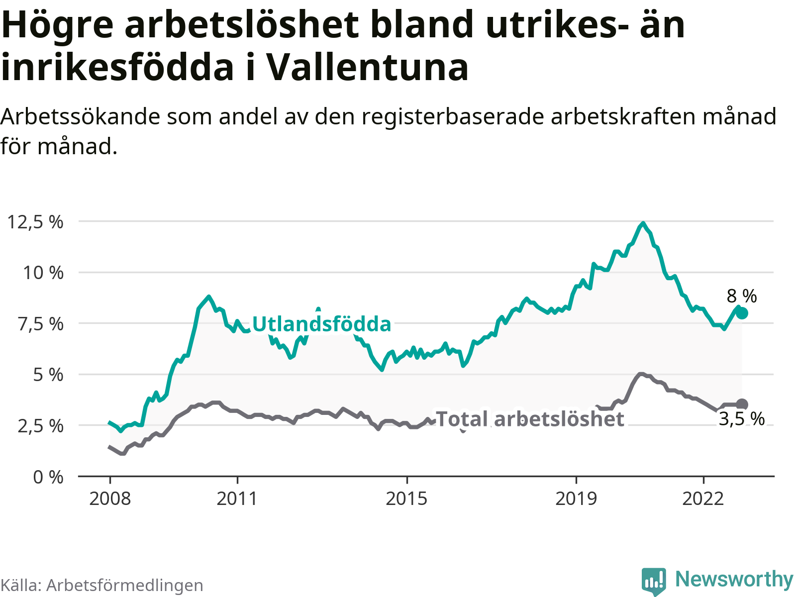 Skillnaden i arbetslöshet mellan utrikesfödda och hela befolkningen är 4,5 procentenheter i Vallentuna. Det är ungefär samma skillnad som för ett år sedan.