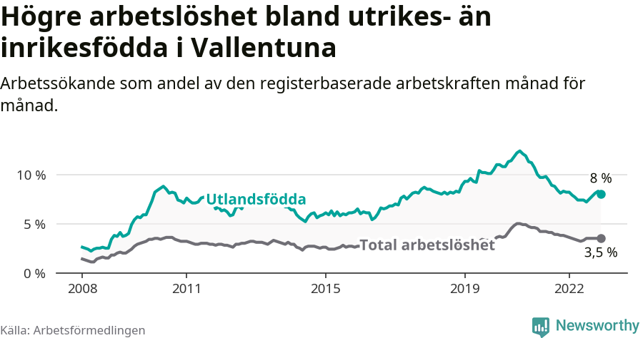 Arbetslösheten bland utlandsfödda var 8,0 procent i Vallentuna under december månad, motsvarande 253 av 3 163 personer. Det är 0,2 procentenheter färre än vid samma tidpunkt i fjol (−2 om man räknar personer). Den senaste månadens nedgång innebär ett trendbrott. Under de ett föregående månaderna hade arbetslösheten bland utlandsfödda varit högre än motsvarande tidpunkt året innan.