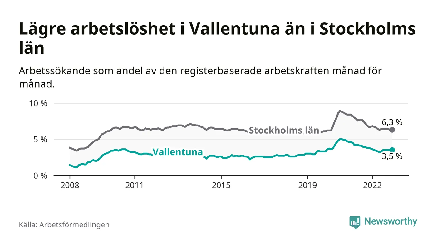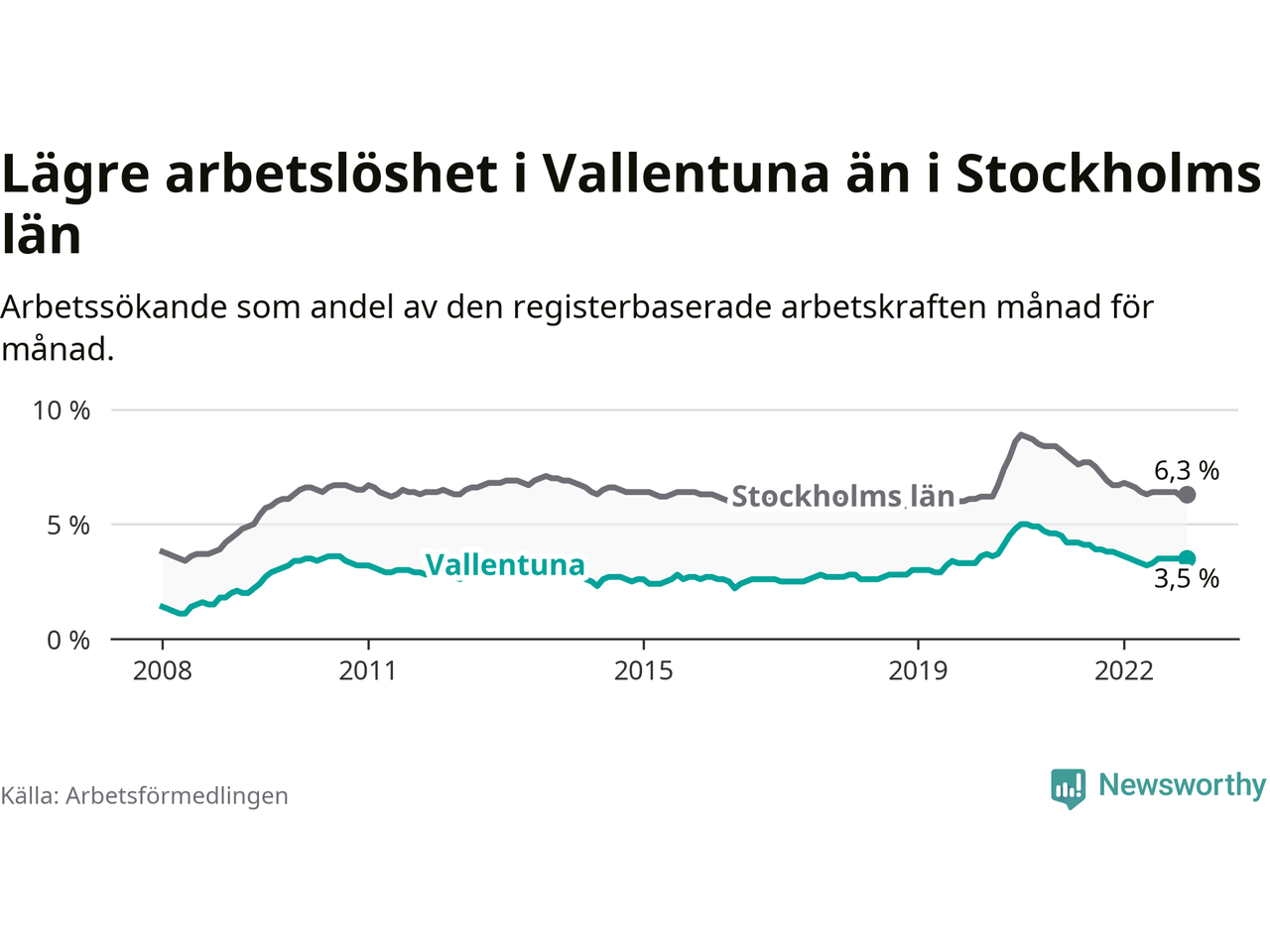 Vallentuna hade redan tidigare lägre arbetslöshet än snittet i hela Stockholms län och nu växer klyftan (3,5 procent i kommunen, jämfört med 6,3 procent i hela länet). Ekerö och Vaxholm har den lägsta arbetslösheten i länet (3,2 procent), medan Botkyrka har den högsta (11,1 procent). För att Vallentuna skulle komma ner i samma arbetslöshetsnivå som Ekerö och Vaxholm skulle 52 personer behöva sysselsättas.