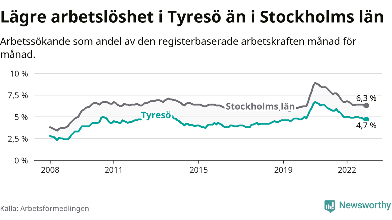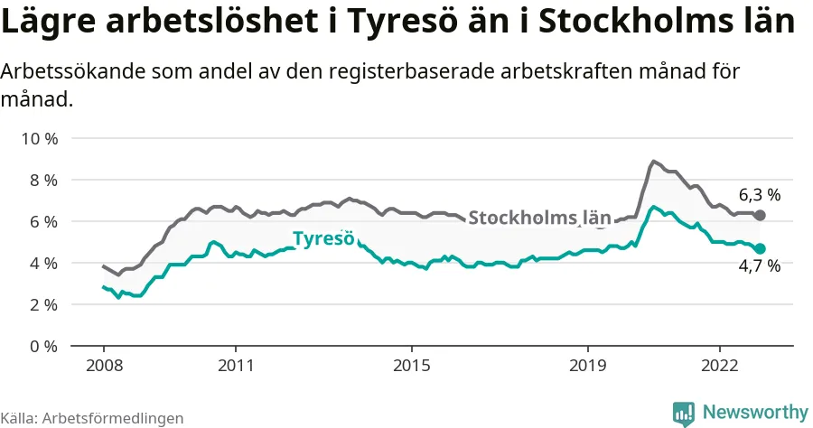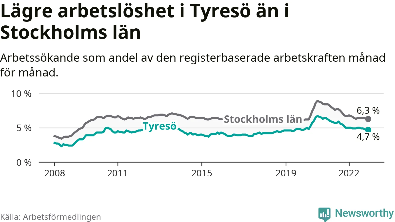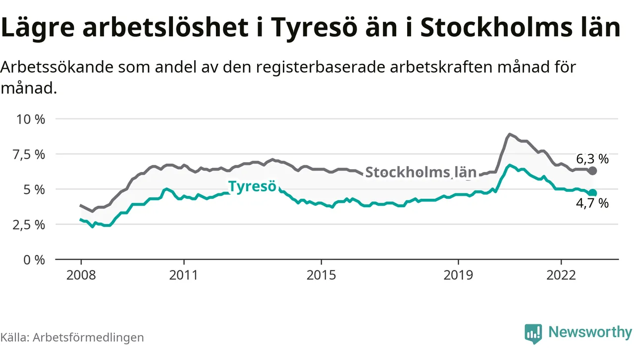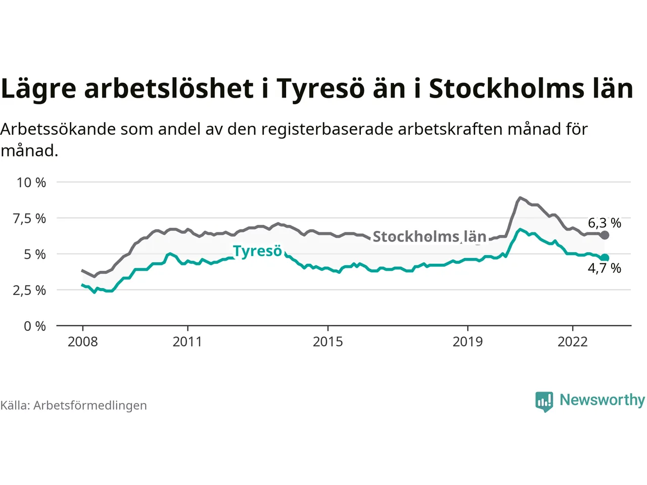 Det är 20:e månaden i följd som arbetslösheten i Tyresö är lägre än den var under samma tidpunkt året innan. Sedan april 2021 har arbetslösheten gått ner från 5,8 till 4,7 procent.