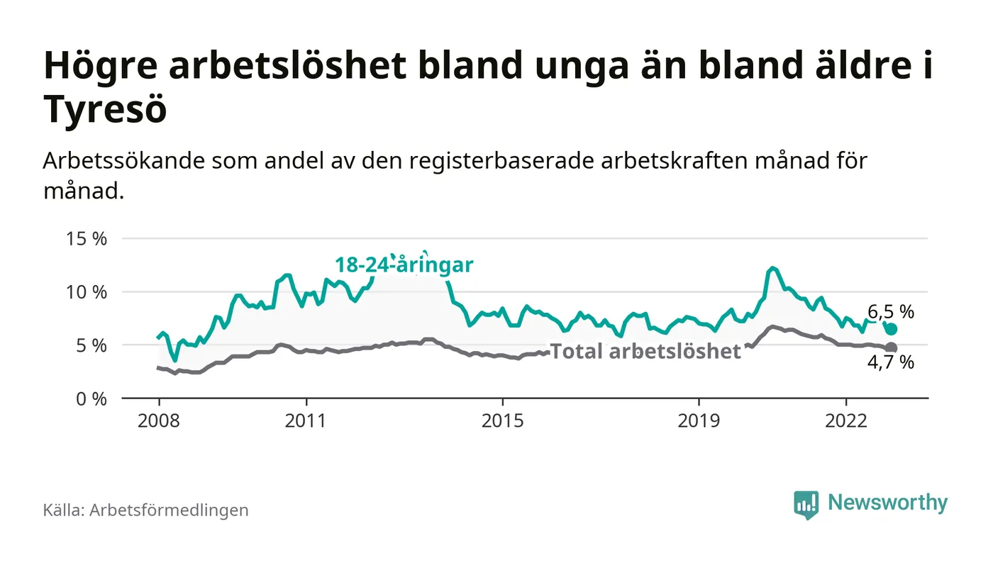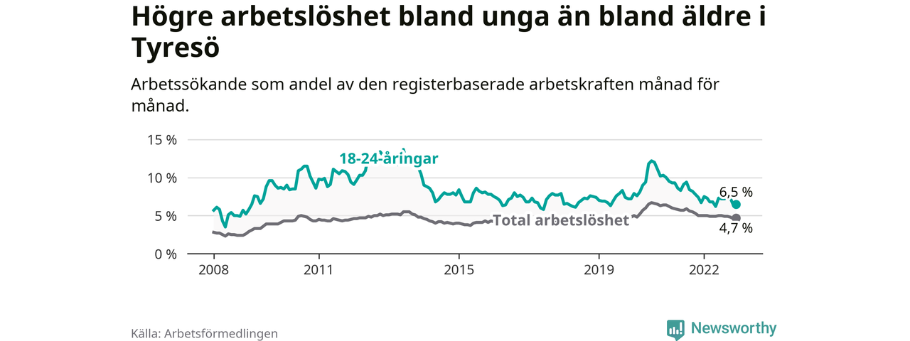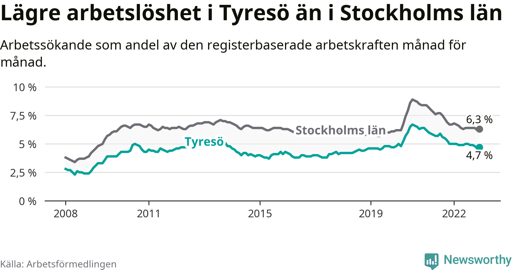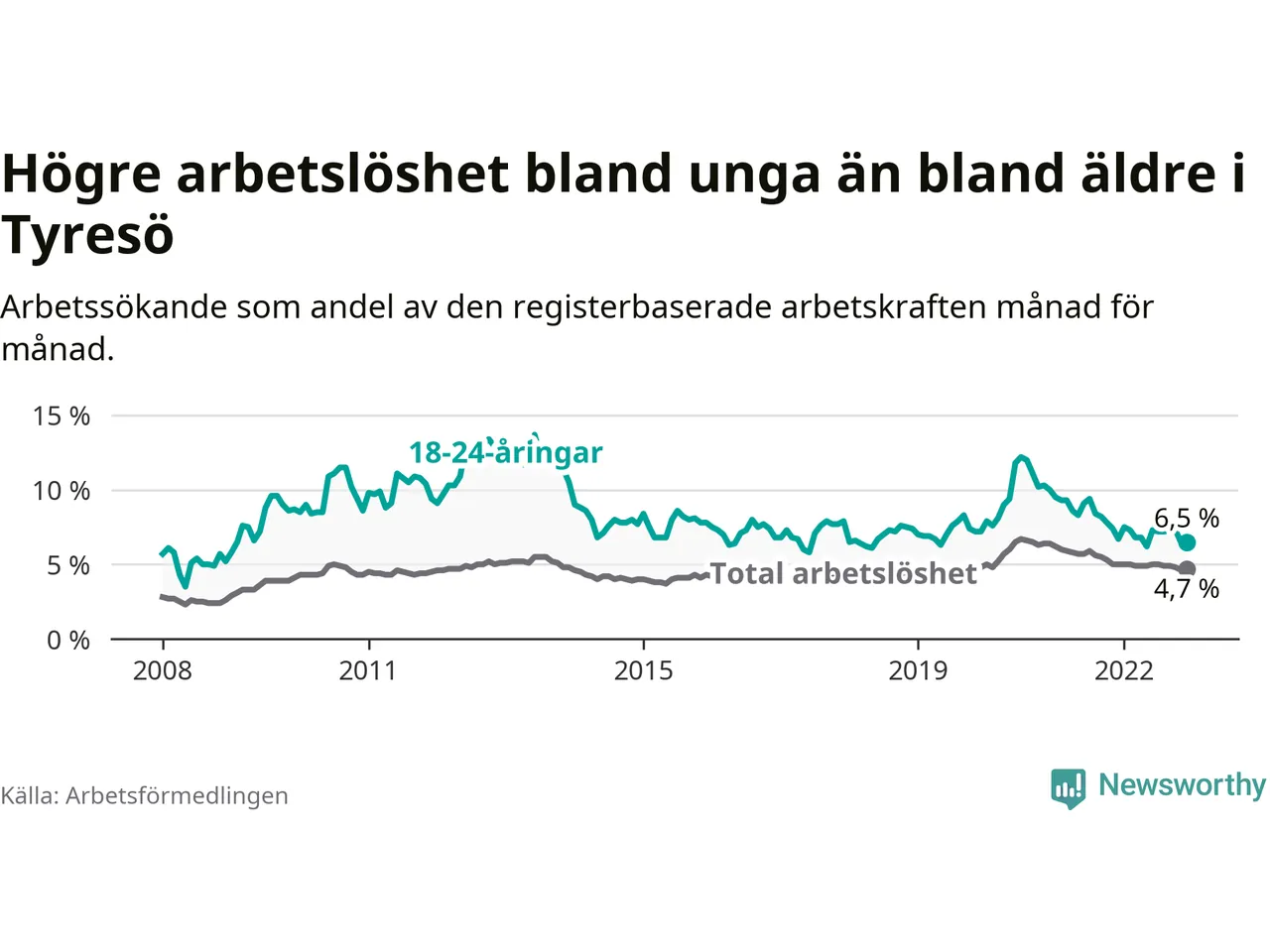 Det är 20:e månaden i följd som arbetslösheten i Tyresö är lägre än den var under samma tidpunkt året innan. Sedan april 2021 har arbetslösheten gått ner från 5,8 till 4,7 procent.