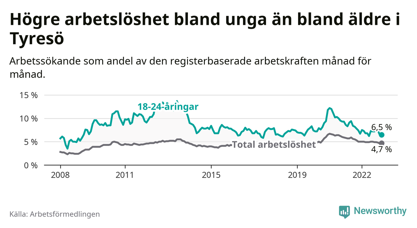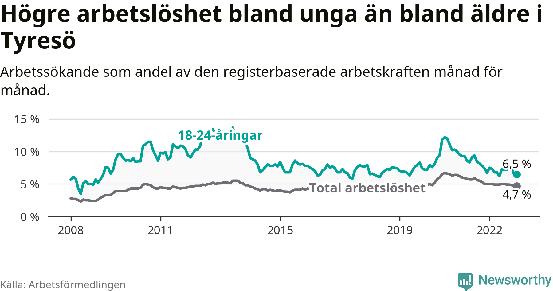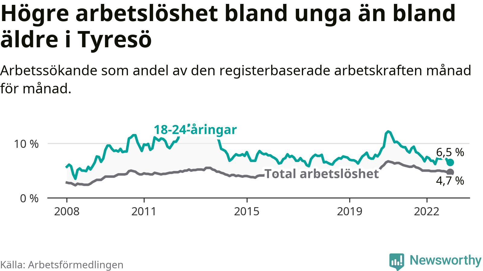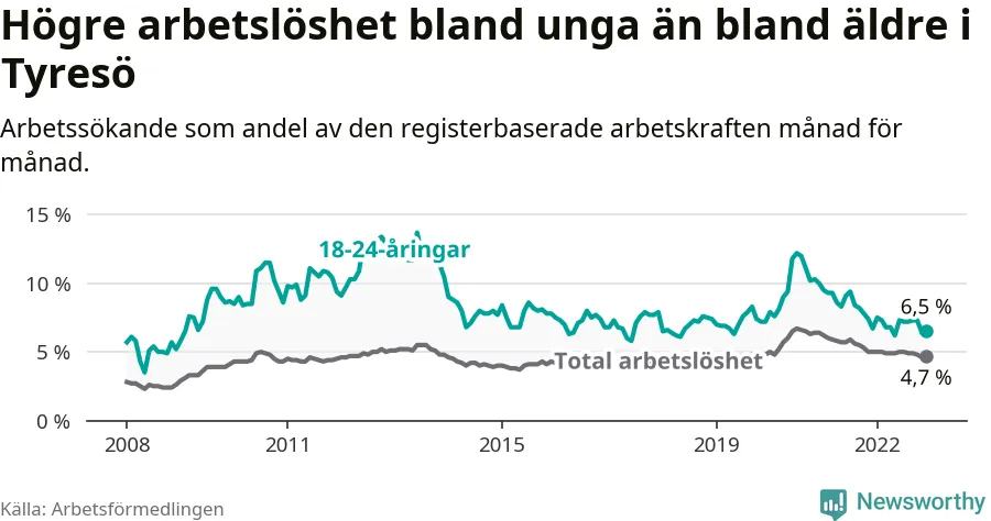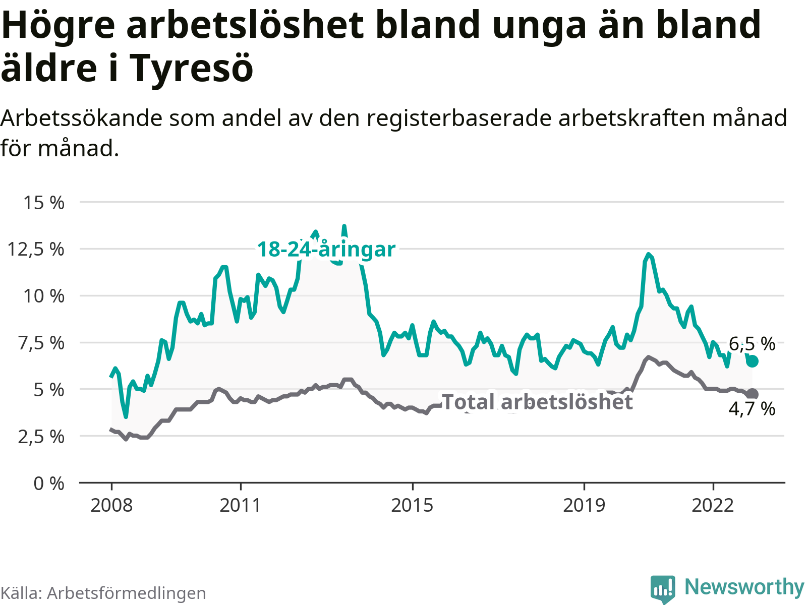 Det är 20:e månaden i följd som arbetslösheten i Tyresö är lägre än den var under samma tidpunkt året innan. Sedan april 2021 har arbetslösheten gått ner från 5,8 till 4,7 procent.