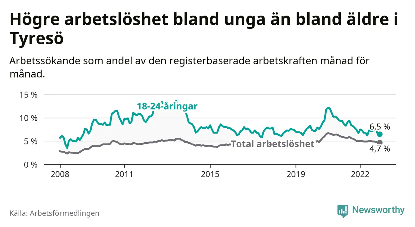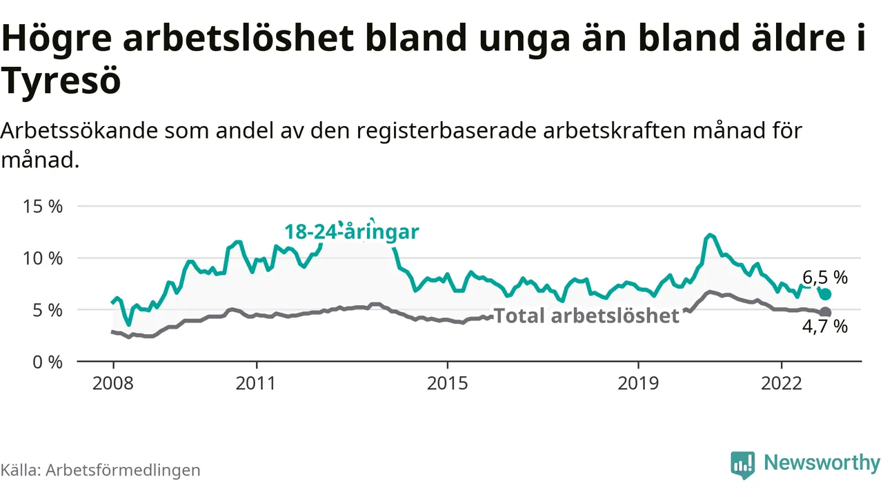I och med den senaste månadens nedgång har de ungas arbetslöshet i Tyresö sjunkit 21 månader i följd (ner från 9,3 procent i mars 2021 till 6,5 procent nu).