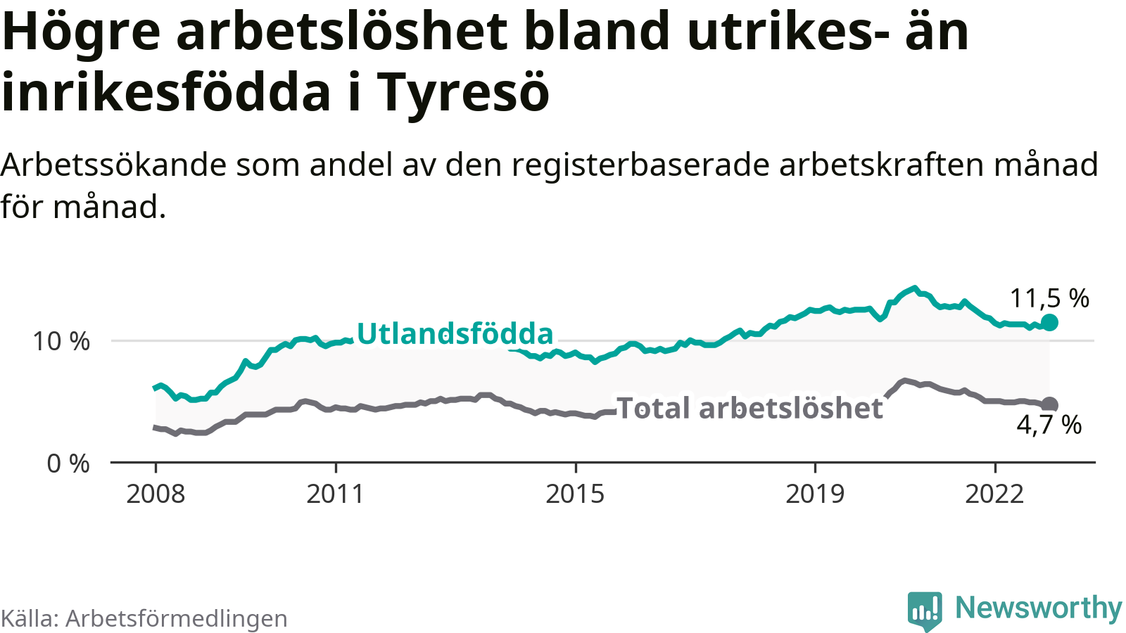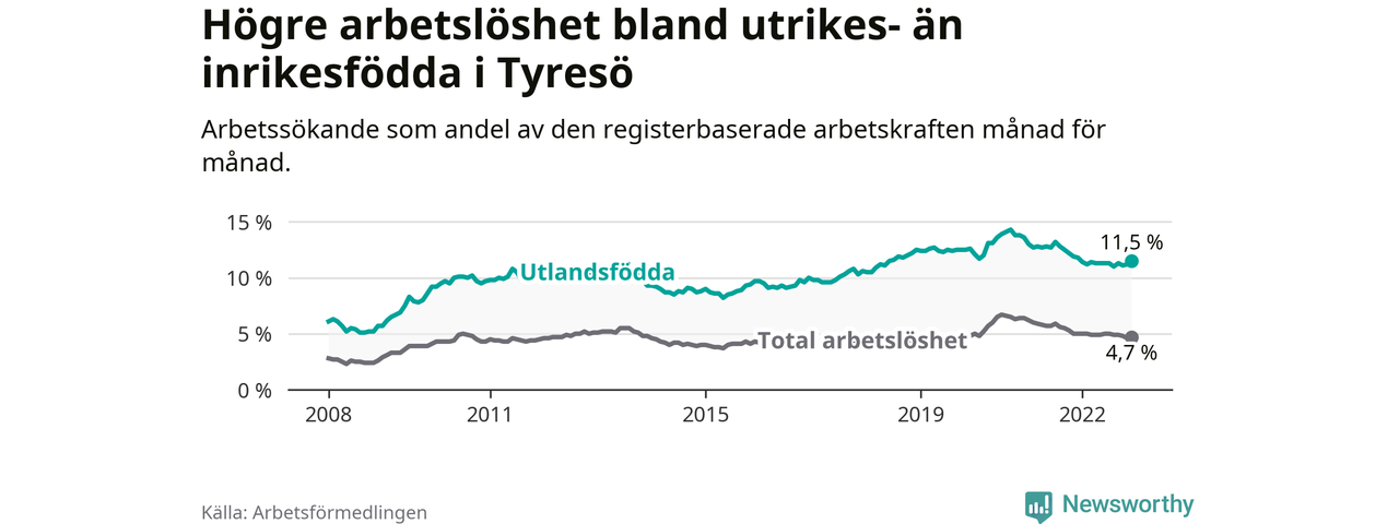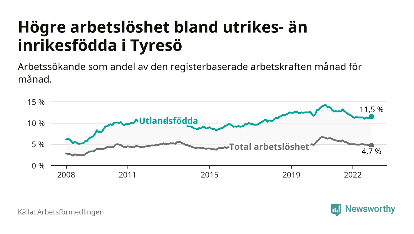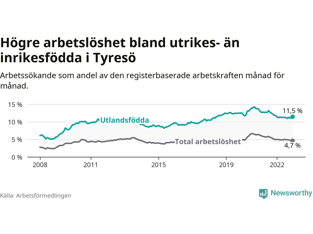 Arbetslösheten bland utlandsfödda var 11,5 procent i Tyresö under december månad, motsvarande 567 av 4 930 personer. Det är 0,3 procentenheter färre än vid samma tidpunkt i fjol (−5 om man räknar personer). Därmed är de utlandsföddas arbetslöshet lägre än vid samma tidpunkt i fjol för 21:a månaden i följd. Sedan mars 2021 har arbetslösheten bland utlandsfödda minskat från 12,8 till 11,5 procent.