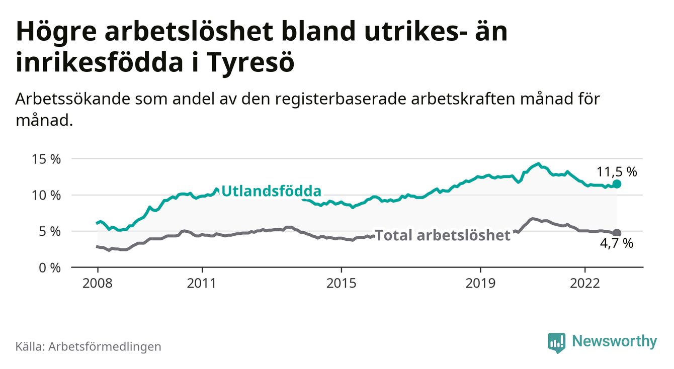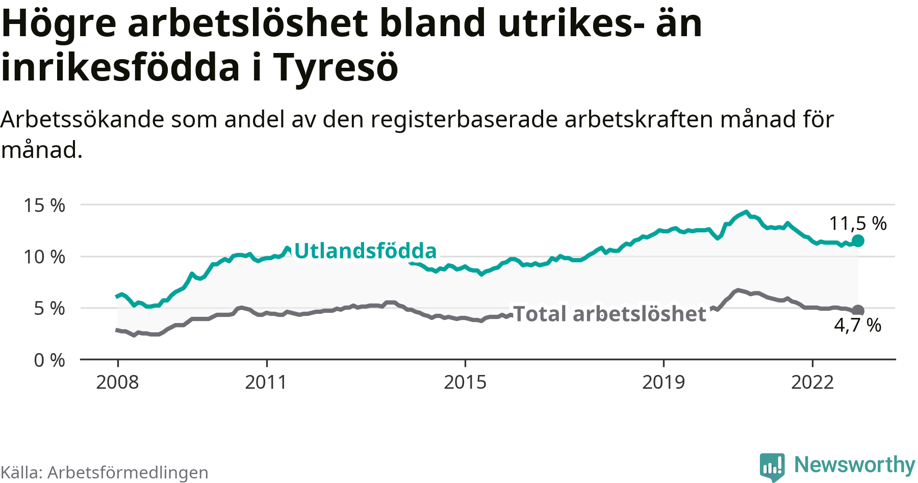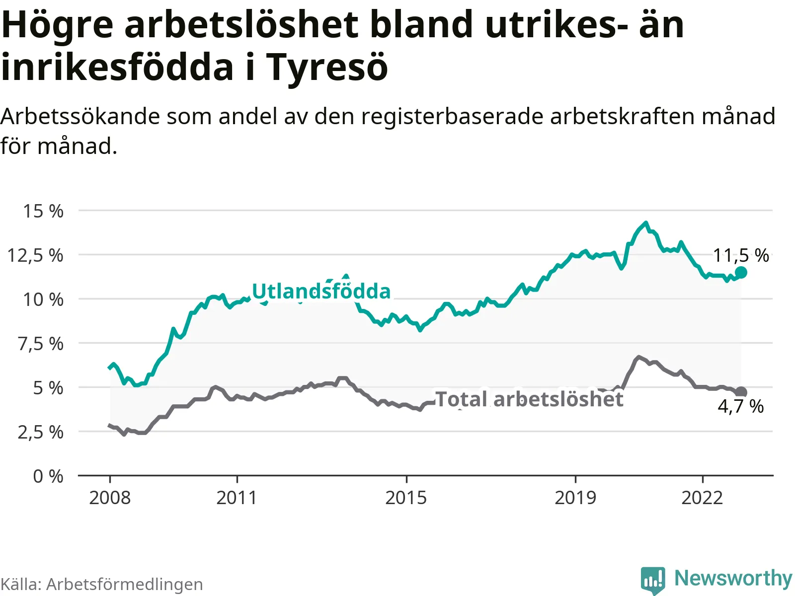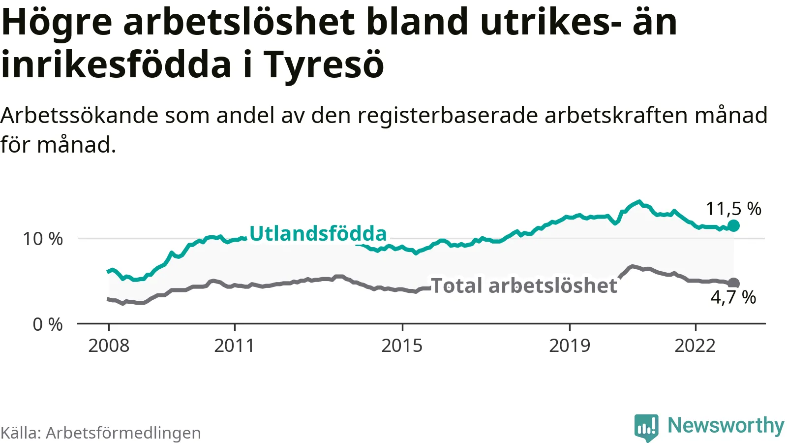 Arbetslösheten bland utlandsfödda var 11,5 procent i Tyresö under december månad, motsvarande 567 av 4 930 personer. Det är 0,3 procentenheter färre än vid samma tidpunkt i fjol (−5 om man räknar personer). Därmed är de utlandsföddas arbetslöshet lägre än vid samma tidpunkt i fjol för 21:a månaden i följd. Sedan mars 2021 har arbetslösheten bland utlandsfödda minskat från 12,8 till 11,5 procent.