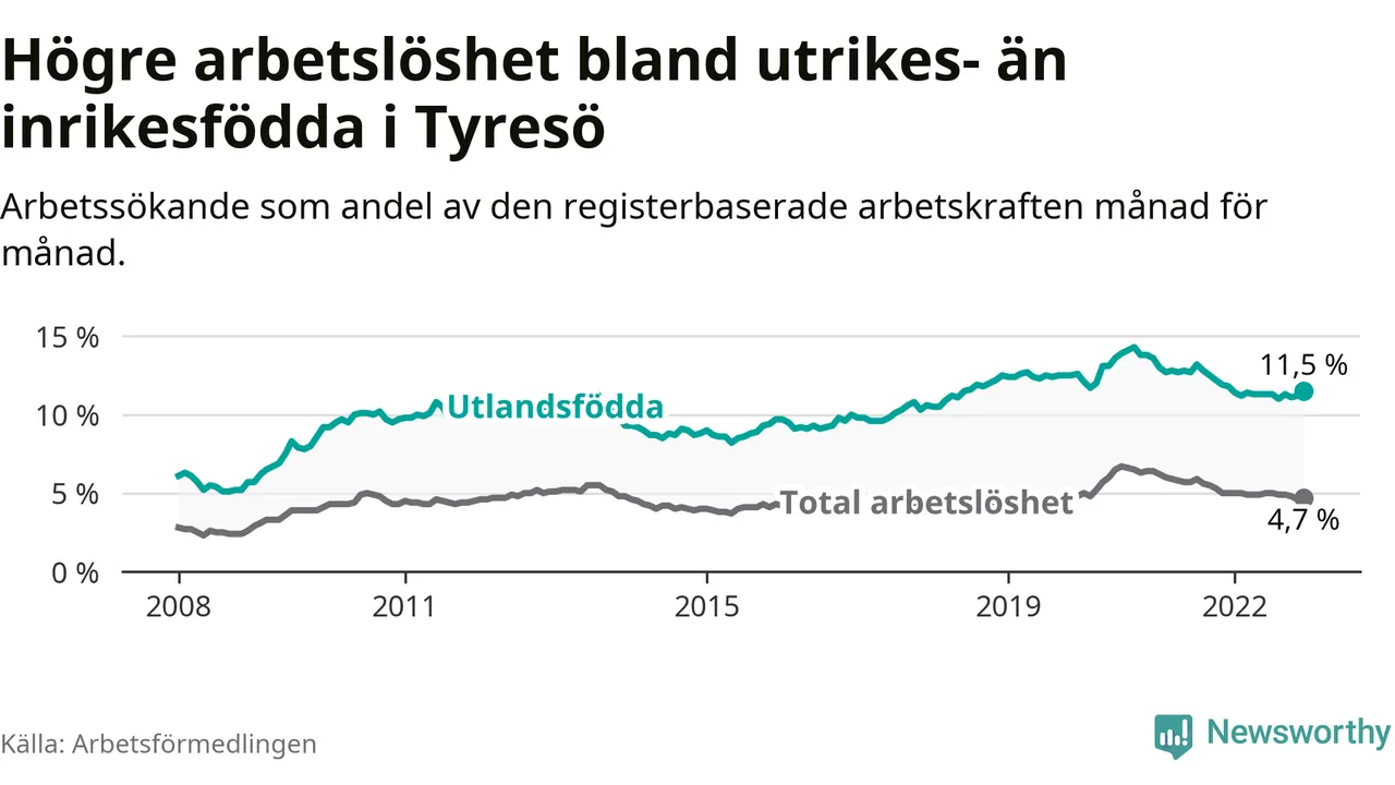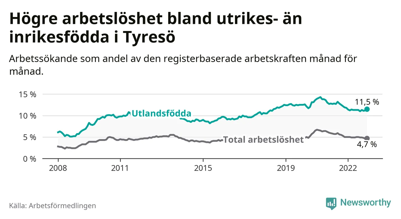 Skillnaden i arbetslöshet mellan utrikesfödda och hela befolkningen är 6,8 procentenheter i Tyresö. Det är ungefär samma skillnad som för ett år sedan.