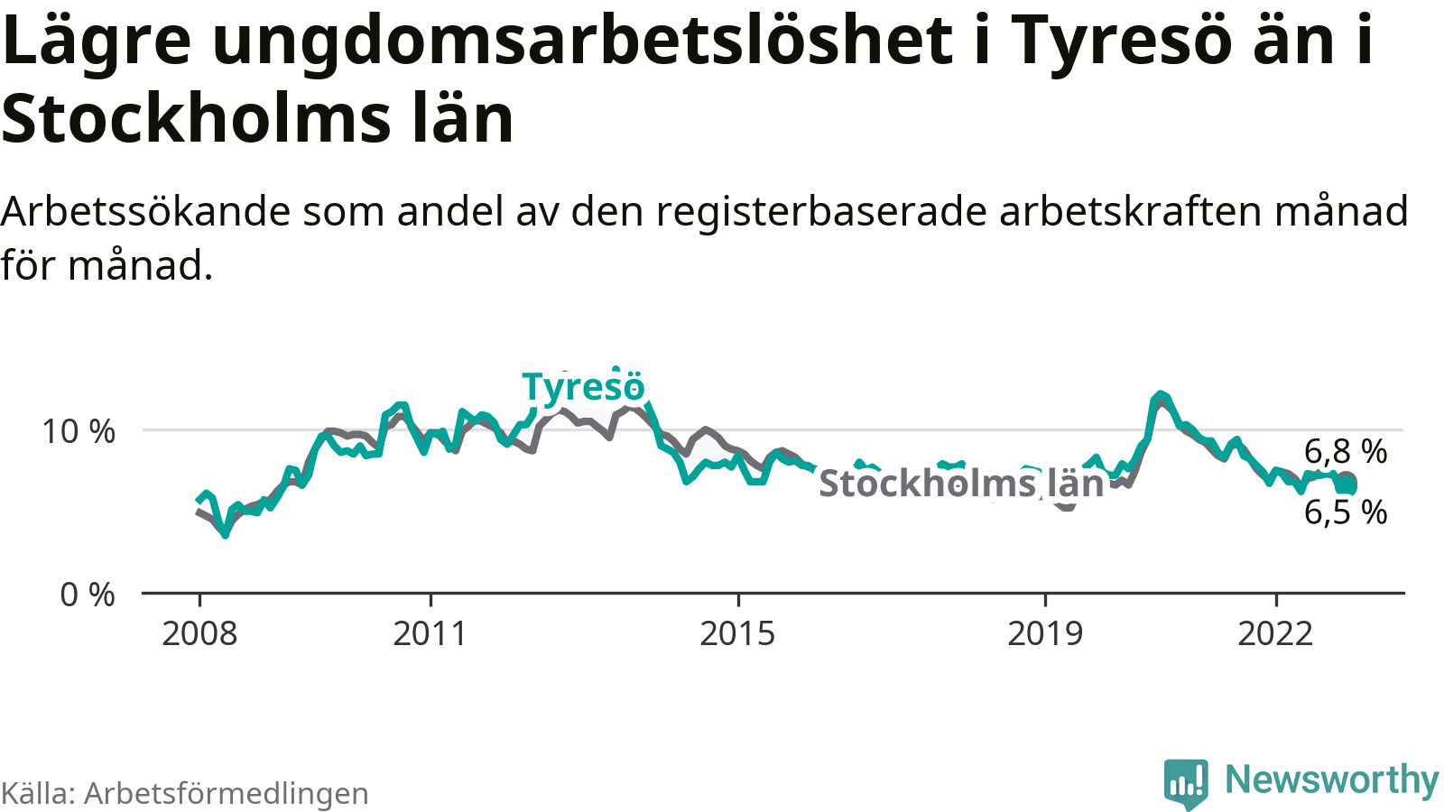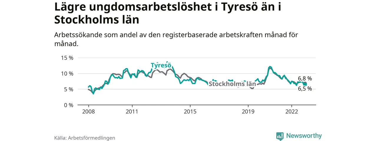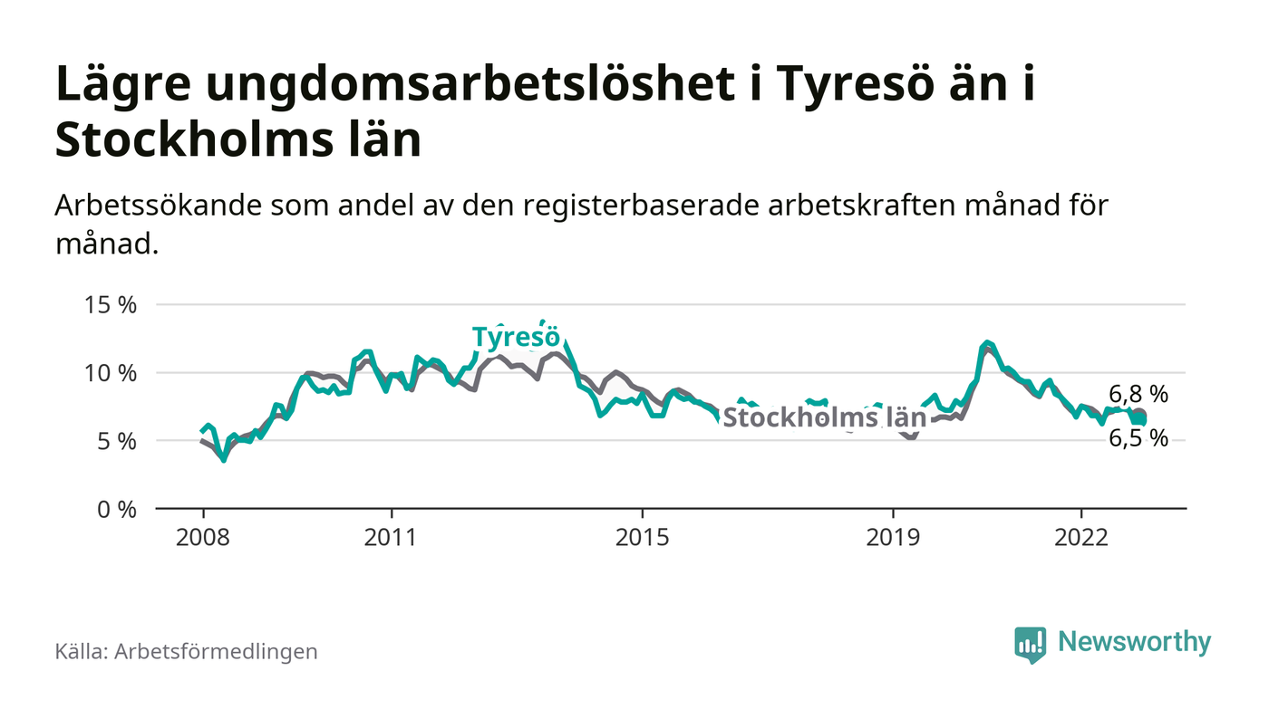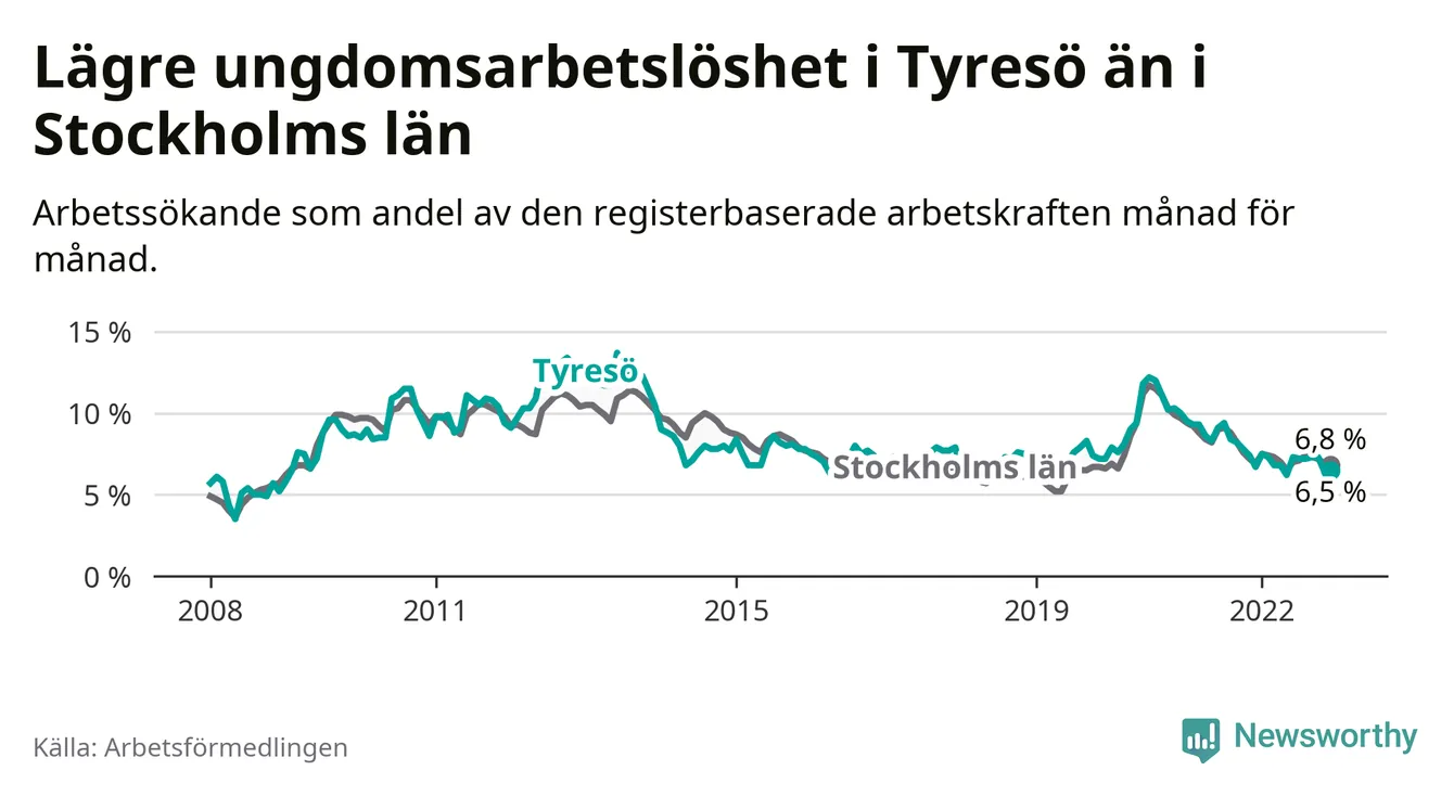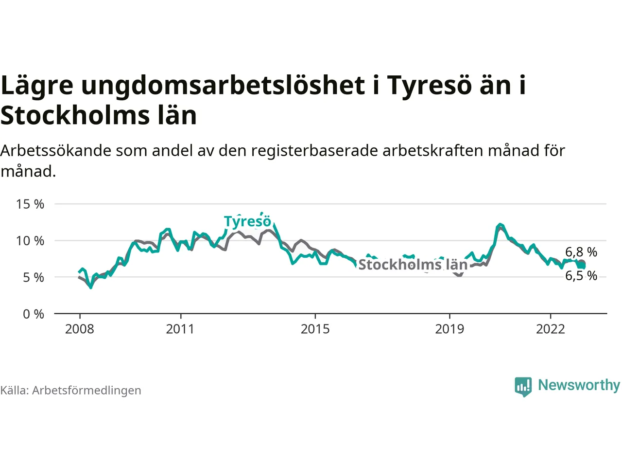 Precis som den totala arbetslösheten ligger ungdomsarbetslösheten i Tyresö lägre än i Stockholms län som helhet. Skillnaden mellan kommunen och länet är 0,3 procentenheter.