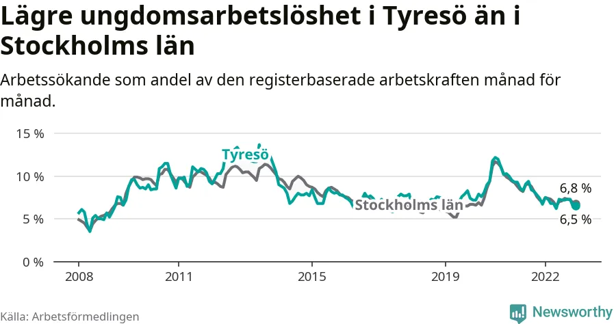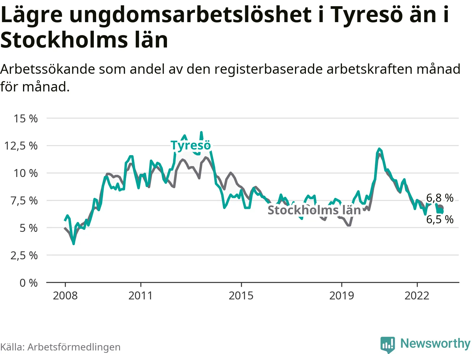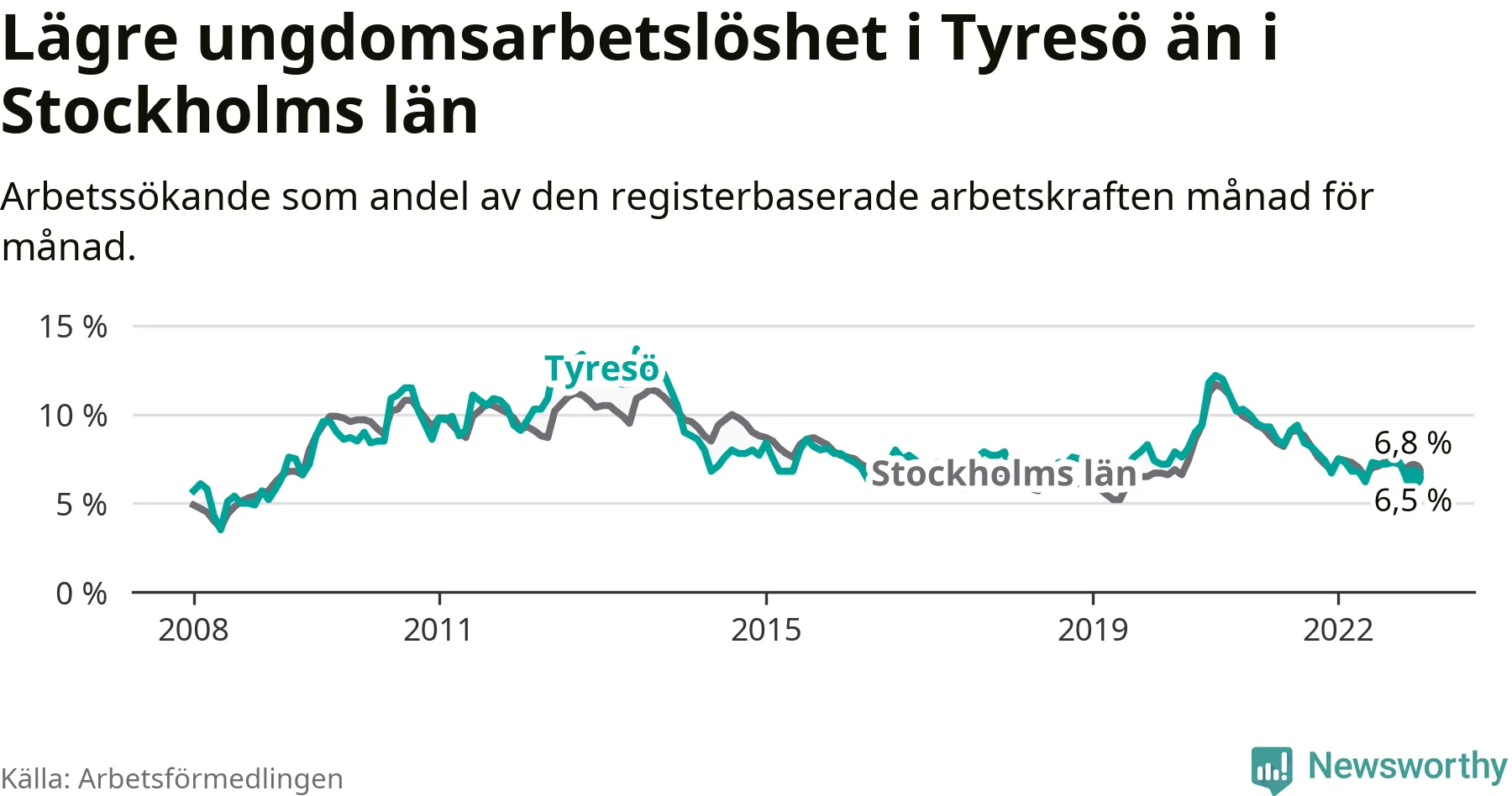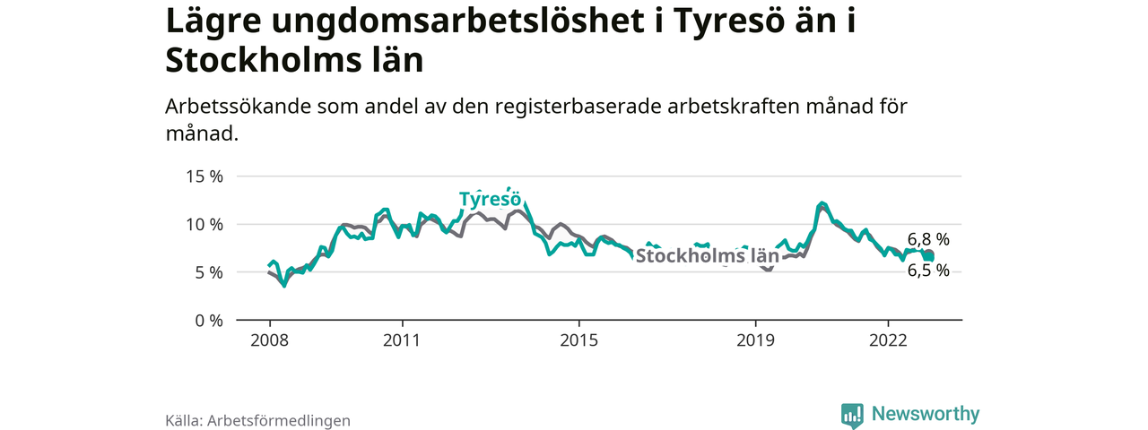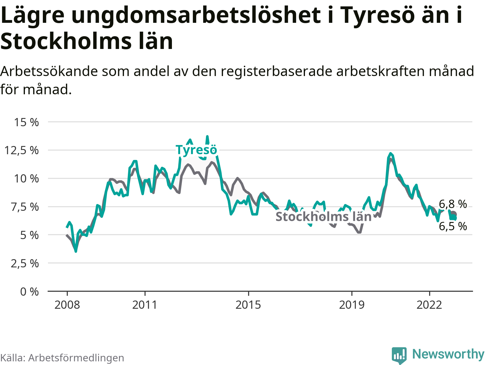 Precis som den totala arbetslösheten ligger ungdomsarbetslösheten i Tyresö lägre än i Stockholms län som helhet. Skillnaden mellan kommunen och länet är 0,3 procentenheter.