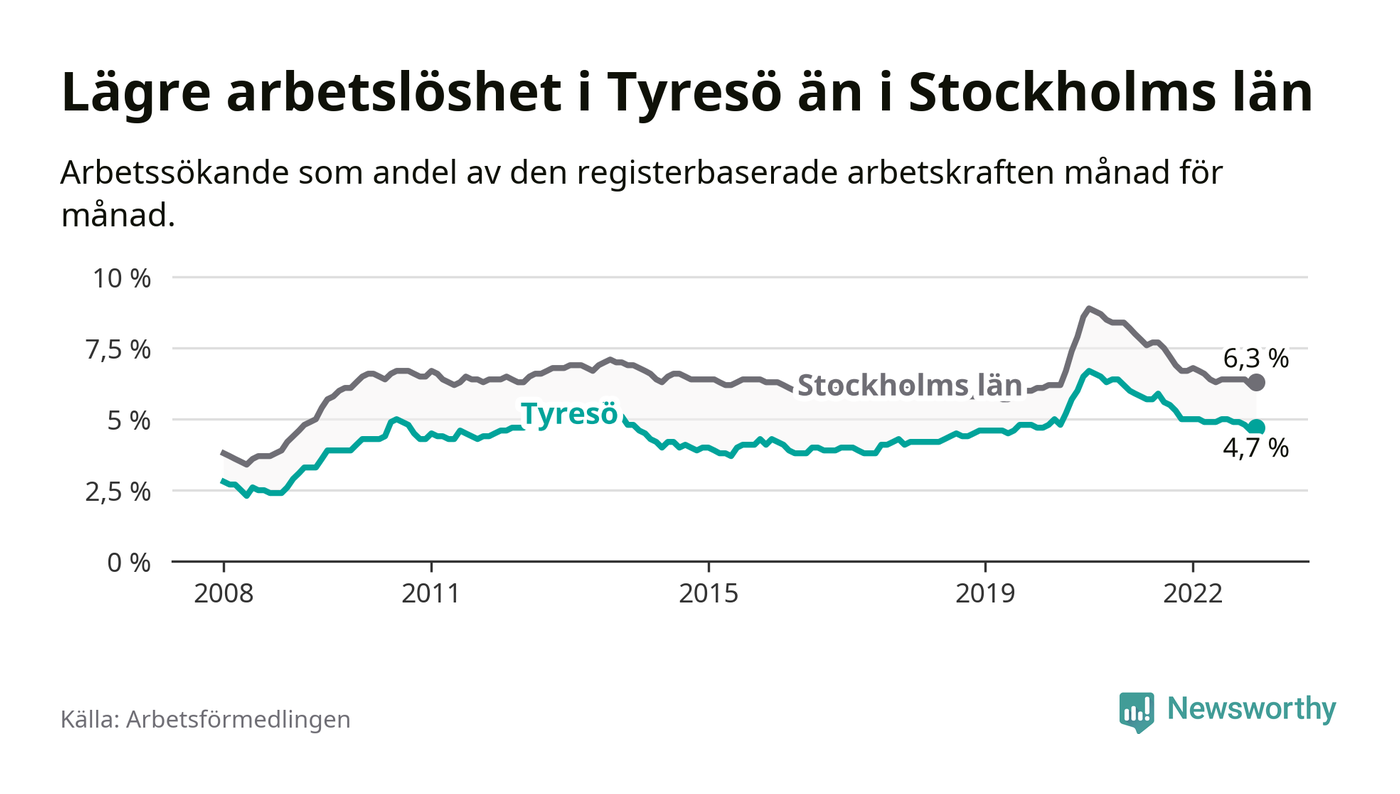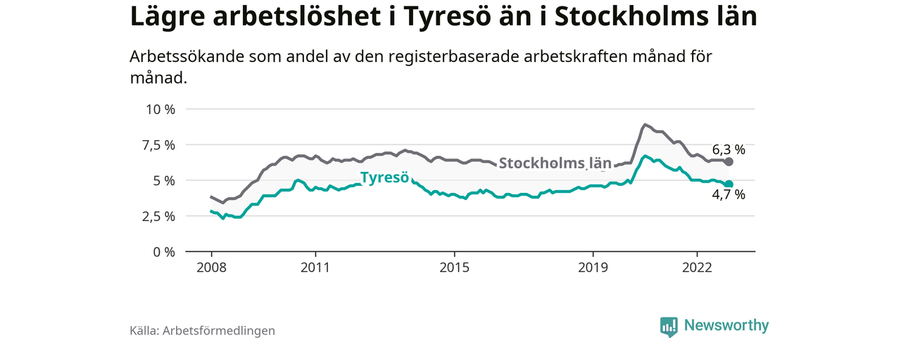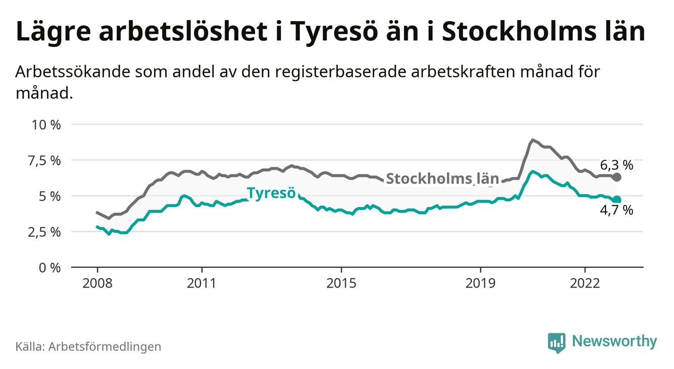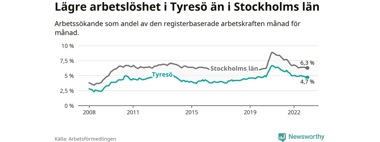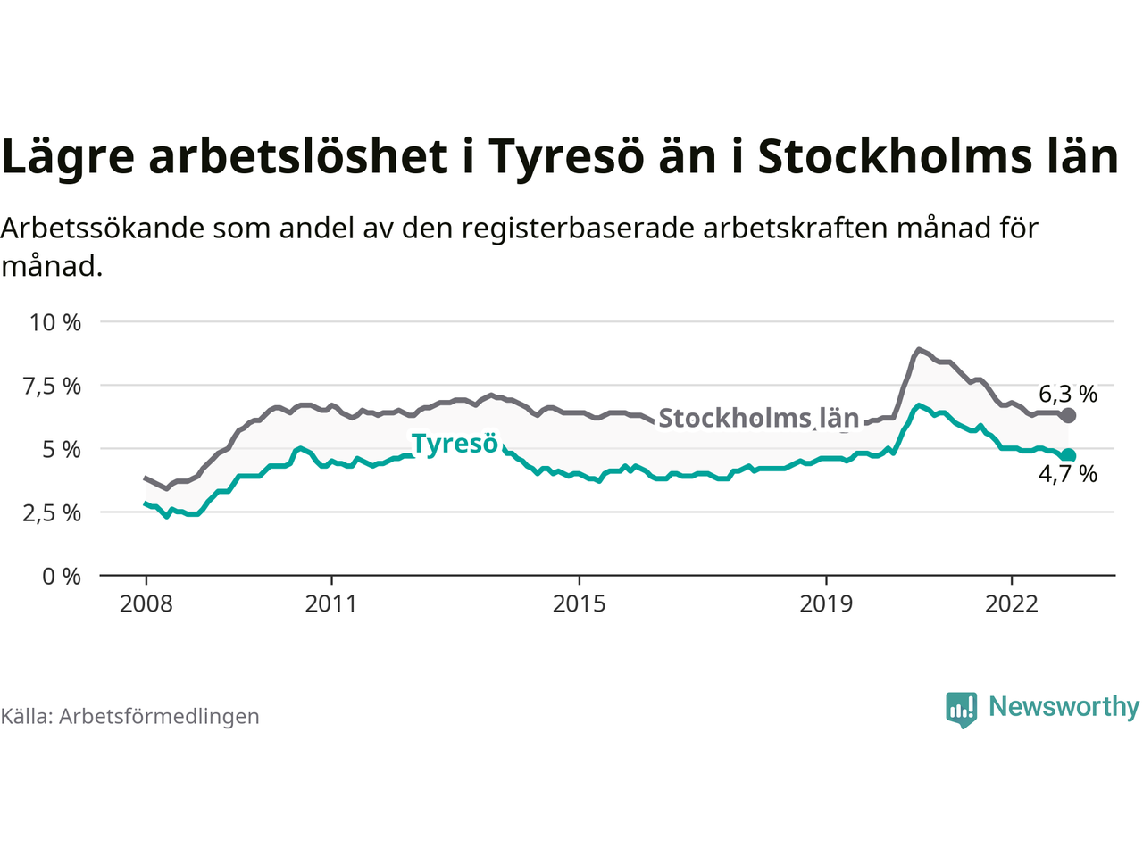 Tyresö hade redan tidigare lägre arbetslöshet än snittet i hela Stockholms län och nu växer klyftan (4,7 procent i kommunen, jämfört med 6,3 procent i hela länet). Ekerö och Vaxholm har den lägsta arbetslösheten i länet (3,2 procent), medan Botkyrka har den högsta (11,1 procent). För att Tyresö skulle komma ner i samma arbetslöshetsnivå som Ekerö och Vaxholm skulle 365 personer behöva sysselsättas.