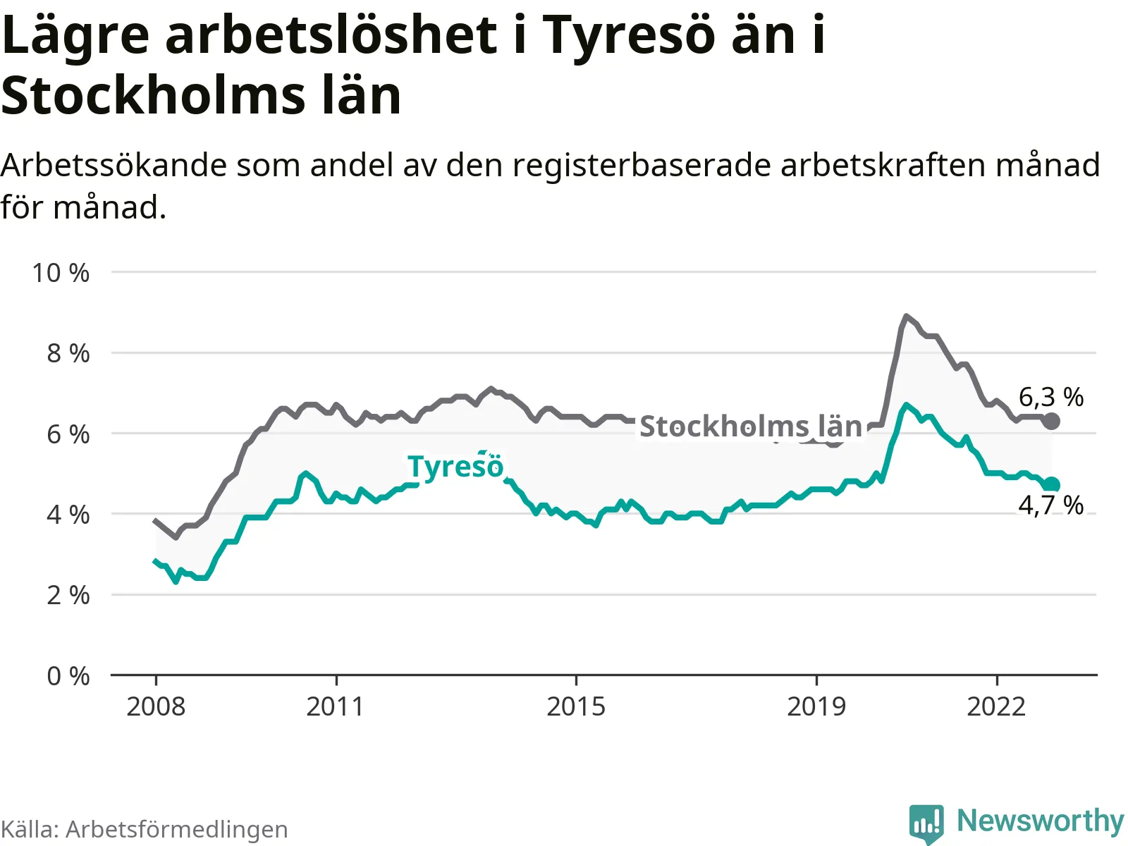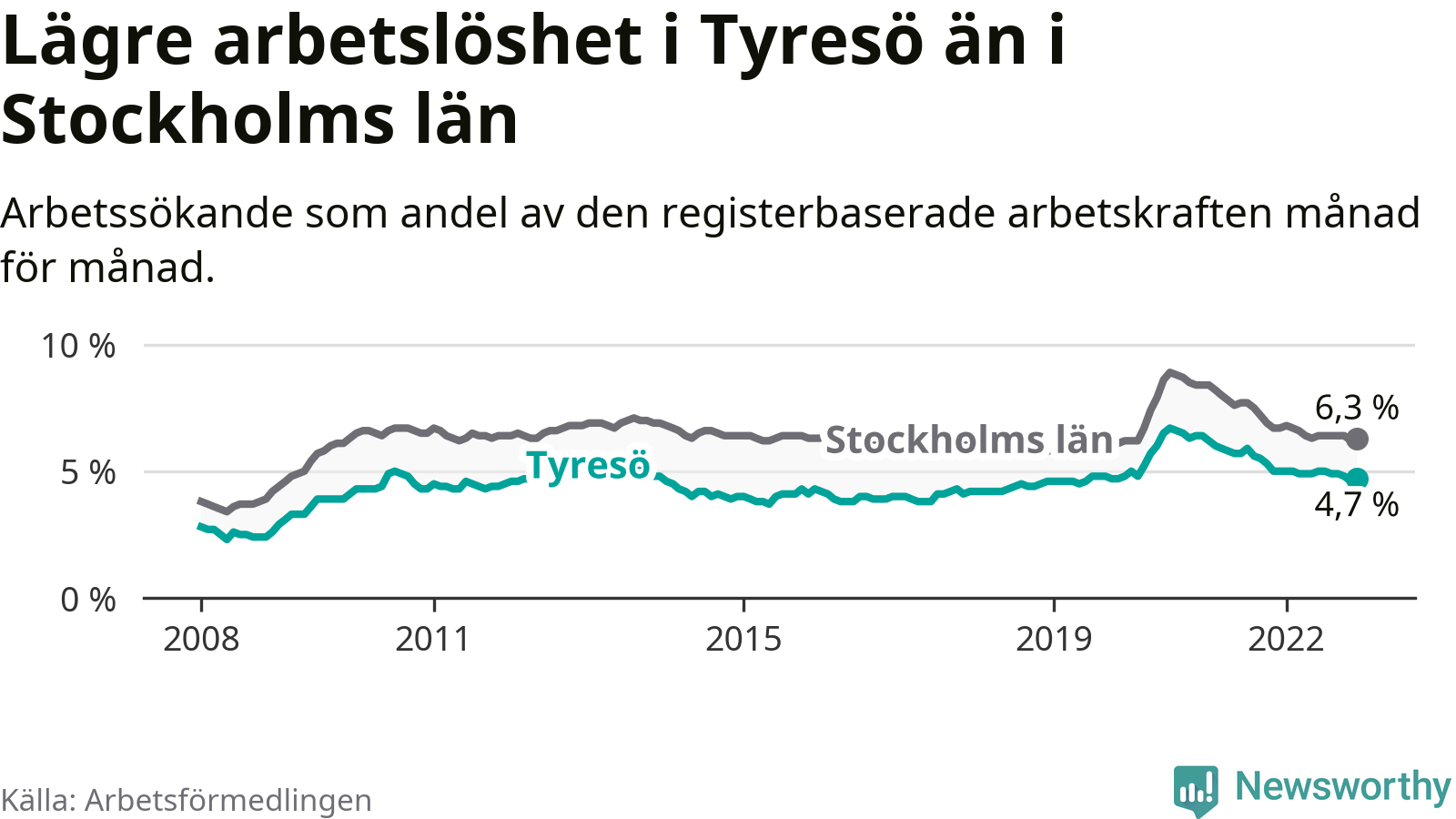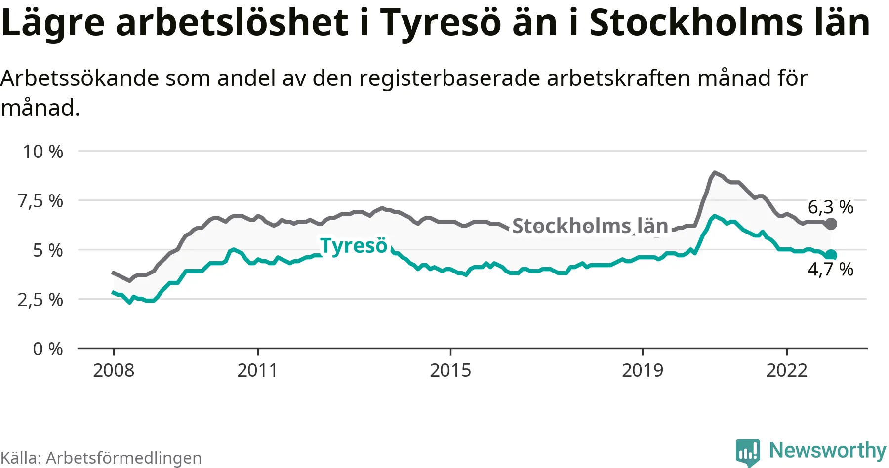 Tyresö hade redan tidigare lägre arbetslöshet än snittet i hela Stockholms län och nu växer klyftan (4,7 procent i kommunen, jämfört med 6,3 procent i hela länet). Ekerö och Vaxholm har den lägsta arbetslösheten i länet (3,2 procent), medan Botkyrka har den högsta (11,1 procent). För att Tyresö skulle komma ner i samma arbetslöshetsnivå som Ekerö och Vaxholm skulle 365 personer behöva sysselsättas.