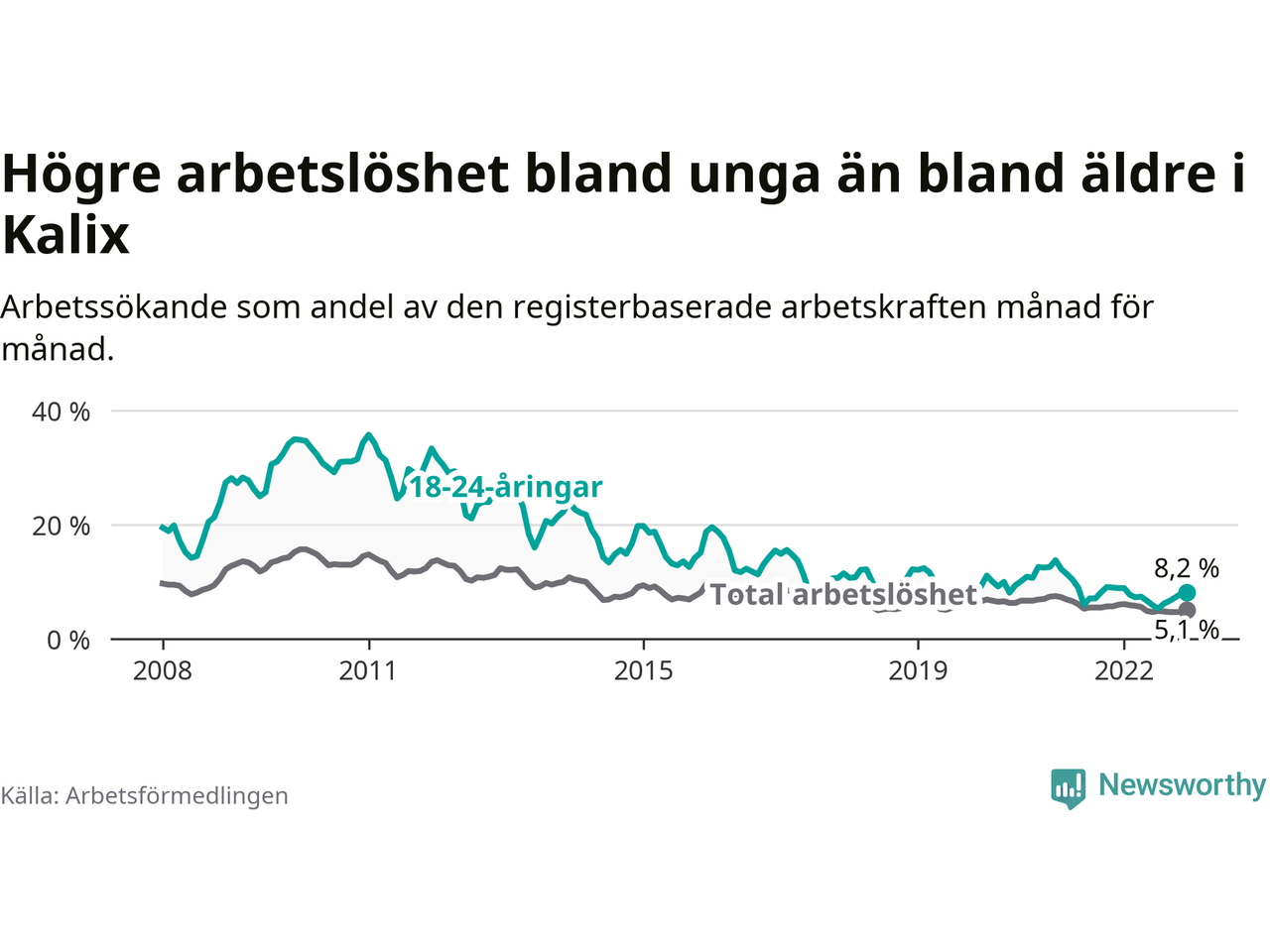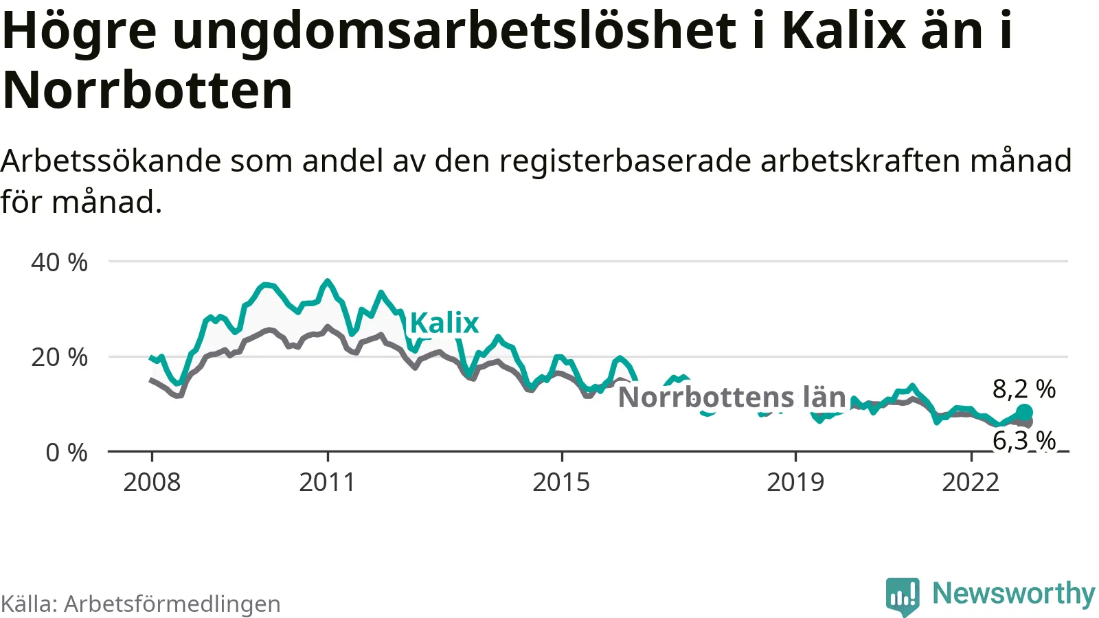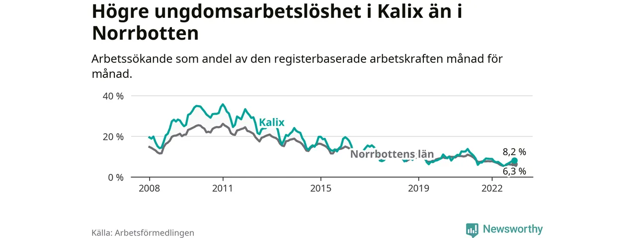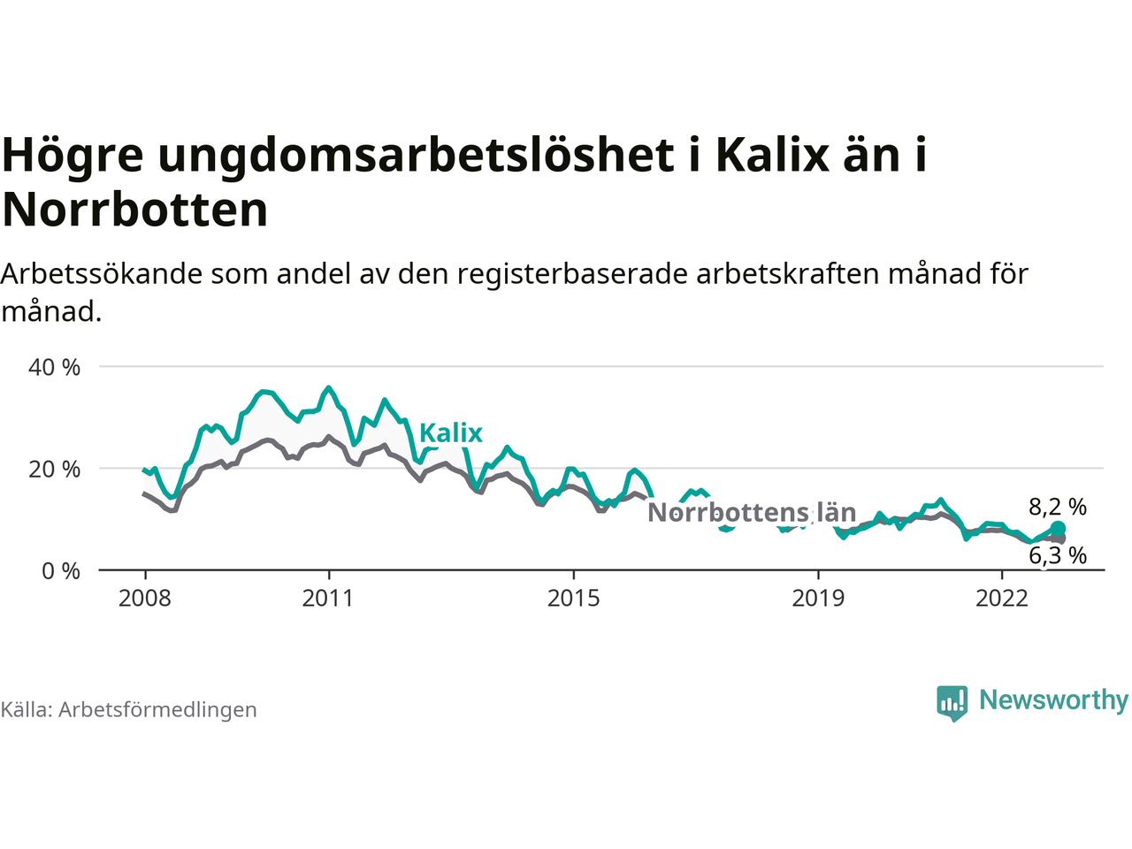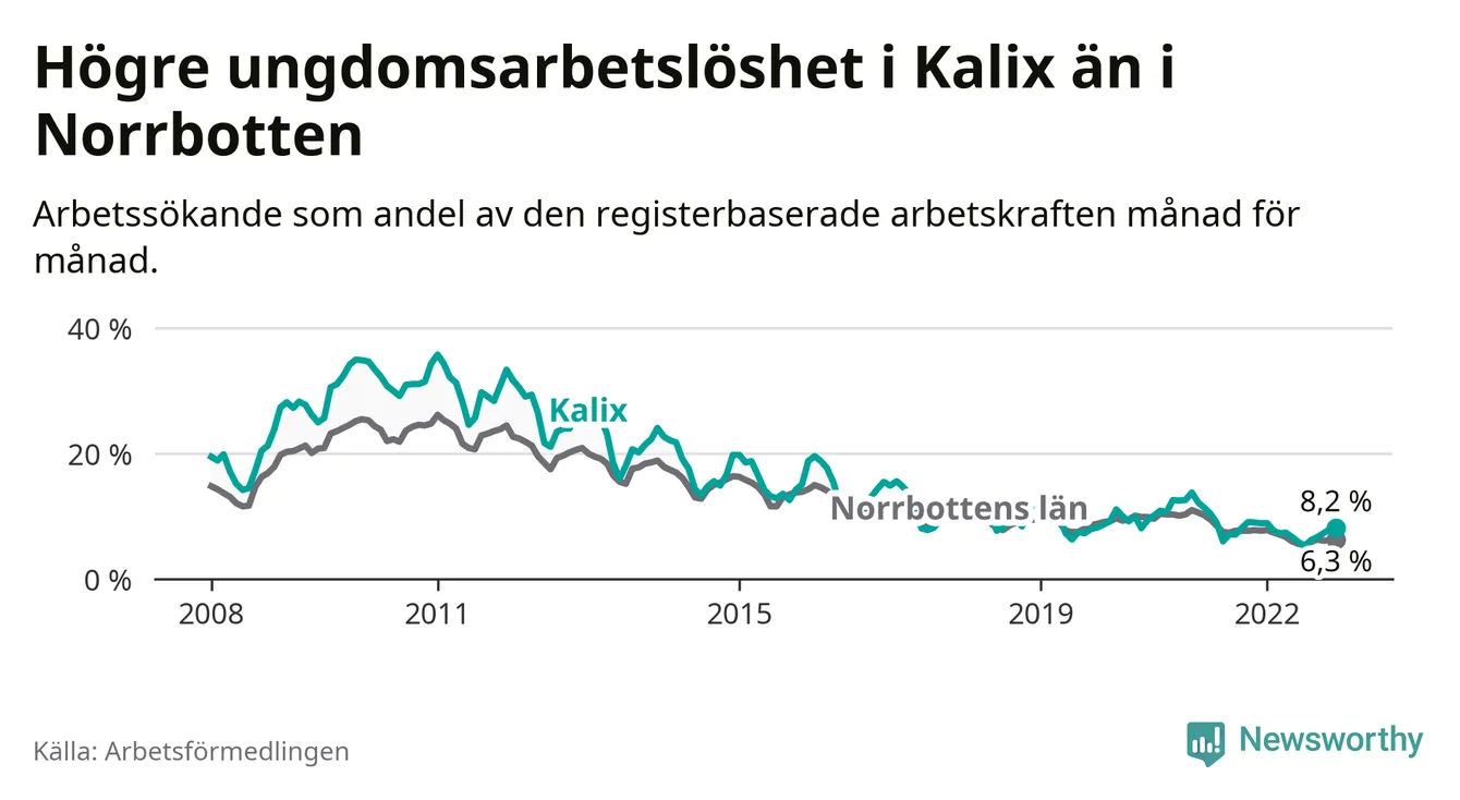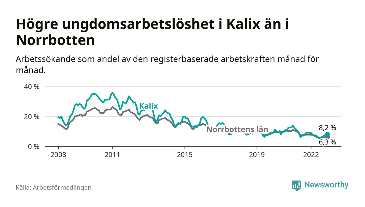 Precis som den totala arbetslösheten ligger ungdomsarbetslösheten i Kalix högre än i Norrbotten som helhet. Skillnaden mellan kommunen och länet är 1,9 procentenheter.